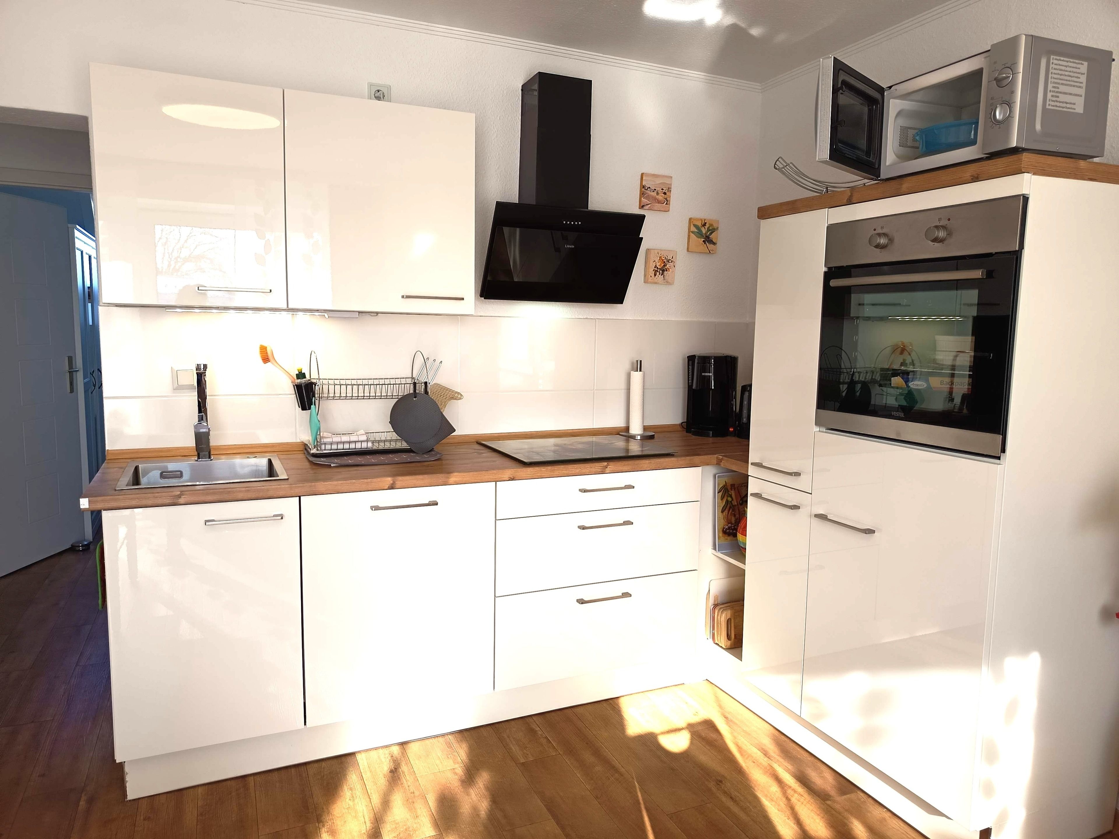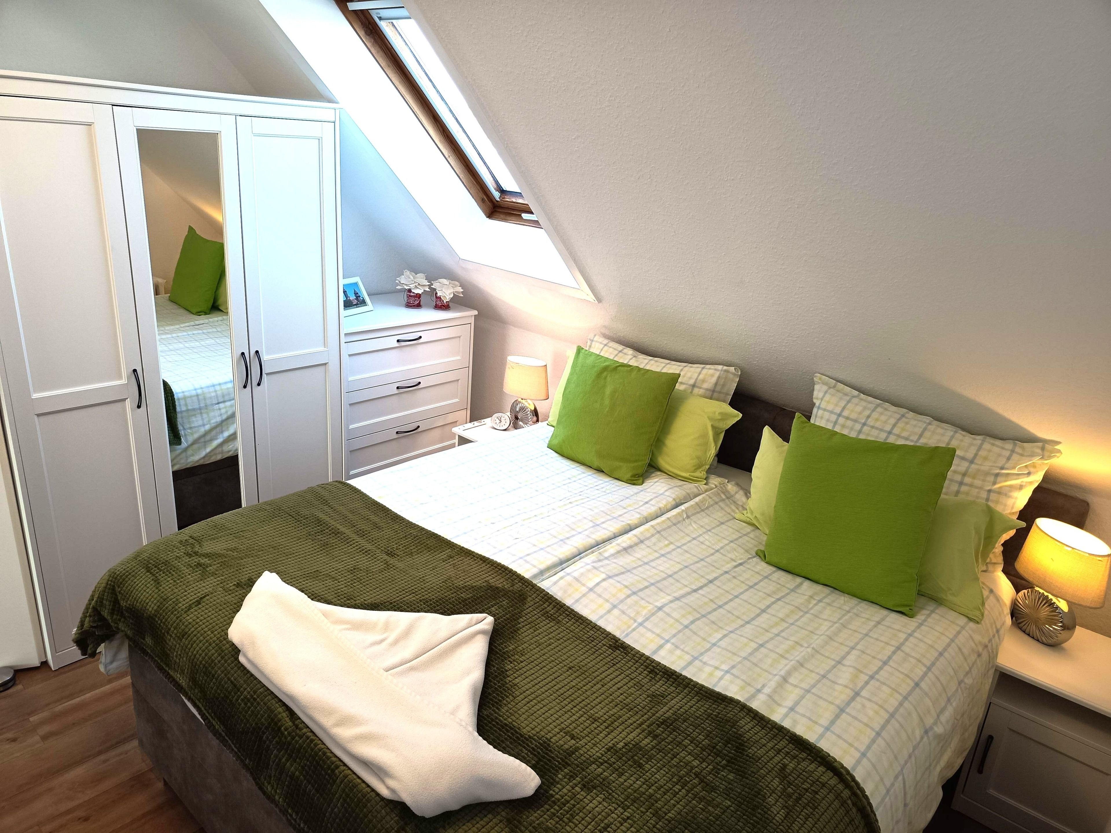 Die Ferienwohnung Nr. 2 Seestern befindet sich in der 1. Etage und bietet genügend Raum, um sich wohl zu fühlen. Das Schlafzimmer mit Doppelbett , einem kleinem Bad, sowie eine kleine Diele und das geräumige Wohn-/Esszimmer mit Einbauküche sind mit viel Liebe zum Detail eingerichtet. Von Ihrem Balkon aus bietet sich einen schöner Blick zum gepflegten Garten. Diesen können Sie auch zum verweilen gerne nutzen. Das Schlafzimmer mit Doppelbett bietet ein komfortables schlafen. Dazu dienen gute Bandscheibenmatratzen und eine große Anzahl an Kopfkissen und Zudecken. Das Wohn- /Esszimmer mit Küchenzeile bietet einen Glaskeramik- Herd, eine Spülmaschine, einen Kühlschrank mit Gefrierfach, Mikrowelle und allen notwendigen Elektrogeräten sowie einer großzügigen Haushaltsbestückung. Ein kleines Starterpaket an Hygieneartikel und Reinigungsmittel stehen für Sie bereit.