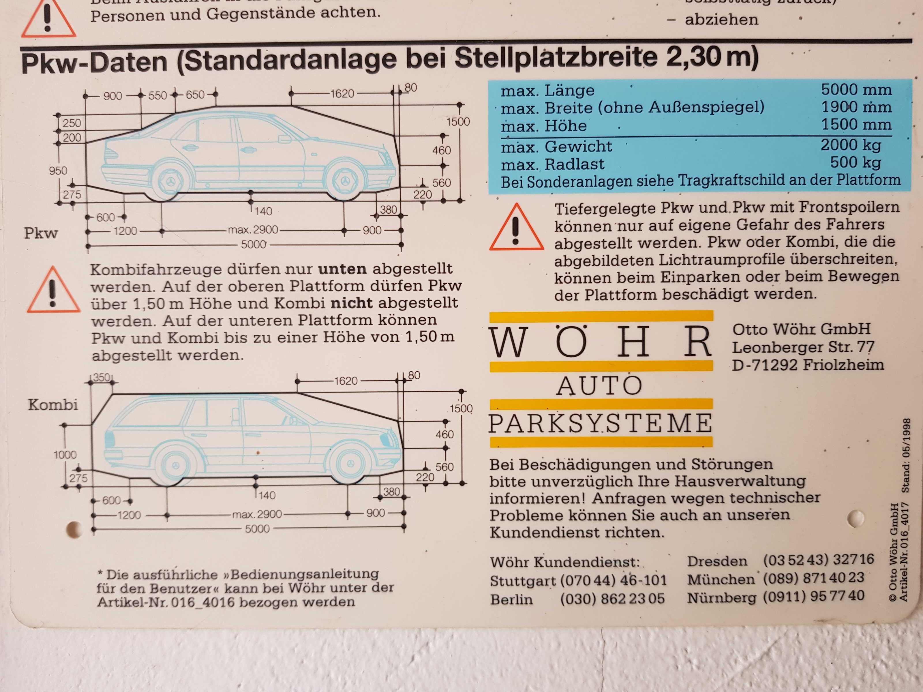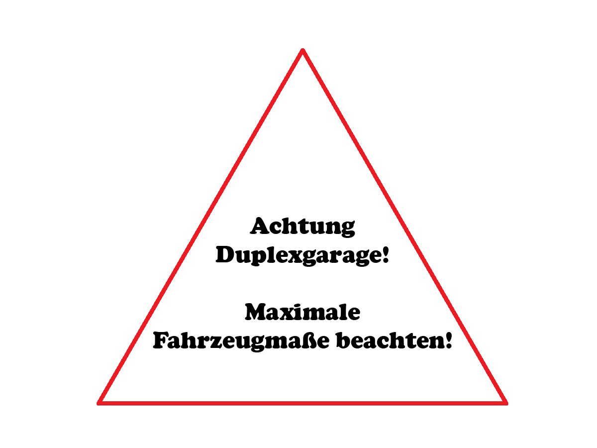 Achtung Duplexgarage Nr. 9 (s. Fotos): Bitte beachten Sie, dass Ihr Fahrzeug maximal folgende Maße haben darf: Höhe: 1,50 m, Breite: 1,90 m, Länge: 5,00 m. Kombis passen generell nicht in die Garage.