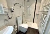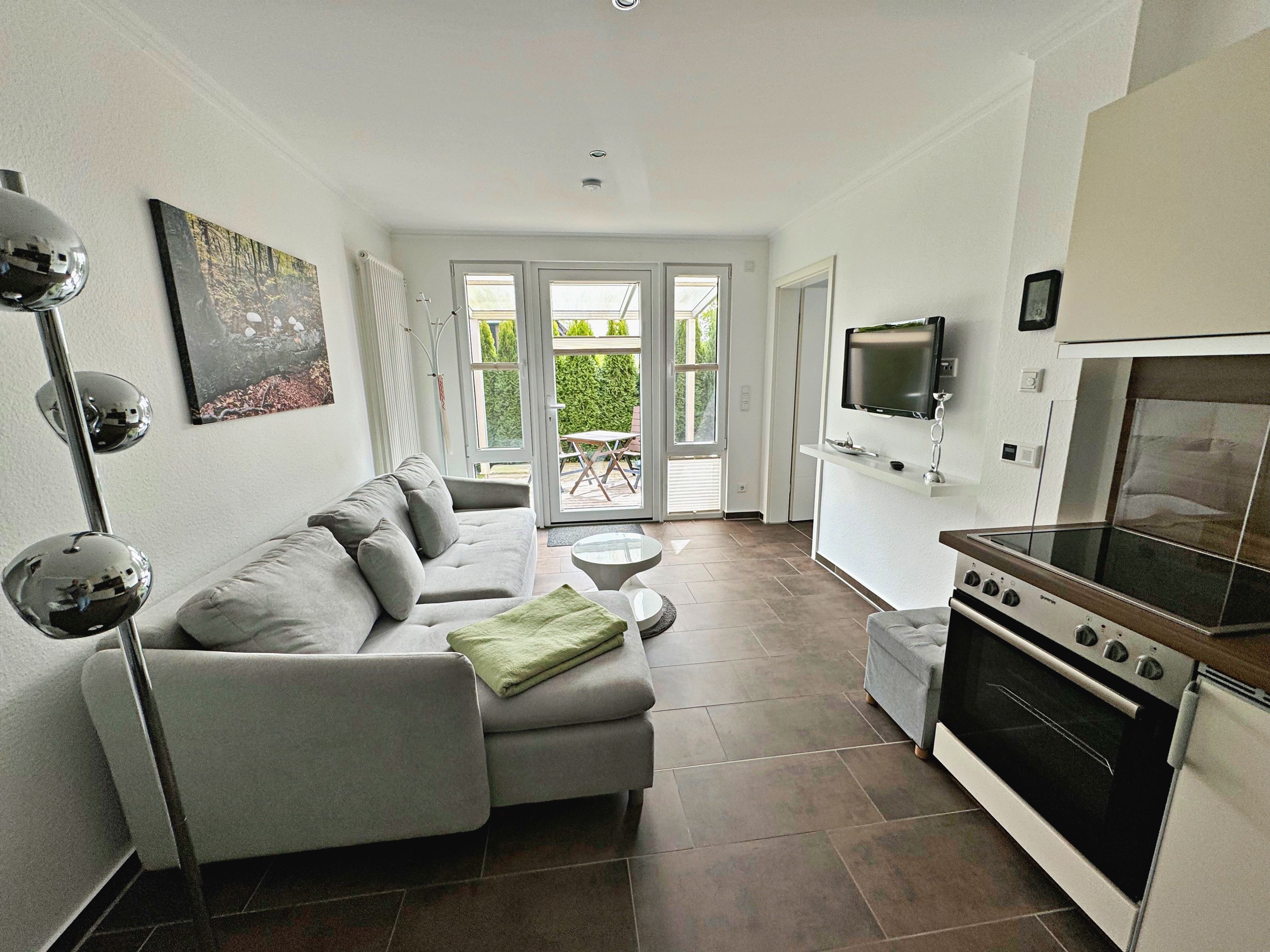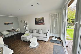 Hell, modern und freundlich - diese charmante Nichtraucher-Ferienwohnung bietet mit 30 qm ein schönes Zuhause auf Zeit für 2 Personen. Der hübsche Wohnbereich verfügt über eine bequeme Couch und Flachbild-TV. Die offene Küchenzeile mit Ceranherd, Backofen, Mikrowelle und Kühlschrank und der Essplatz für 2 Personen lässt keine Wünsche offen. Vom Wohnbereich aus gelangen Sie auf die Terrasse - ideal, um bei schönem Wetter den ersten Kaffee am Morgen zu genießen oder um den erlebnisreichen Urlaubstag ausklingen zu lassen. Das Schlafzimmer ist mit einem Doppelbett, Kleiderschrank und einem zweiten Flachbild-TV ausgestattet. Das Badezimmer mit ebenerdiger Dusche, WC und Fön rundet den Komfort der Wohnung ab.