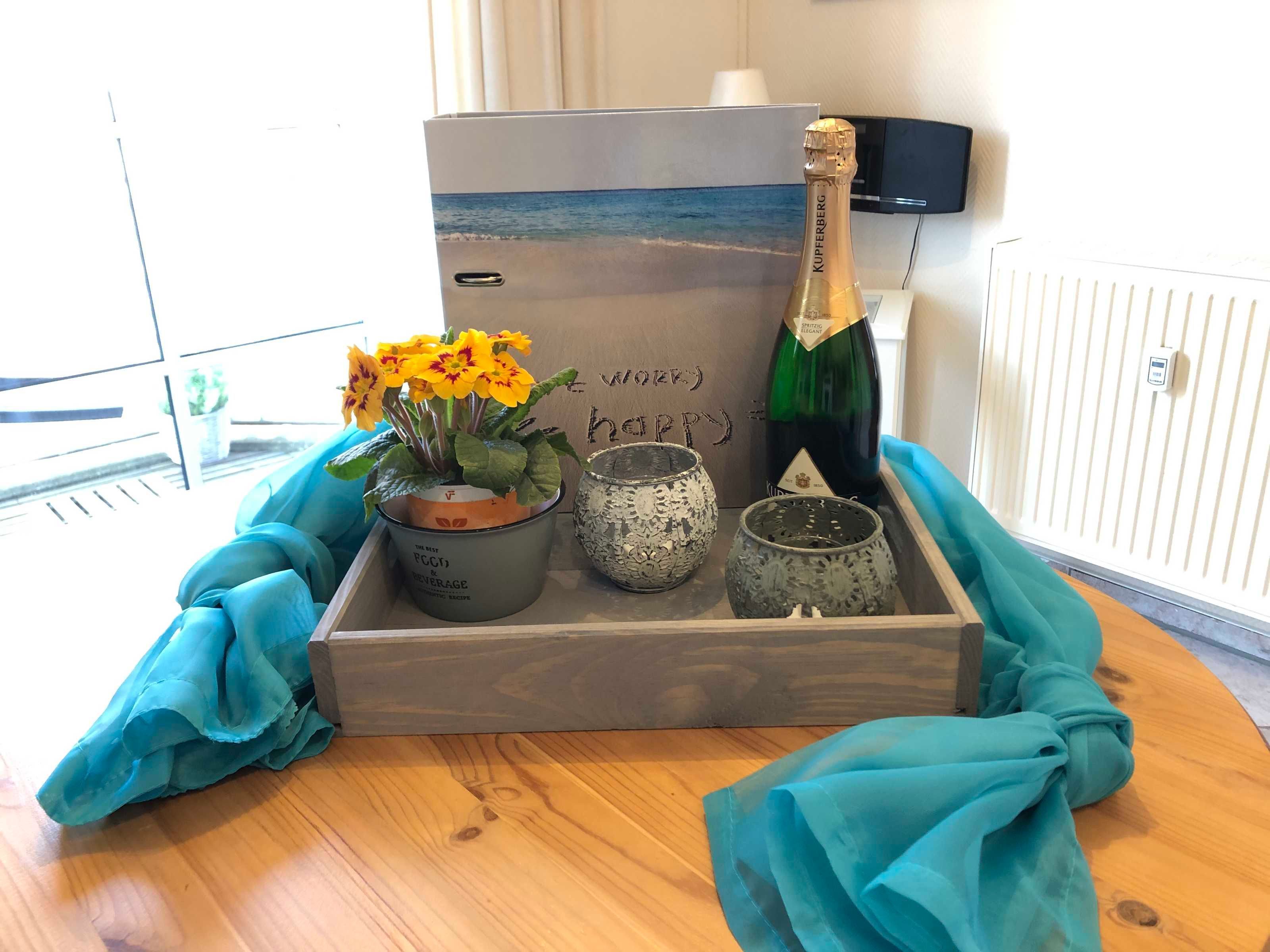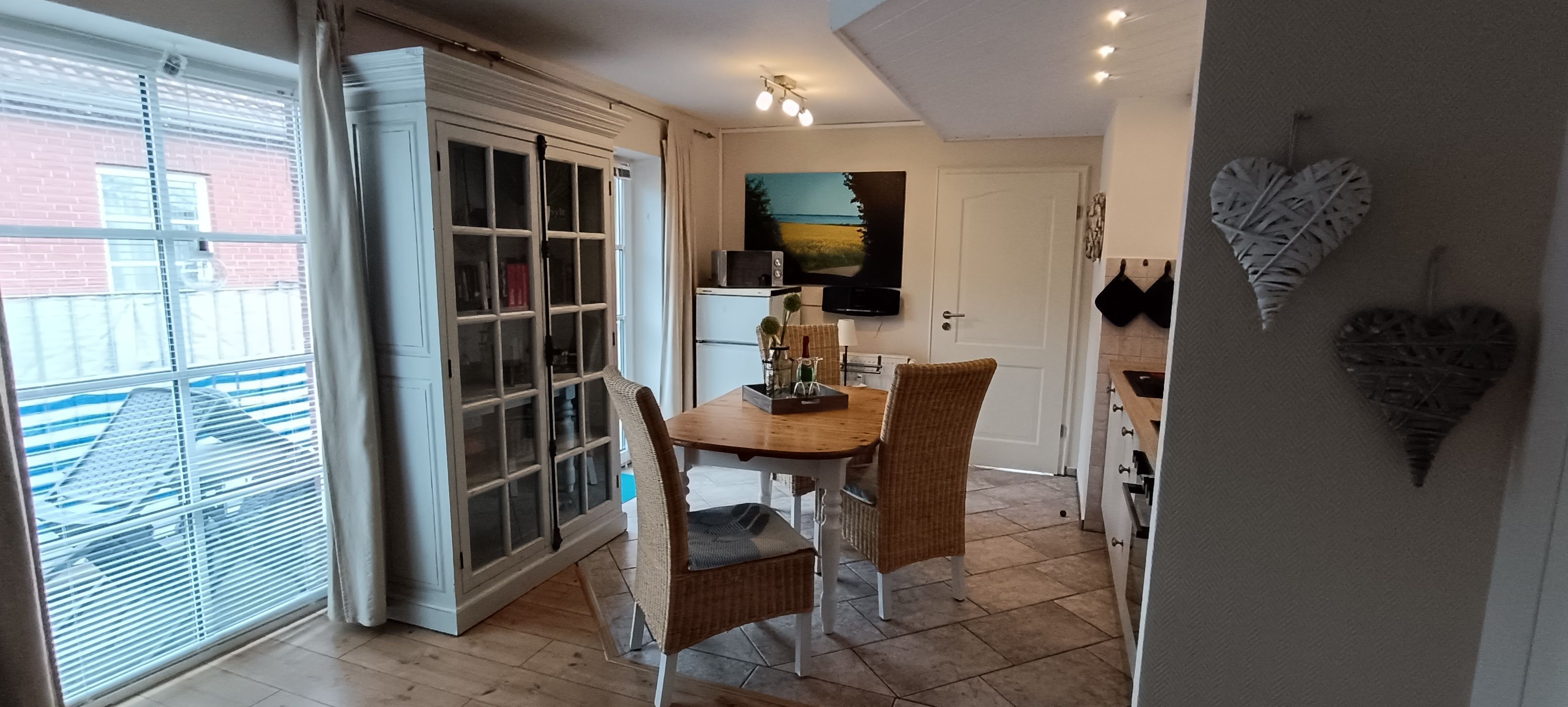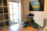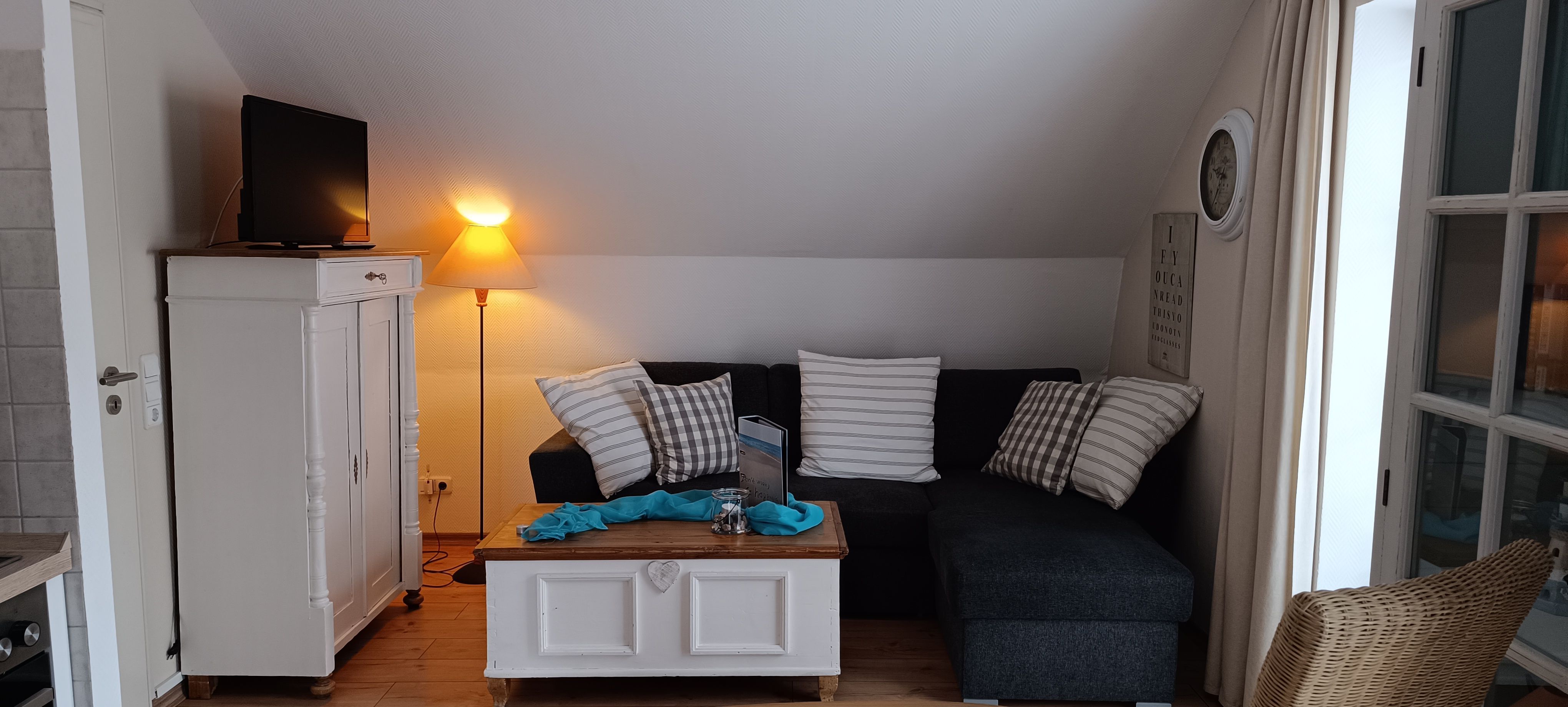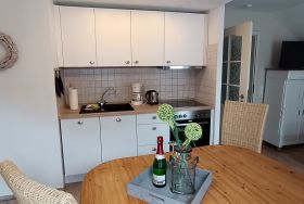 Die Ferienwohnung kum rin liegt in der 1. Etage eines Mehrappartementhauses und verfügt über 40m² Wohnfläche für max. 3 Personen, aufgeteilt in: Wohnzimmer mit gemütlicher Schlafcouch und Essbereich, Schlafzimmer mit Doppelbett (180x200 cm, einteilige Matratze), Küchenzeile im Wohnbereich, Duschbad/WC, Balkon zur Westseite mit Markise, WLAN, reservierter PKW-Stellplatz, reservierter, fester Fahrradbügel.
