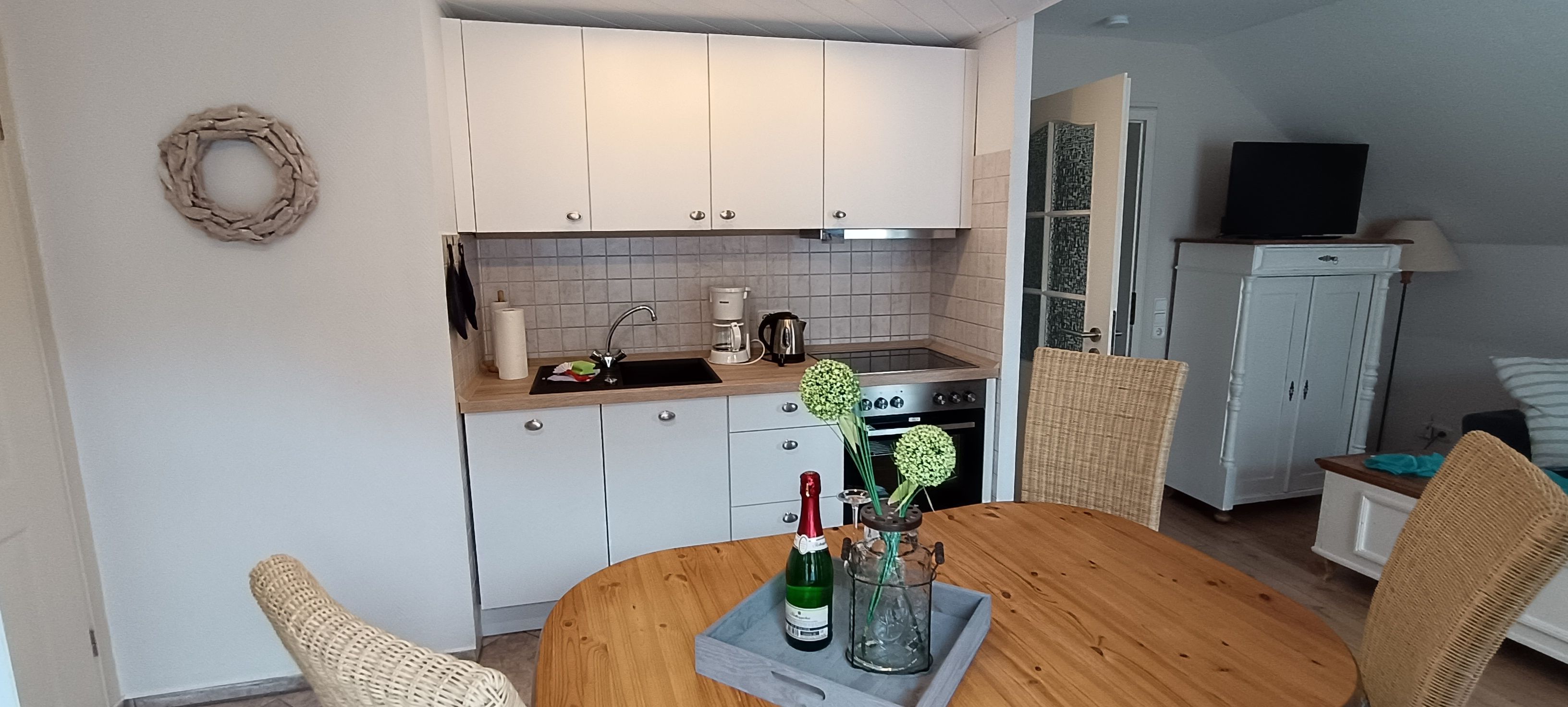 Die helle, neu renovierte und gemütliche Ferienwohnung kum rin befindet sich in der 1. Etage eines Mehrappartementhauses und bietet ca. 40 m² Wohnfläche für max. 3 Personen. Sie verfügt über einen Wohnbereich mit gemütlicher Schlafcouch und einem Sessel, Essbereich und Flachbild-TV, ein Schlafzimmer mit Doppelbett und zusätzlichem Flachbild-TV, eine Küchenzeile im Wohnbereich mit Glaskeramik-Kochfeld, Backofen, Spülmaschine, Mikrowelle, großem Kühlschrank, Kaffeemaschine und Wasserkocher. Ein Duschbad mit WC rundet das Angebot ab. Vom Wohnzimmer aus haben Sie Zugang zum möblierten Balkon mit Markise. Es gibt einen kostenfreien WLAN-Zugang, einen reservierten PKW-Stellplatz sowie einen reservierten, festen Fahrradbügel. Die Ferienwohnung befindet sich in einer Seitenstraße in der Nähe der Reha-Klinik Schloss Schönhagen und fußläufig zum Ostseestrand.
