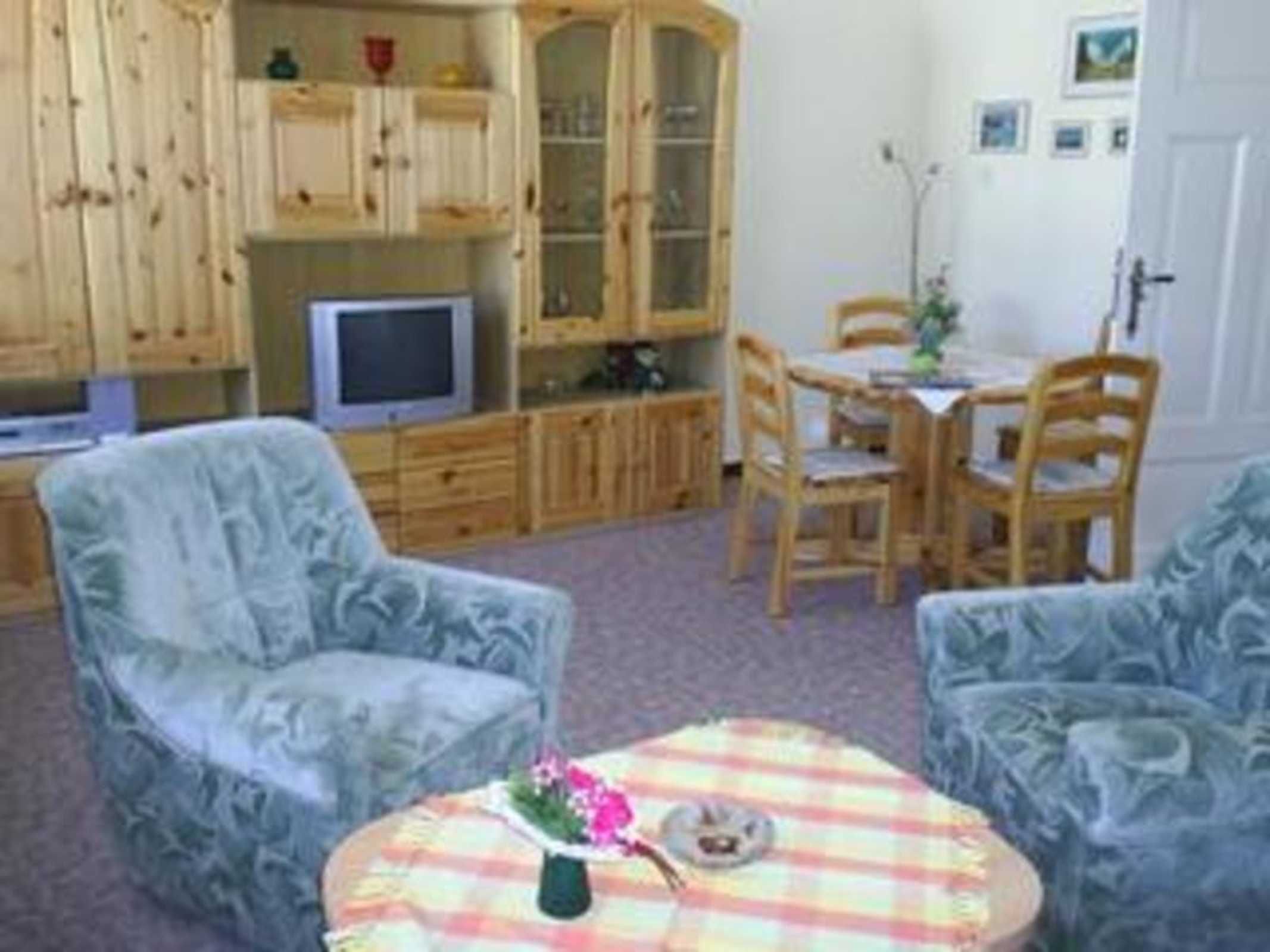 Zur anderen Seite des Flurs befindet sich das Wohnzimmer mit Sitzecke, Schrankwand, Eßtisch und Stühle für 2 Personen, SAT-TV, Musikanlage. Vom Wohnzimmer aus gelangen Sie in das Schlafzimmer mit komfortablem Doppelbett, Kleiderschrank. Die Ferienwohnung ist modern, hell und freundlich eingerichtet.