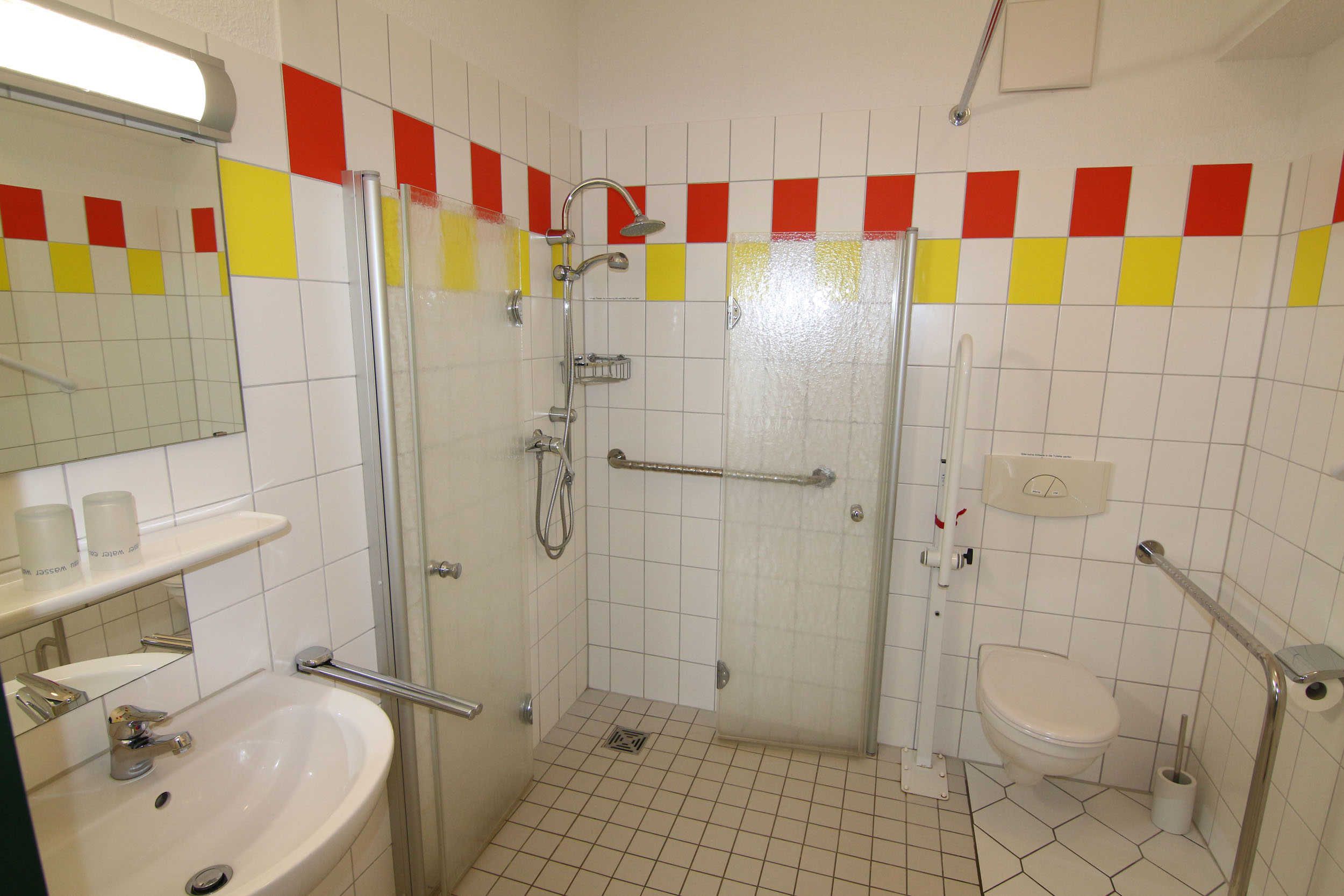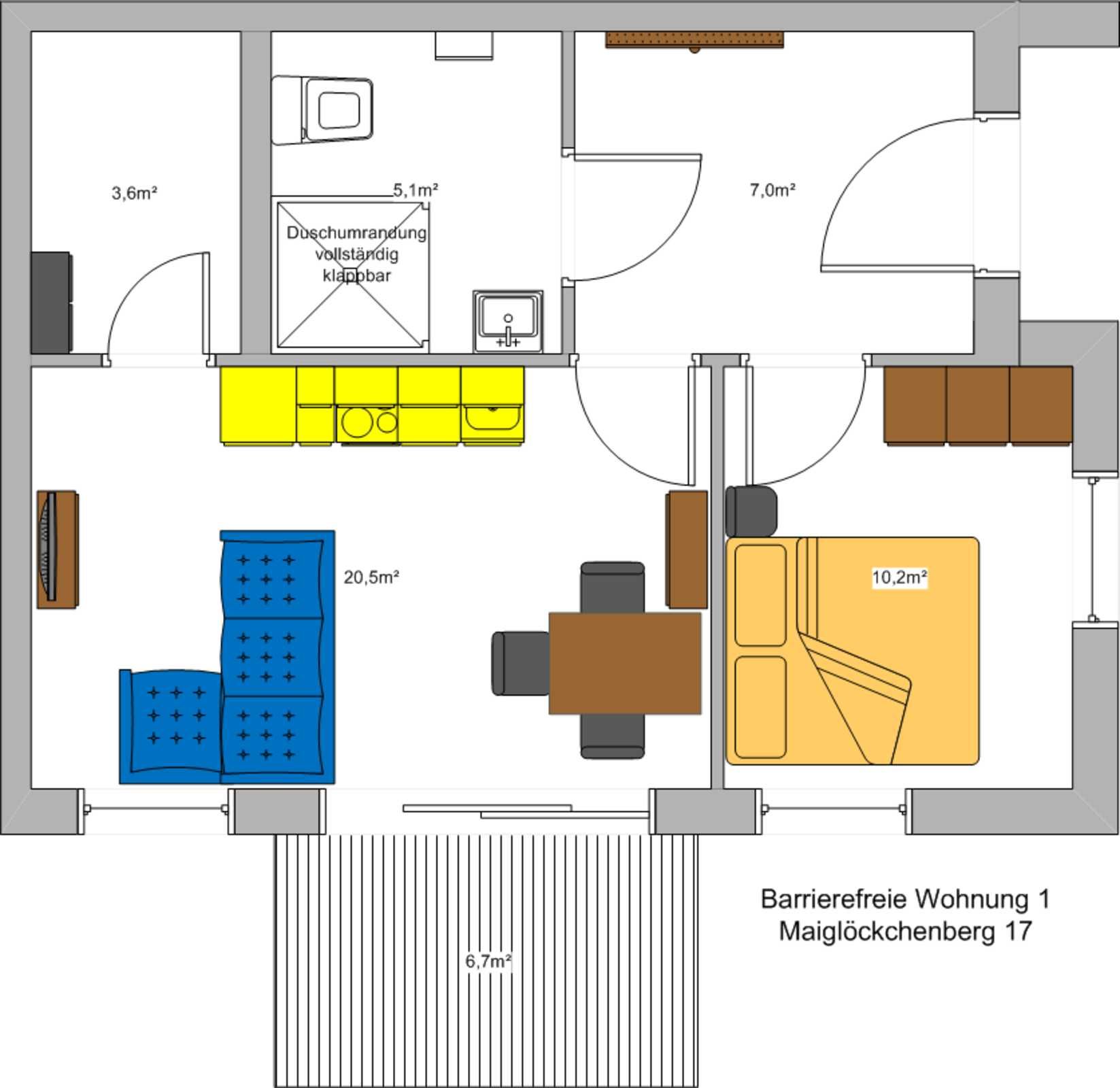 Die Wohnung ist ebenerdig, und behindertenfreunlich ausgestattet (siehe Bilder), jedoch ist der Zugang vom Wohnzimmer zur Terrasse, nicht behindertengerecht, da eine Stufe vorhanden ist. Es ist allerdings eine Rampe vorhanden.