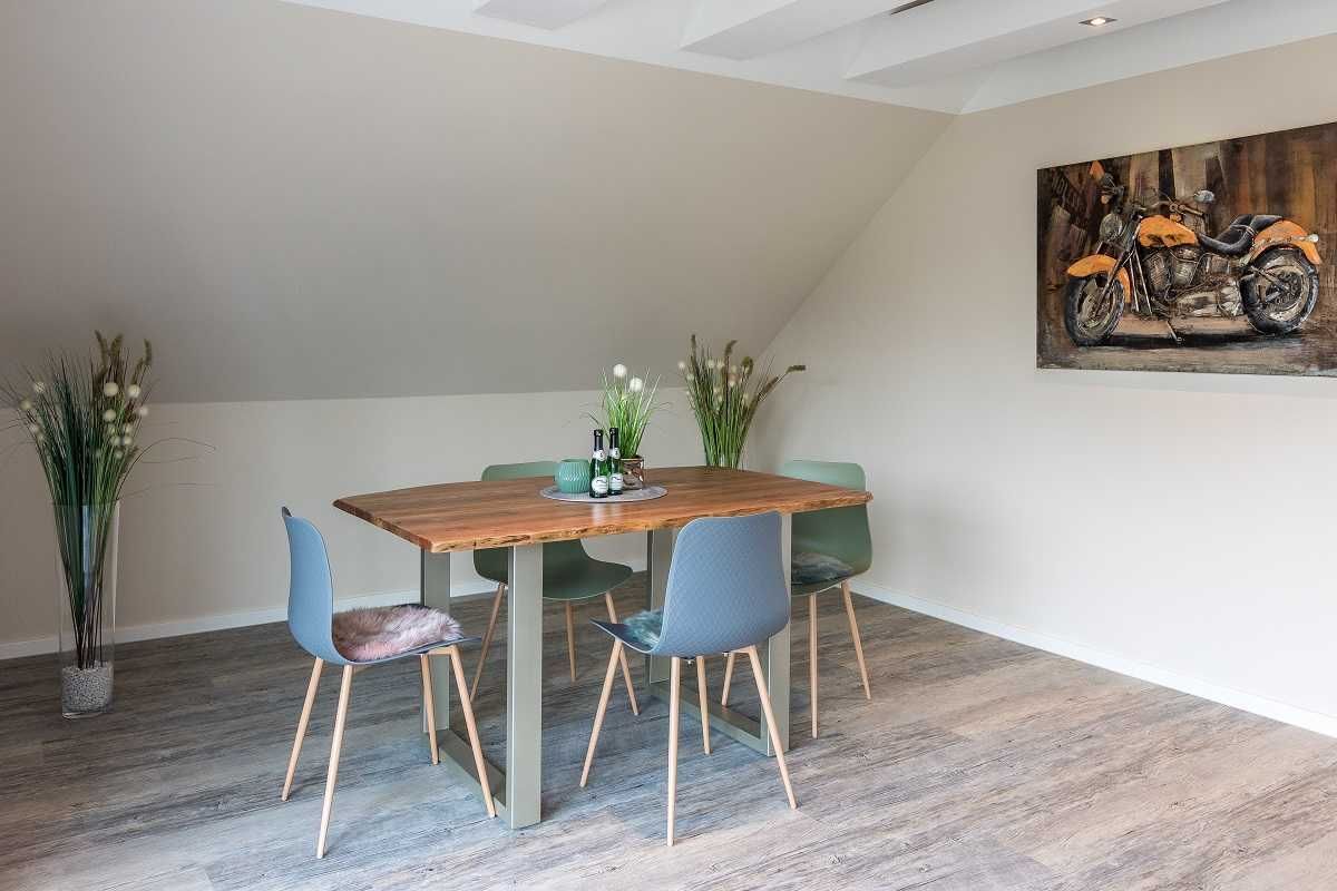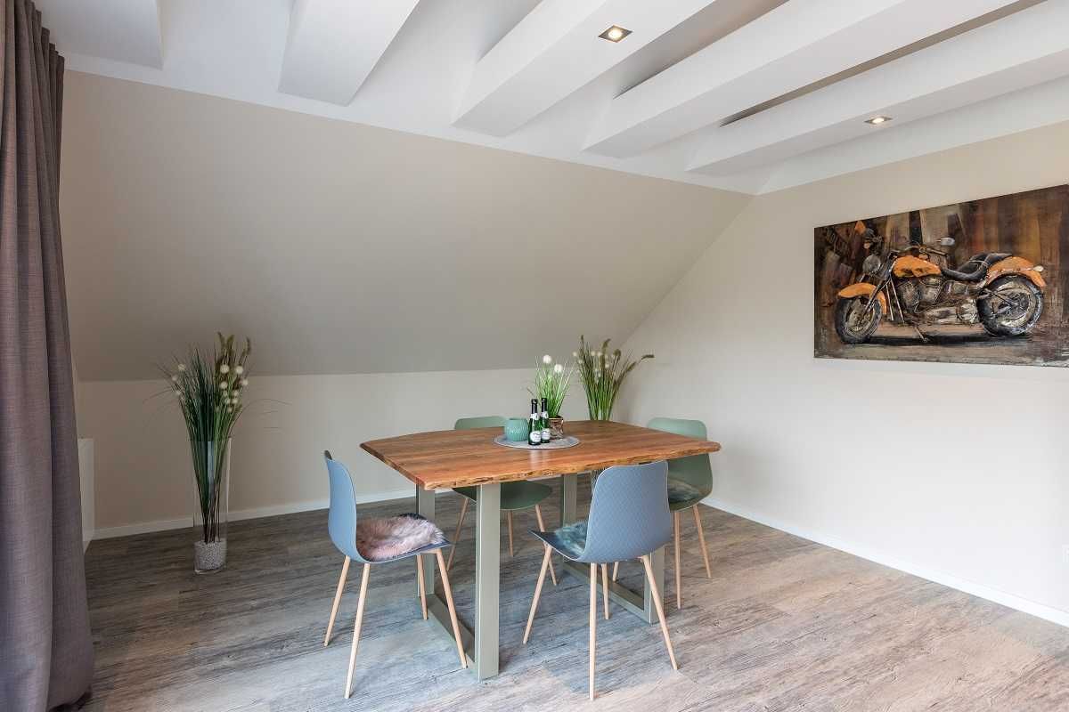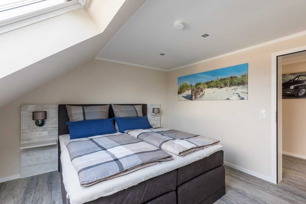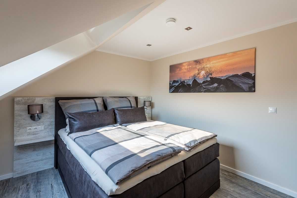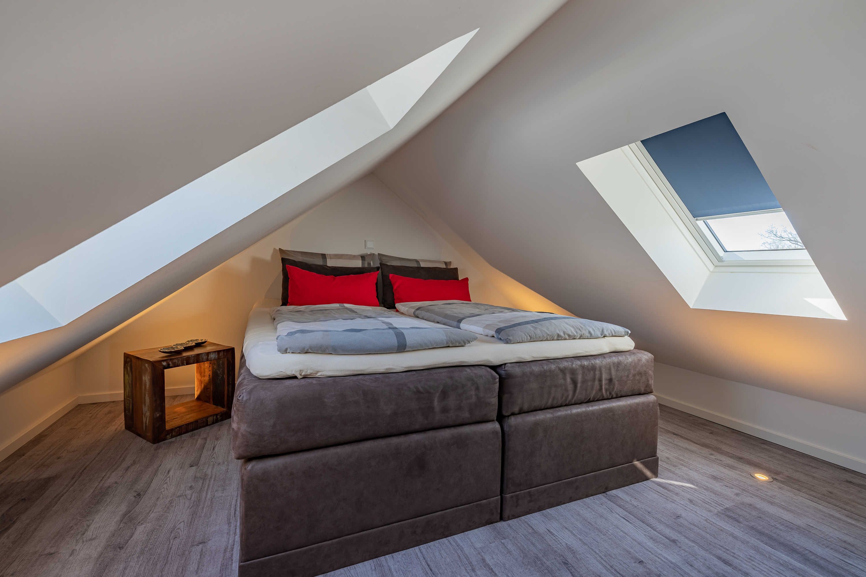 Sie schlafen in traumhaften Boxspringbetten – und für den entspannten Luxus tagsüber stehen zwei stilvolle Sofas und ein gemütlicher Esstisch zur Verfügung. Kinder dürfen sich im Spitzboden austoben oder vielleicht eine Runde Playstation spielen.