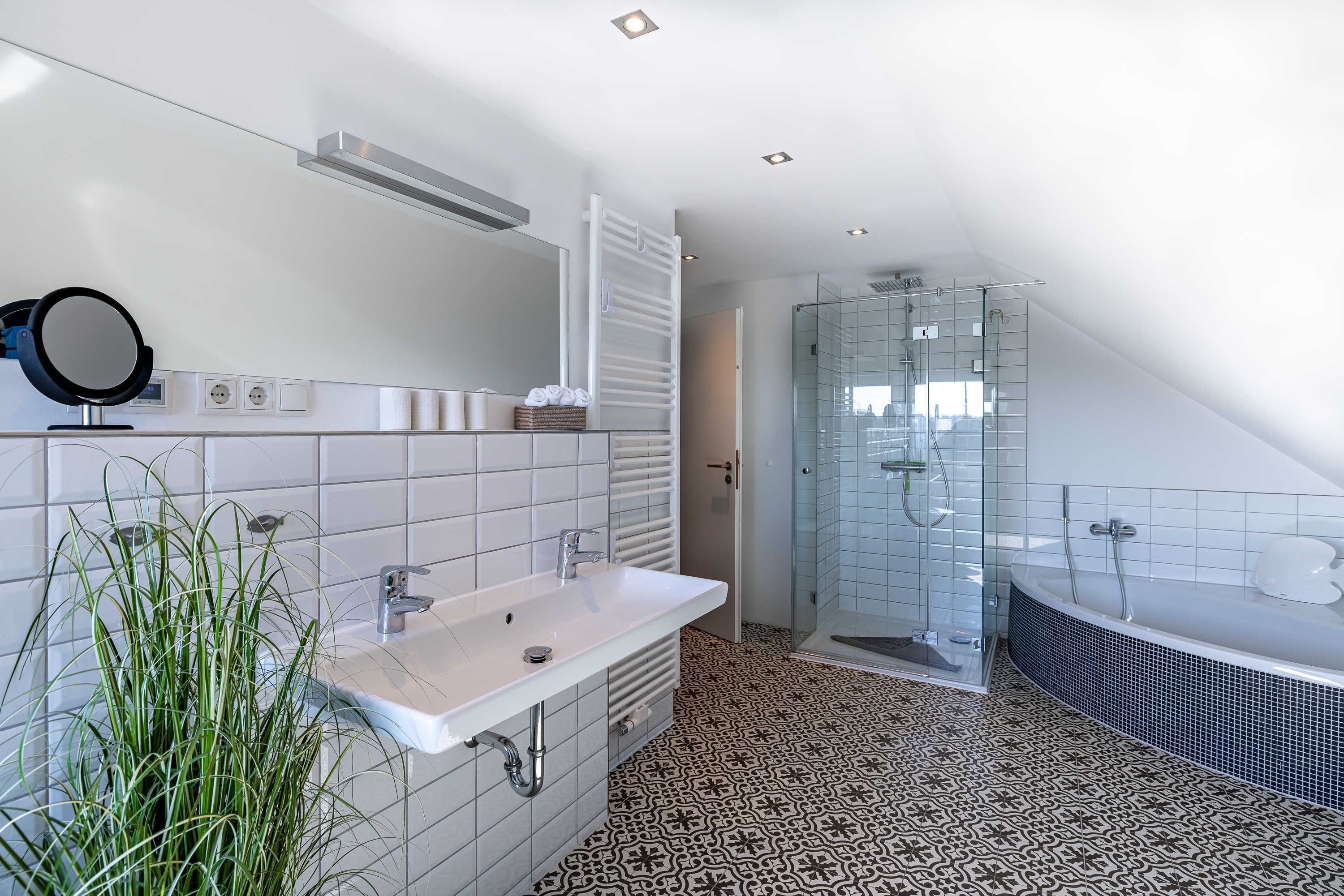 Die Suite ist für Allergiker geeignet und erstklassig ausgestattet. Hier finden Sie alles, was den Urlaub angenehm macht: ein Bad mit Dusche und Badewanne, eine voll ausgestattete Küche mit Kaffeemaschine, Mikrowelle, Wasserkocher und Herd mit Ceranfeld. Für die schnelle Wäsche zwischendurch gibt es eine Waschmaschine mit integriertem Trockner.