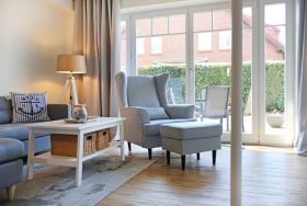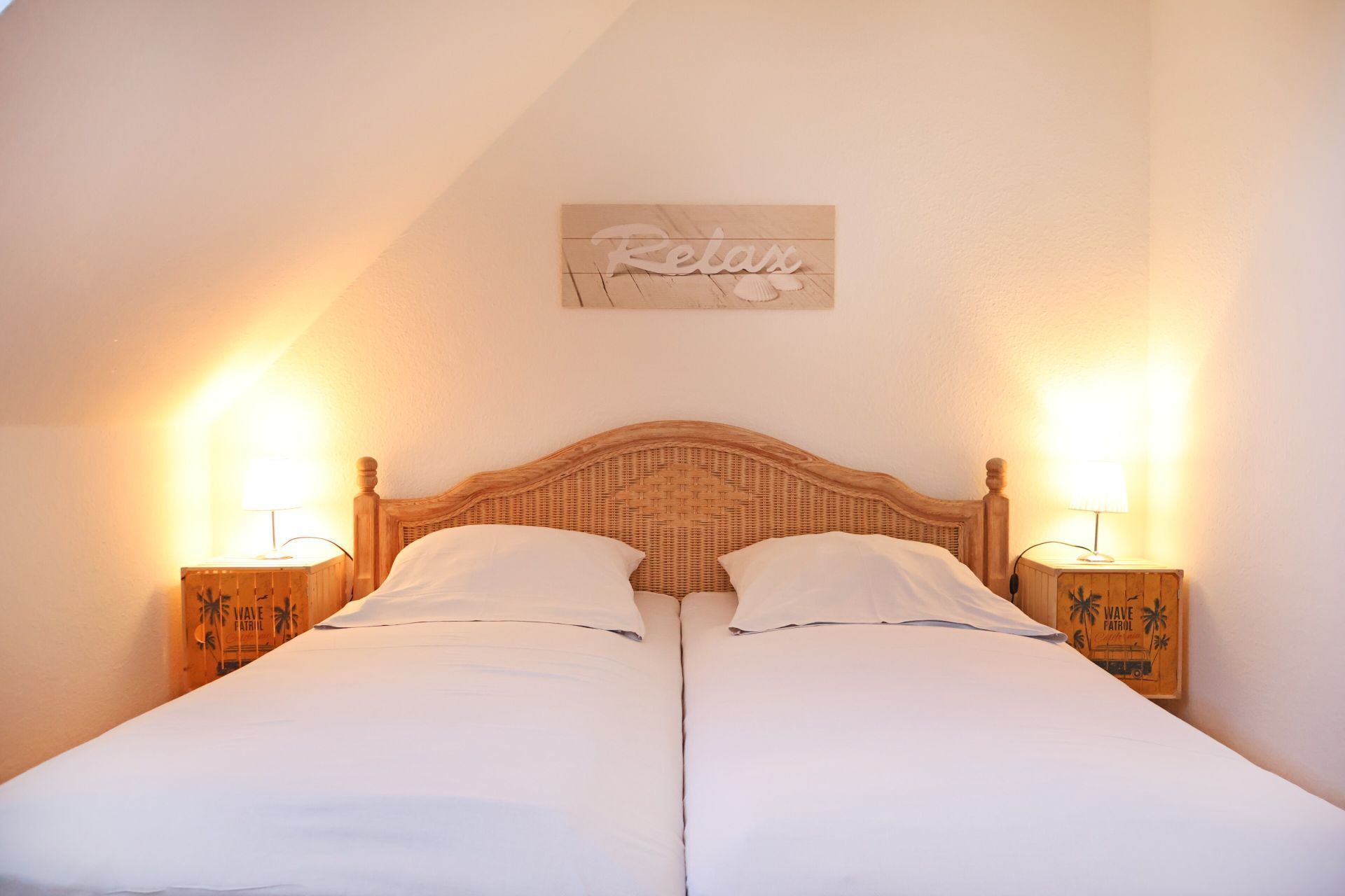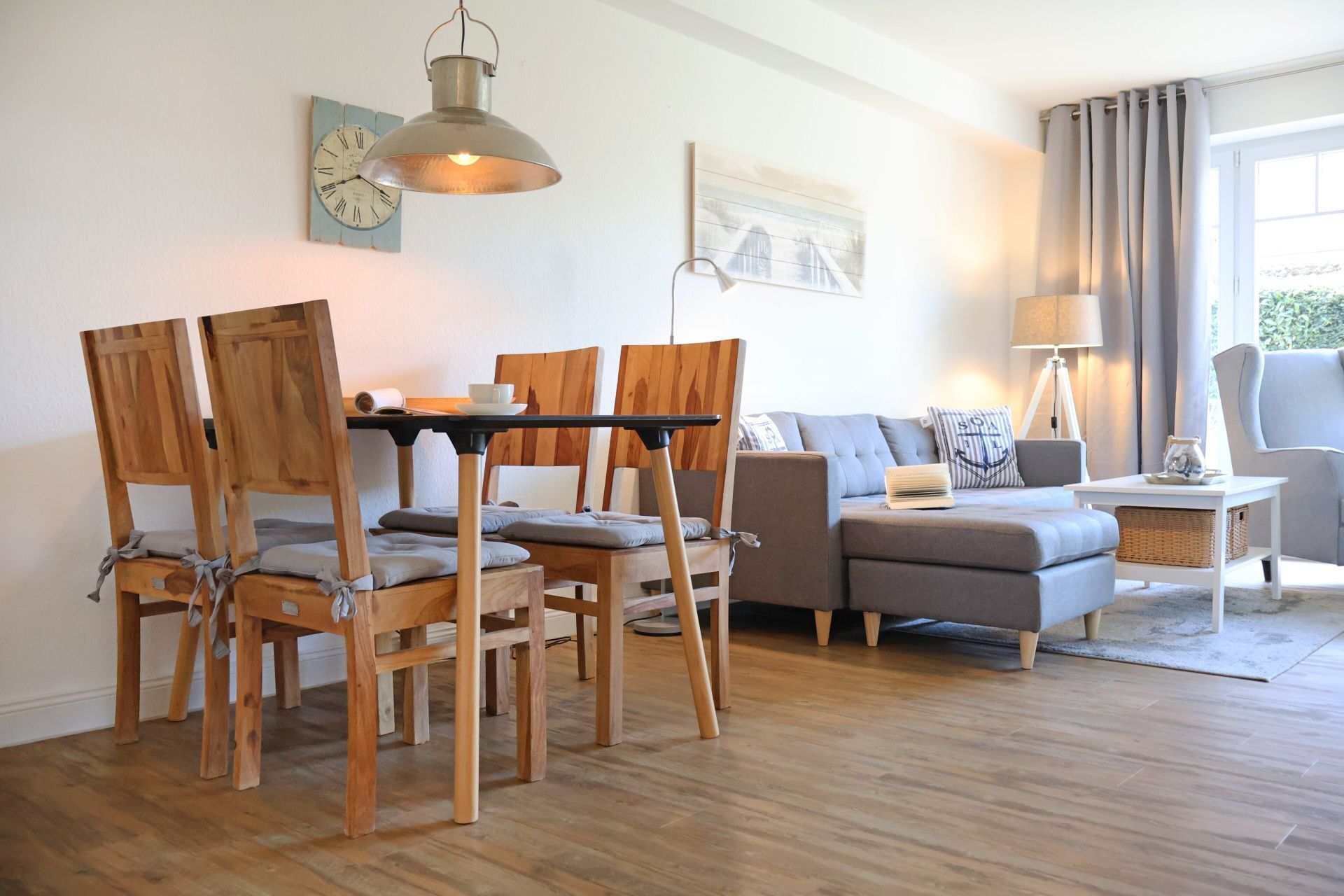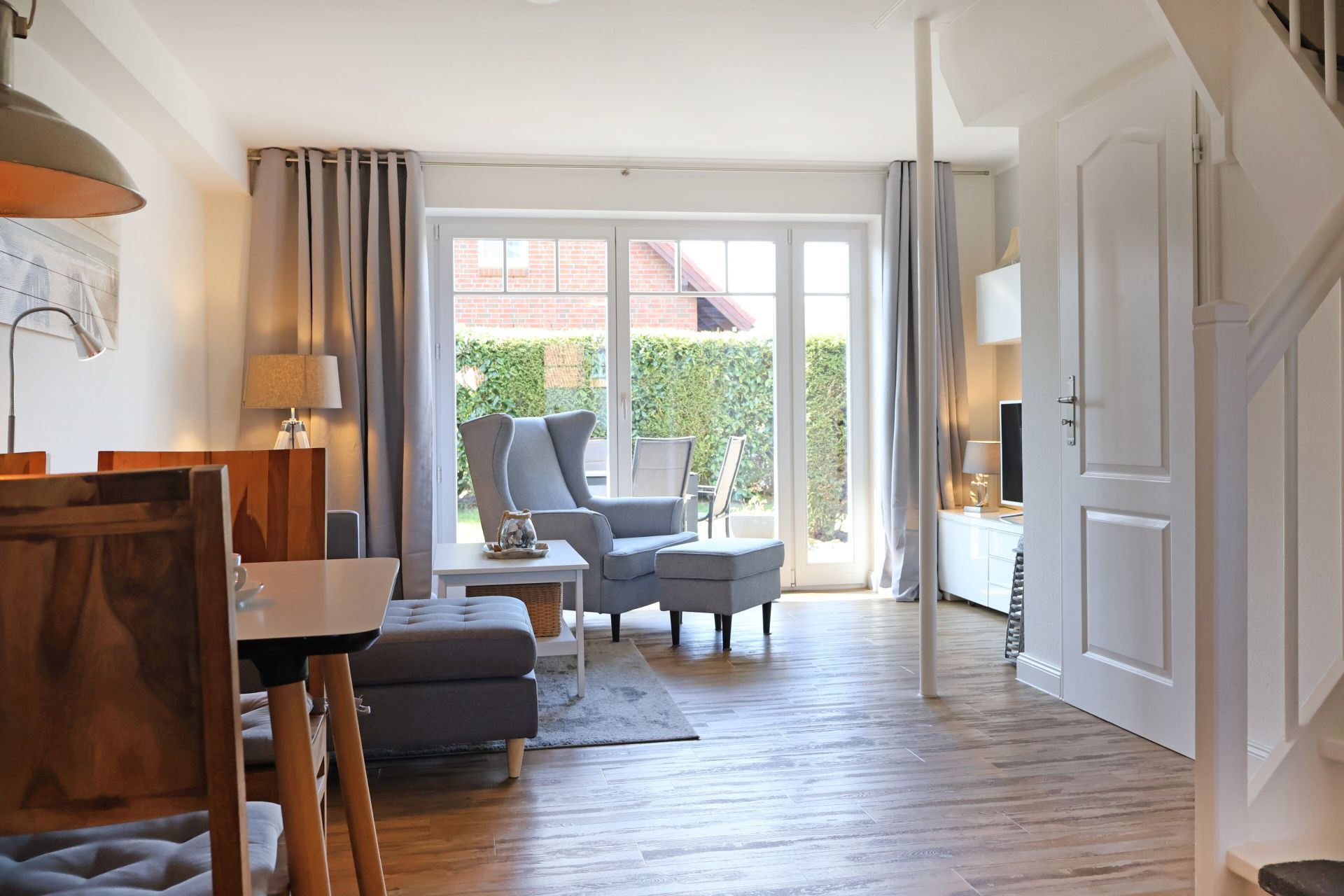 Hell und freundlich empfängt das liebevoll eingerichtete Reihenhaus ?Stranddüne? max. 4 Gäste auf einer großzügigen Wohnfläche von 60qm. An den komfortabel eingerichteten Wohn-Essbereich lehnt integrierte, gut ausgestattete Küchenzeile mit 4 Platten Ceranherd, Backofen, Geschirrspüler, Mikrowelle, Kaffeemaschine, Toaster usw. Vom Küchenbereich blicken Sie auf einen kleinen Naturteich. Für Unterhaltung sorgen ein Flat-TV, Musikanlage mit MP3-Funktion. Ebenso befindet sich im Wohnbereich eine gemütliche Sitzcouch. Entspannung bietet auch die sonnige Terrasse mit Gartennutzung. Das Ferienhaus ist im Erdgeschoß mit einer Fußbodenheizung ausgestattet. Das gesamte Haus überzeugt zudem mit einem Holzoptik Design- Fußboden. Im Obergeschoss des Hauses verwöhnt das hell geflieste Duschbad mit Wellnessduschbrause. In beiden Schlafzimmern 1x Doppelbett und 1x 2 Einzelbetten werden Sie auf Grund der ruhigen Wohnlage erholsam schlafen. Kostenfrei parken Sie Ihren PKW auf dem zugehörigen Grundstück. Gerne können im Kellergeschoss Gefrierschrank kostenfrei sowie Waschmaschine und Wäschetrockner gegen geringe Gebühr genutzt werden. Herzlich willkommen in diesem familienfreundlichen Nichtraucher Ferienhaus. Hunde sind herzlich willkommen und werden mit 8,00?/Tag berechnet.