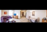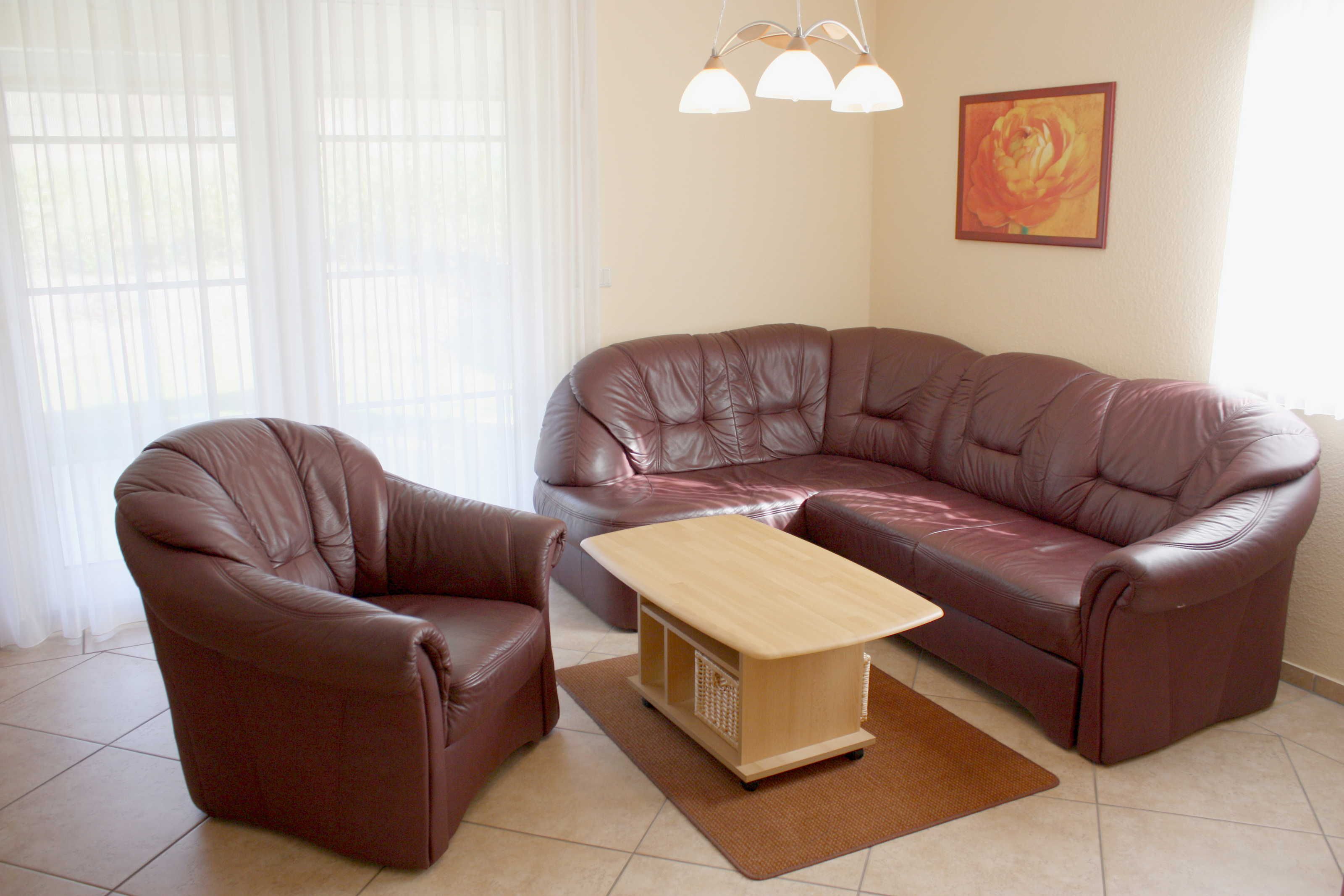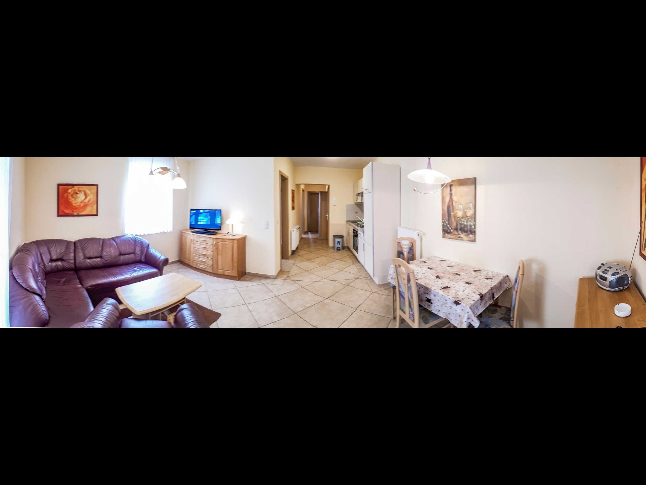 Die schöne und modern eingerichtete 3-Zimmerwohnung Nr. 12 befindet sich im Erdgeschoss des Hauses und verfügt über eine große überdachte Terrasse, die Sie zum Frühstücken nutzen können um so Energie für einen tollen Strand- oder erlebnisreichen Ausflugstag zu tanken. Die Nichtraucherwohnung verfügt über eine Größe von ca. 50 qm und ist mit bis zu 3 Personen belegbar. Die helle Wohnung verfügt über einen vorgelagerten Flur mit einer Garderobe, einem gemütlichen Wohnbereich mit Wohnküche sowie einen Essplatz, zwei Schlafzimmer und ein Tageslichtbad. Im Wohnbereich erwartet Sie eine bequeme Sitzecke. Zudem gelangen Sie vom Wohnzimmer aus auf die möblierte Terrasse. Die technische Einrichtung umfasst einen SMART Flachbildfernseher, ein Radio mit CD-Player sowie einen gebührenfreien WLAN-Zugang. In der ausgestatteten Küchenzeile erwartet Sie unter anderem ein Backofen, Mikrowelle, 4 Plattenkochfeld, Kühlschrank, Kaffeemaschine, Toaster, Wasserkocher sowie umfangreiches Kücheninventar. Das Schlafzimmer verfügt über ein großes Doppelbett mit Nachttischen, einen Kleiderschrank mit Spiegel sowie Verdunklungsvorhänge für eine erholsame Nachtruhe. Das zweite Schlafzimmer erwartet Sie mit einem Einzelbett. Im Bad steht Ihnen eine Dusche, Waschtisch, Kosmetikspiegel und WC zur Verfügung. Für unsere kleinen Gäste stellen wir gern auf Anfrage ein Kinderreisebett sowie einen Hochstuhl bereit.