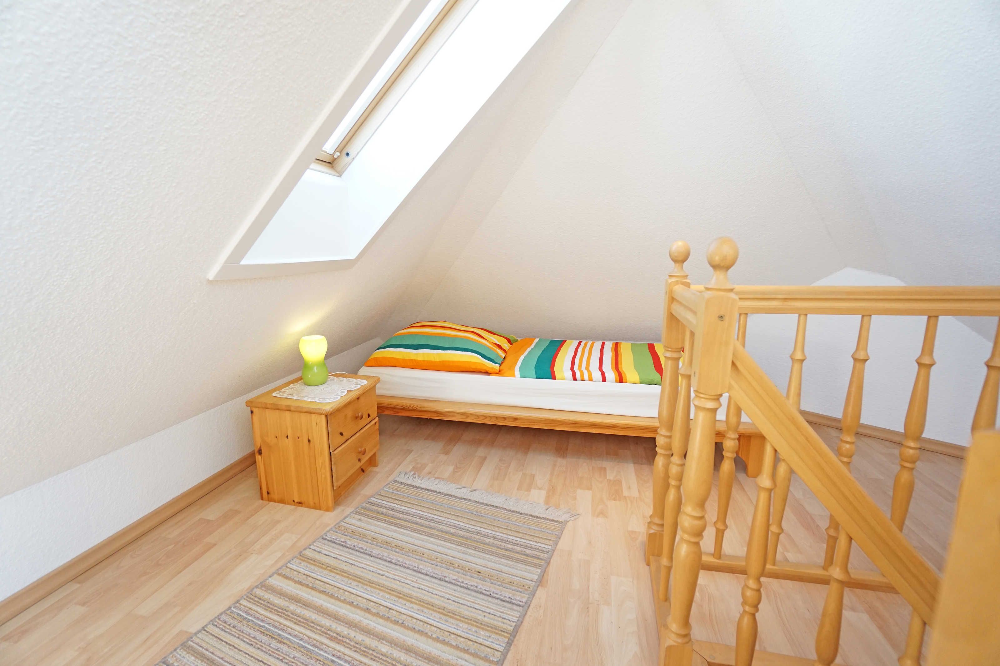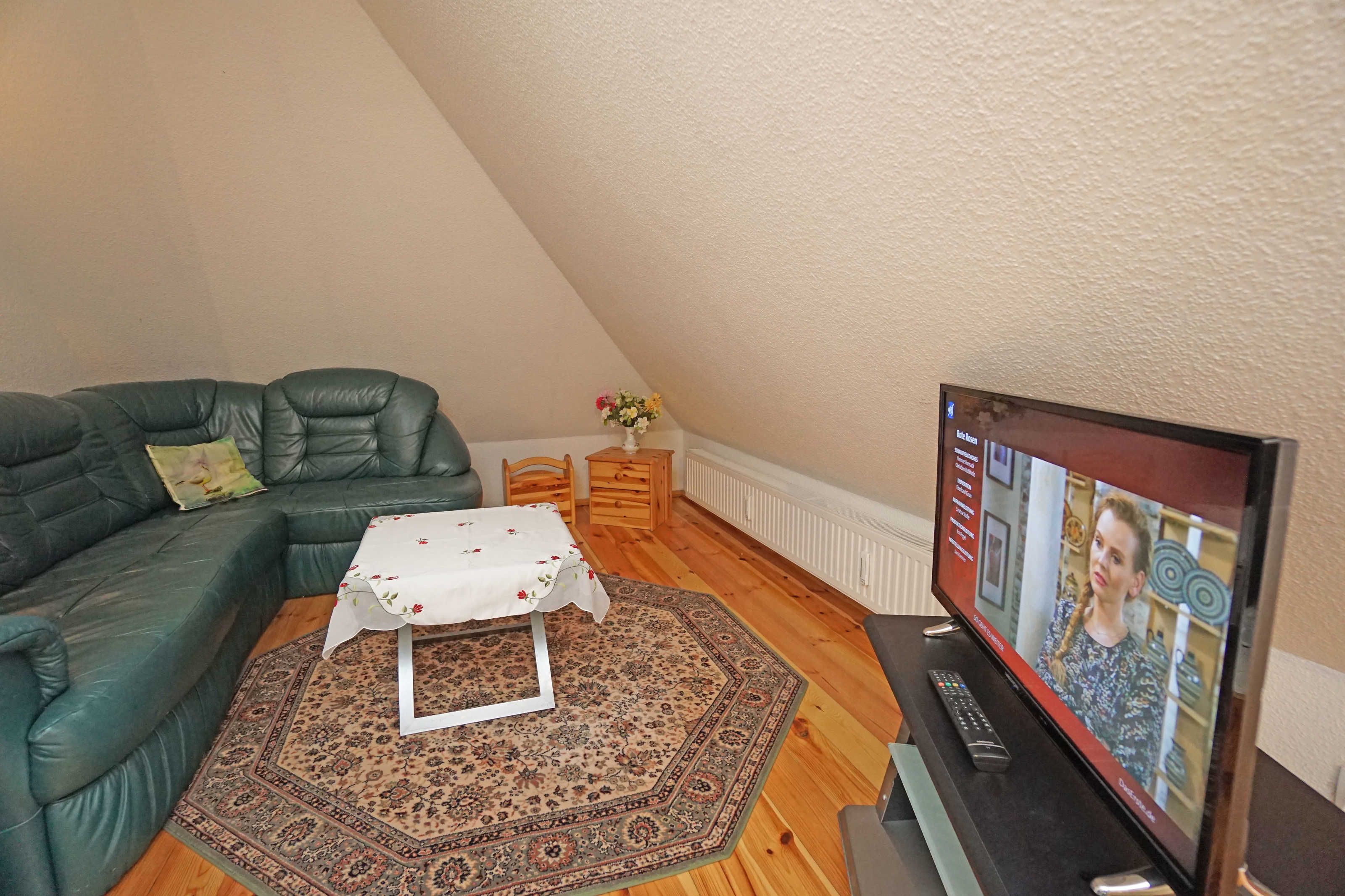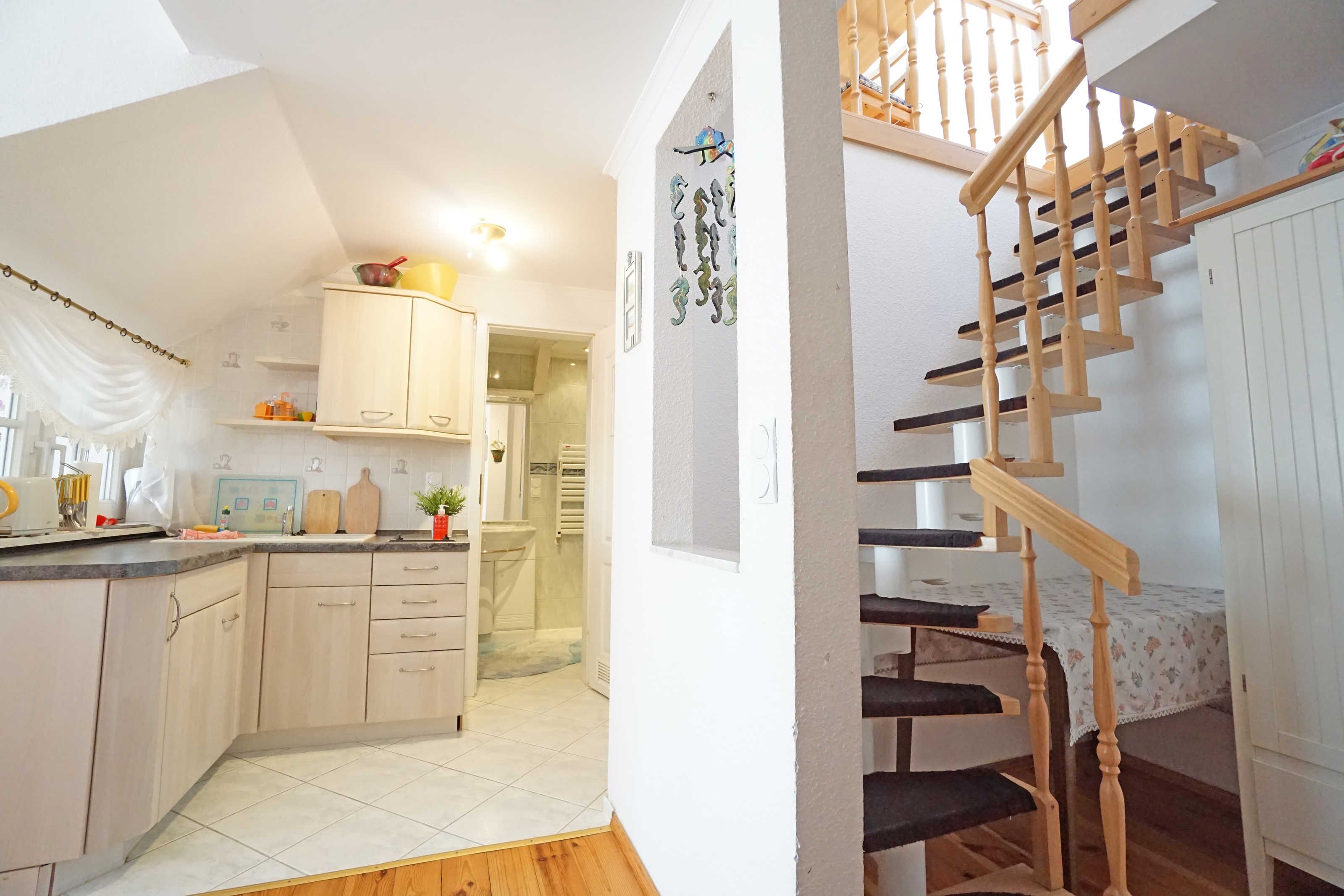 Die gemütlich eingerichtete, helle 2-Zimmer-Maisonettewohnung (62m²) befindet sich im zweiten Obergeschoss des Hauses. Die Nichtraucherwohnung verfügt über ein Wohn- und Esszimmer mit großem Esstisch, Schlafcouch, Flachbildfernseher und offener Küchenzeile (Kochmodul, Kühlschrank mit Gefrierfach). Über eine kleine, relativ steile Treppe erreichen Sie das Schlafzimmer, welches mit einem Doppelbett (140x200cm) und einem Einzelbett ausgestattet ist. Ein geräumiger, sonniger Südbalkon rundet dieses schöne Appartement ab. Ein Duschbad ist vorhanden.