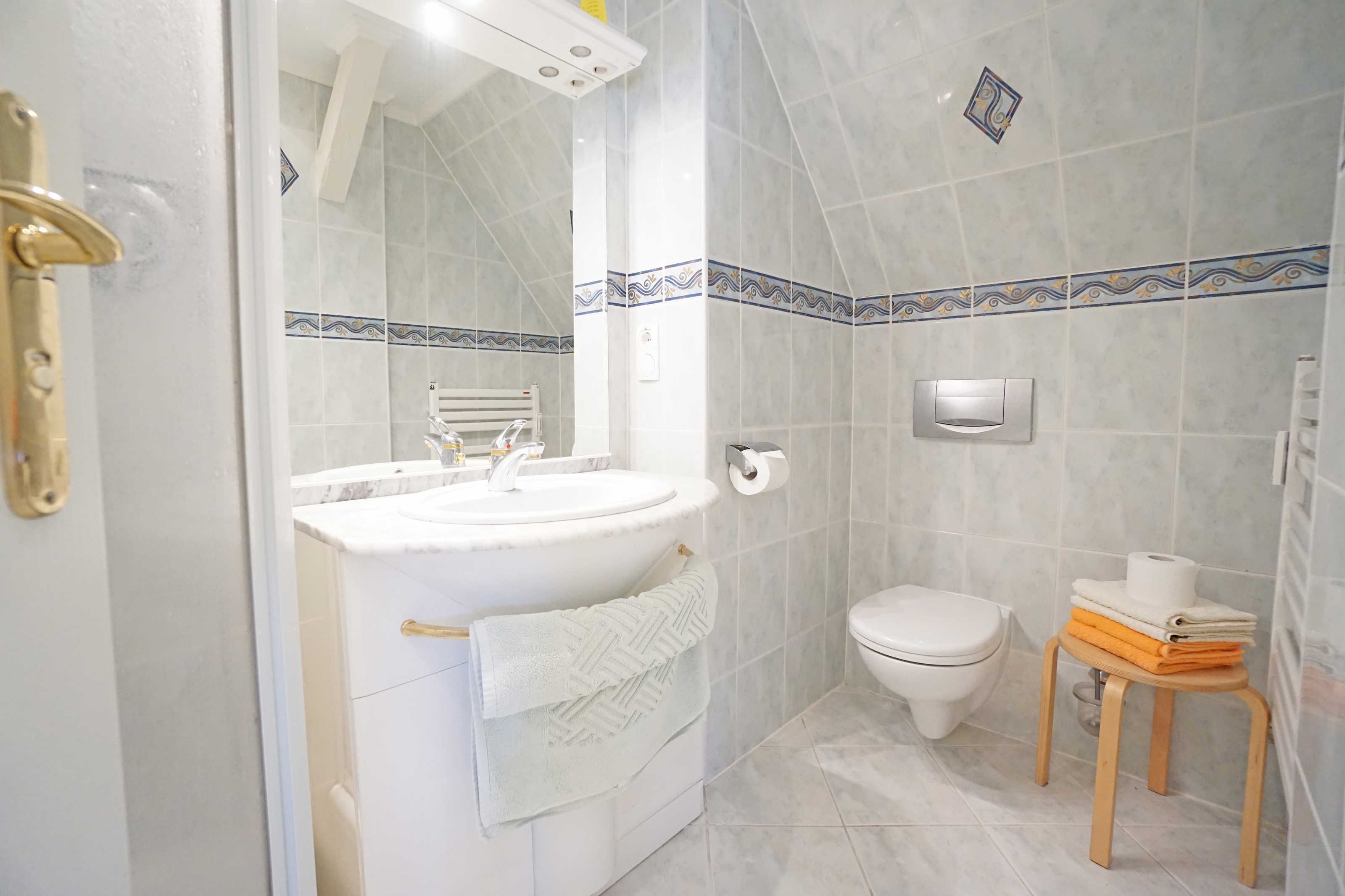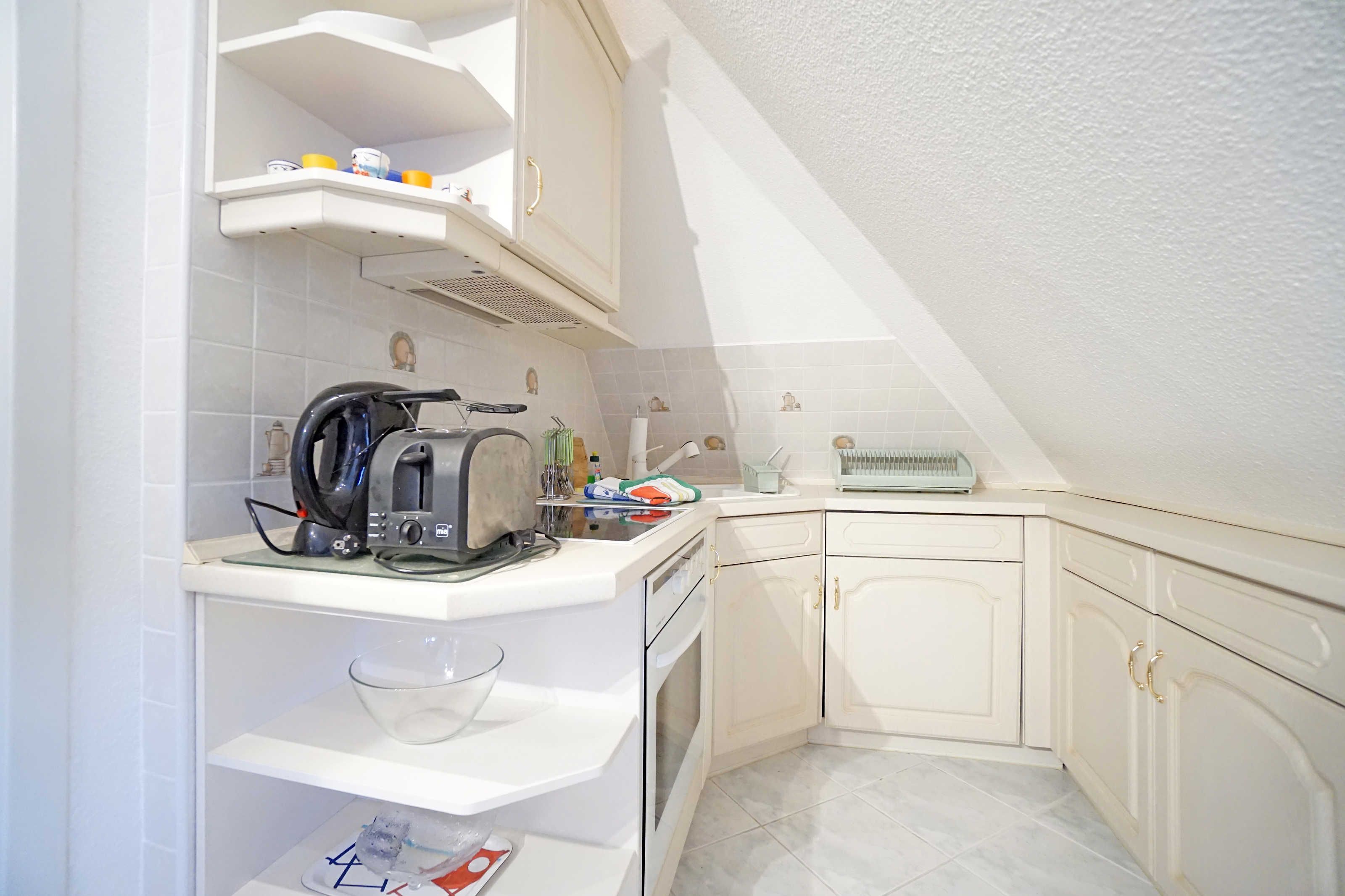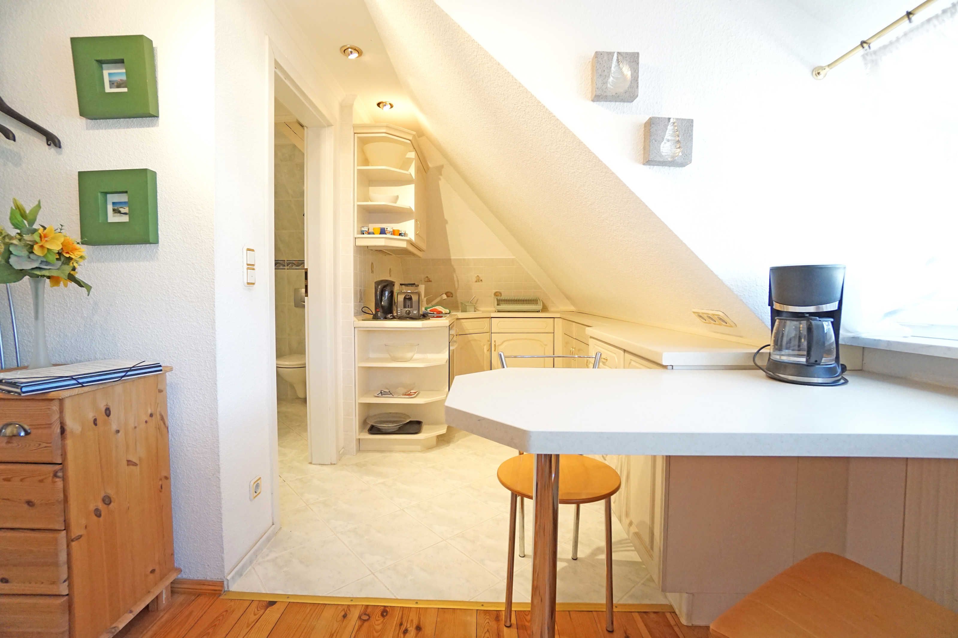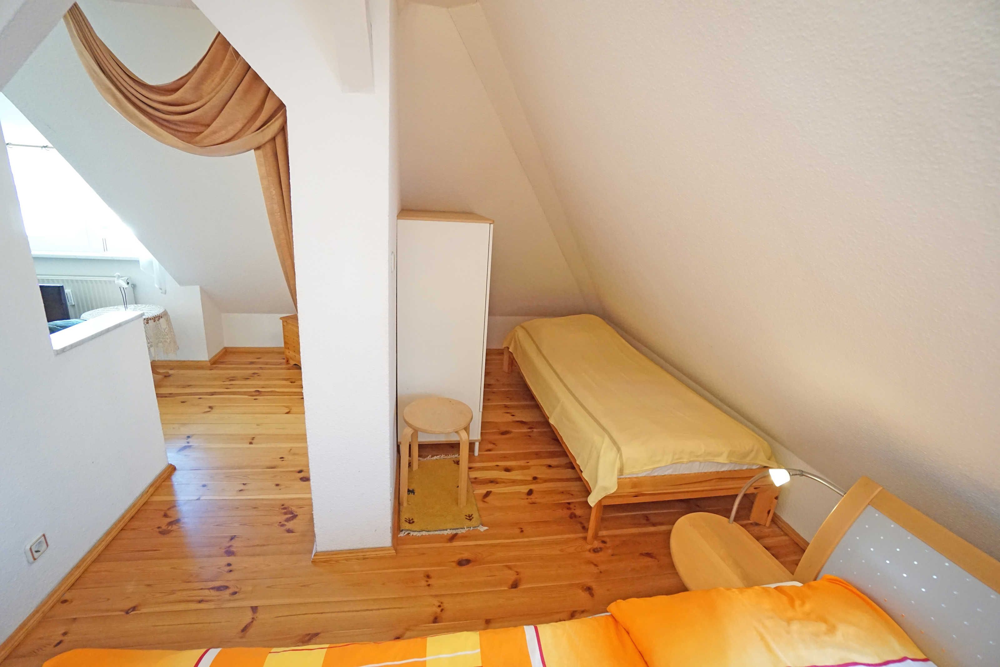 Die gemütlich eingerichtete, helle 2-Zimmer-Ferienwohnung (36m²) befindet sich im zweiten Obergeschoss des Hauses. Die Nichtraucherwohnung verfügt über ein Wohnzimmer mit offener Küche (Herd, Ofen, Kühlschrank mit Gefrierfach), einem kleinen Esstisch, Flachbildfernseher und einer gemütlichen Sitzecke. Das Schlafzimmer ist mit einem Doppelbett (160x200cm) und einem Einzelbett ausgestattet. Ein Duschbad ist vorhanden.