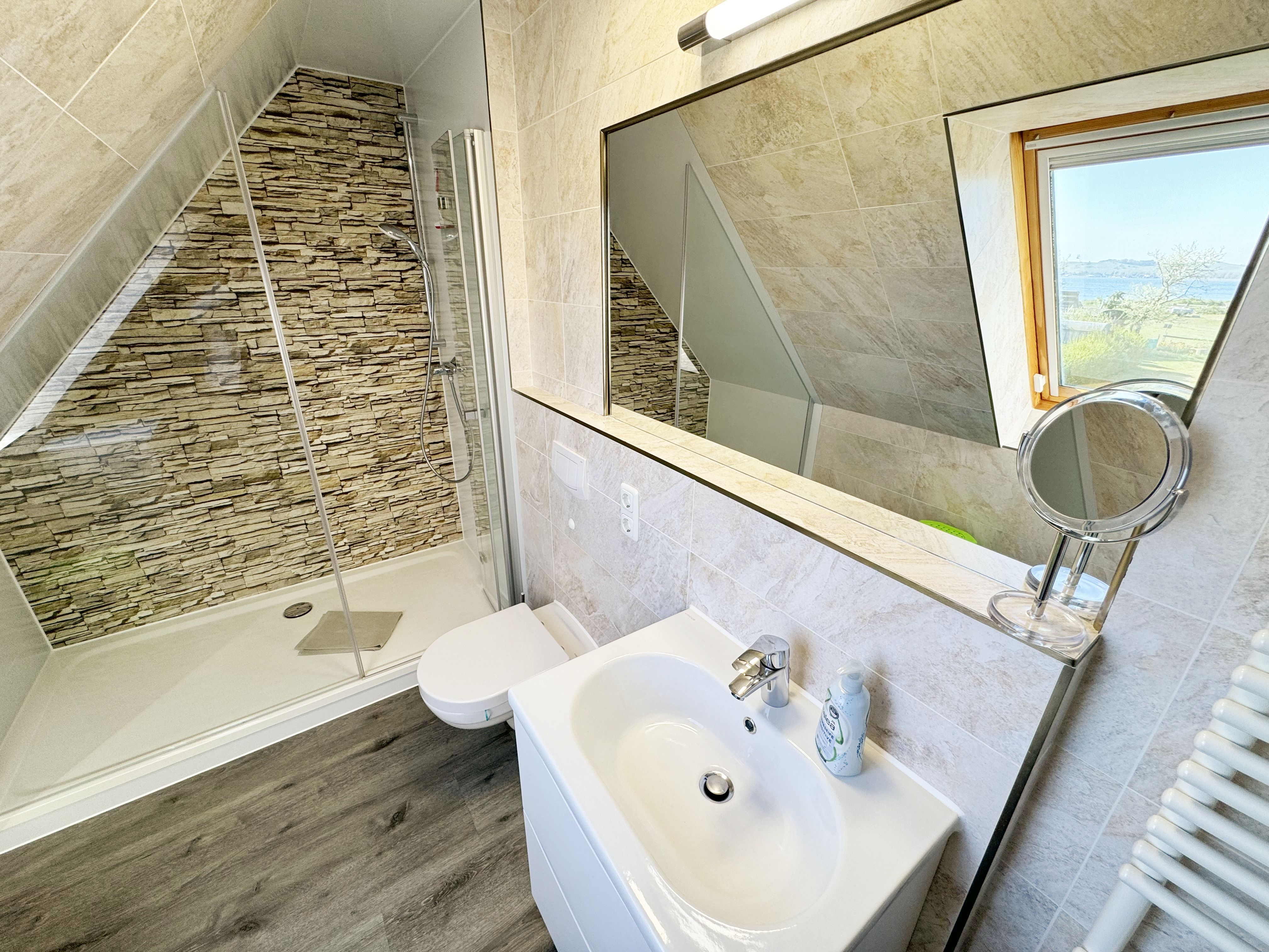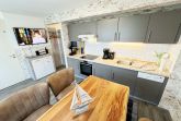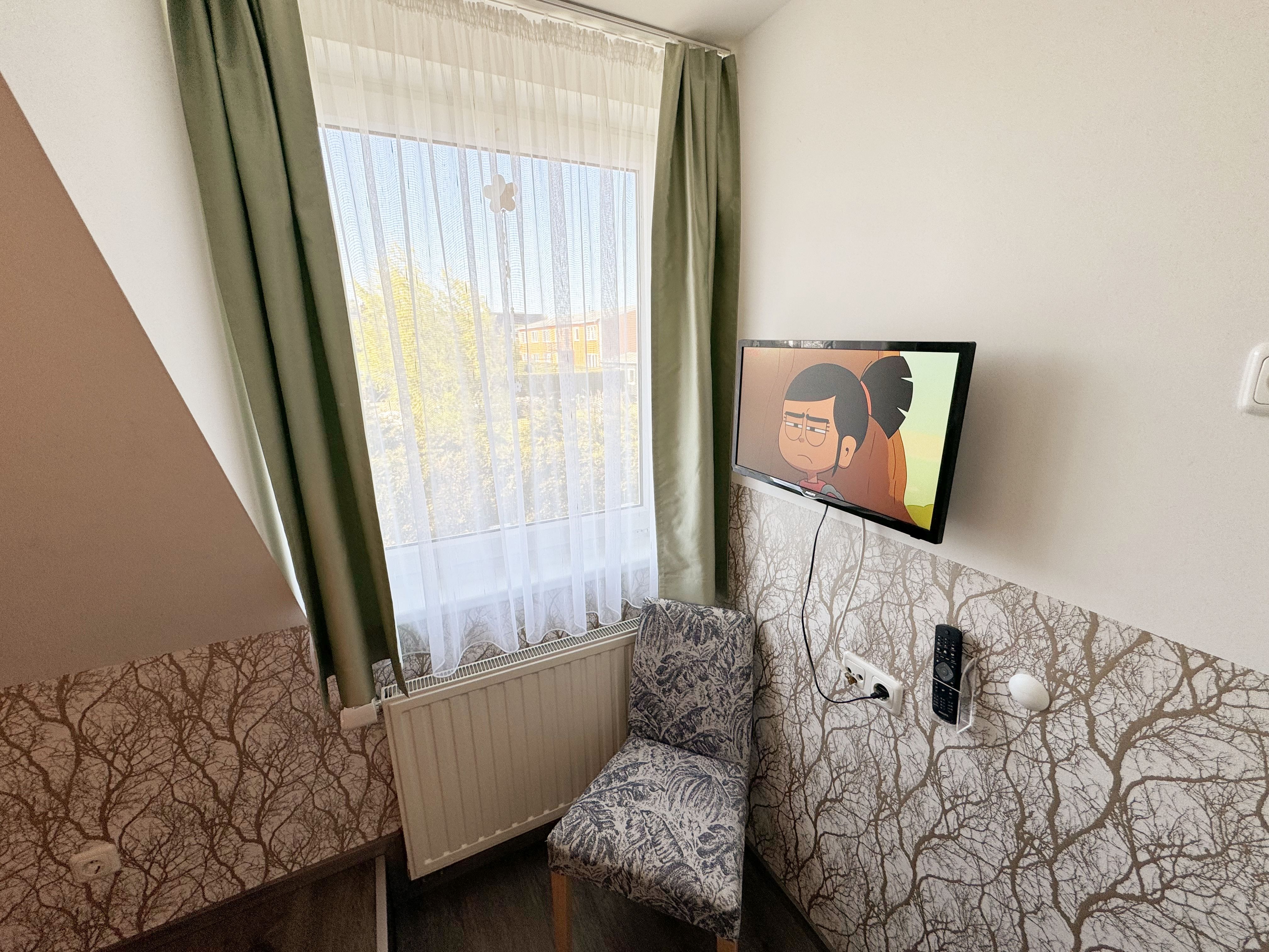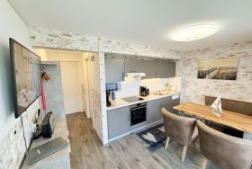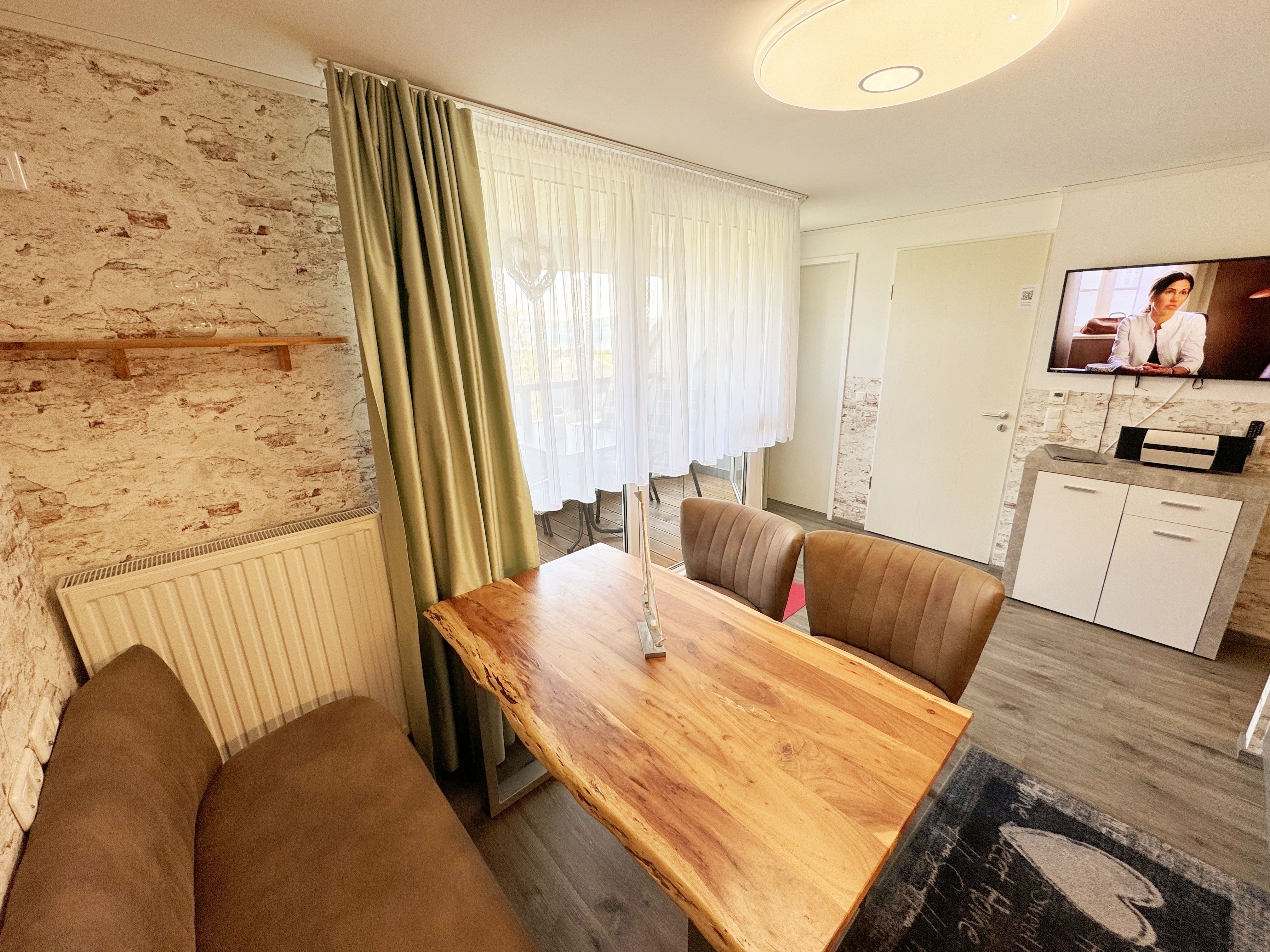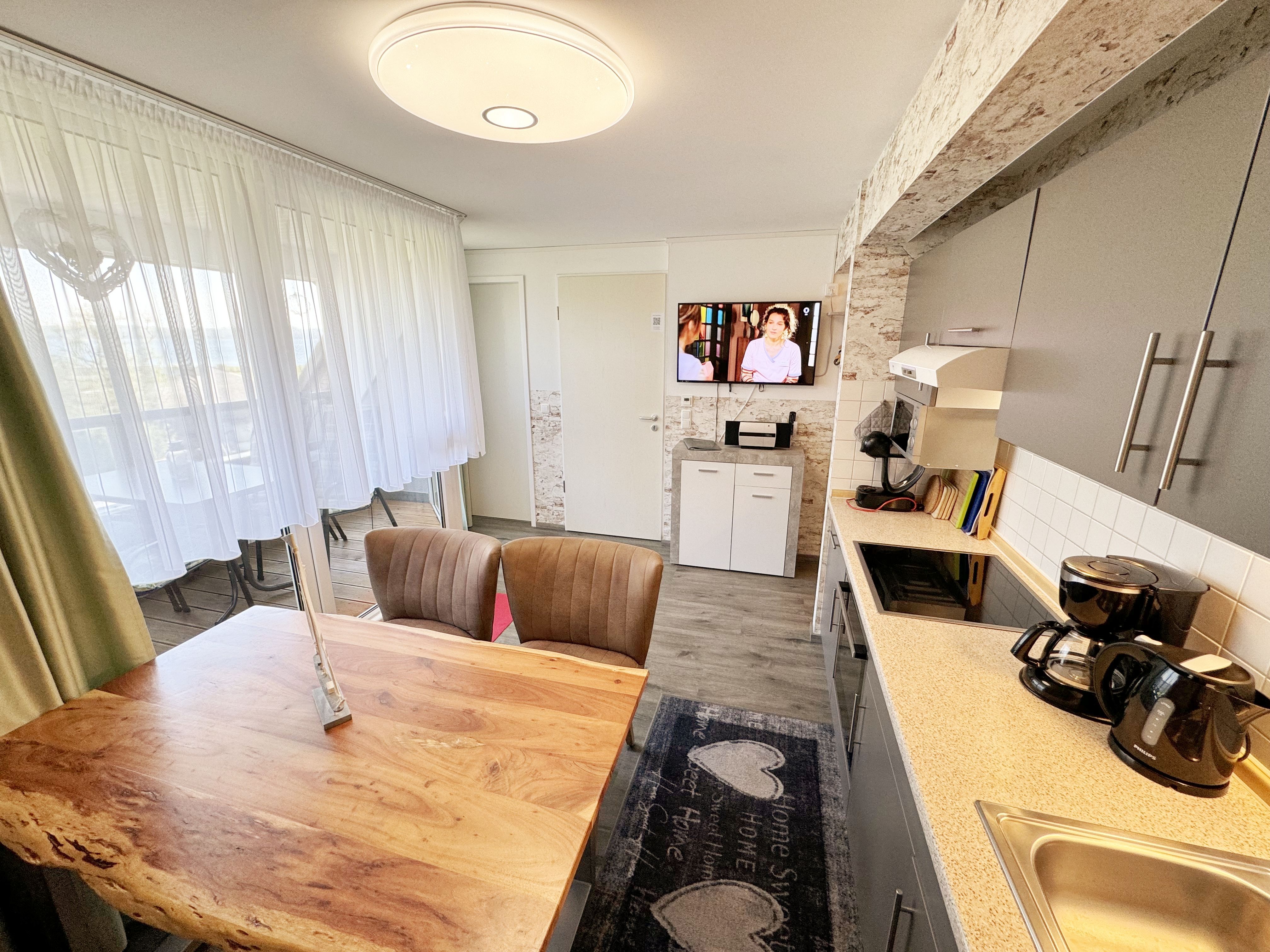 Die gut geschnittene Nichtraucherwohnung Nr.06 befindet sich im Obergeschoß des Hauses. Mit Ihren ca. 50 m² Wohnfläche mit Balkon und direktem Blick über die großzügige hauseigene Freifläche auf den Bodden, bietet sie ausreichend Platz für max. 2 bis 4 Erwachsene + 1 Kleinkind bis 3 Jahre im Kinderreisebett. Die Wohnung wurde komplett renoviert und mit einem hochwertigen PVC freiem Vinyl verlegt. Die offene und vollausgestattete Küchenzeile mit einem 4 Zonencerankochfeld, Geschirrspüler, Backofen, Kühlschrank mit Gefrierfach, Mikrowelle, Toaster, Wasserkocher, Kaffeemaschine, Dolce Gusto Maschine sowie kleinen Küchenhelfern wird mit einem gemütlichen Essplatz komplettiert. Vom Küchenbereich gelangen Sie auf den überdachten und bestuhlten Balkon (Süd/Ost). Bei schönem Wetter können Sie auch hier Ihre Mahlzeiten, mit einem wundervollen Natur- und Boddenblick genießen. Im ersten Schlafzimmer erwartet Sie ein großes Doppelbett mit Einzelmatratzen (1,80m x 2,00m), Nachttischablagen mit Leselampen, Smart-TV, einen geräumigen Kleiderschrank und Safe für Ihre Wertsachen und ein Sideboard für Ihre Wäsche sowie Ablage. Für einen erholsamen Schlaf sorgen Verdunklungsgardinen und Insektenschutzgitter. Das zweite Schlafzimmer verfügt ebenfalls über ein Doppelbett mit Einzelmatratzen (1,80m x 2,00 m), Leselampe und 17 Zoll LED-TV. Eine Hifi Microanlage mit CD-Player, MP3, UKW-Funktion, USB und Bluetooth mit NFC, ein DAB-Radio sowie ein inklusiver WLAN-Anschluss runden den technischen Bereich ab. Das große Tageslicht-Bad ist mit einem WC, einer ebenerdigen Dusche, einem Waschtisch, Fön, Kosmetikspiegel, einem großen Wandspiegel, Handtuchheizkörper und einem Ablageregal ausgestattet. Ein Haustier ist gegen eine Gebühr ein gern gesehener Gast. Da Haustiere erfahrungsgemäß Ihre eigenen Sachen lieben, bringen Sie hier bitte Schlafkörbchen, Wasser- und Fressnapf mit. Sollte Ihnen doch einmal Strandsand ins Haus geraten oder etwas runterfallen, ist jede Wohnung mit einem Staubsauger und anderen Reinigungsgeräten ausgestattet. Für Ihre Fahrräder finden Sie am Giebel des Hauses (unter Whg 5) einen Fahrradständer zum Anschließen. Die Grünfläche des Hauses lädt zu geselligen Abenden mit weiteren Hausgästen ein. Ein Standgrill steht für unsere Gäste im Gartenhaus zur Verfügung. Bitte beachten Sie jedoch, dass das Grillen auf den Holzterrassen aus brandschutztechnischen Gründen nicht erlaubt ist. Hier finden Sie aber ausreichend Platz auf dem Außengelände, welches auch über einen kleinen Kinderspielplatz, Sandkiste und einer Tischtennisplatte verfügt. Ein PKW-Stellplatz (Nr.06) steht Ihnen inklusive am Haus zur Verfügung. Die Erstausstattung eines Wäschepaketes (komplette Bettwäsche, 1 Duschhandtuch, 1 kleines Handtuch, 1 Duschvorleger) können Sie bis 14 Tage vor Anreise gegen einen Aufpreis dazu buchen oder durch eigene ergänzen.1 Geschirrhandtuch gehört zu jedem Aufenthalt dazu.