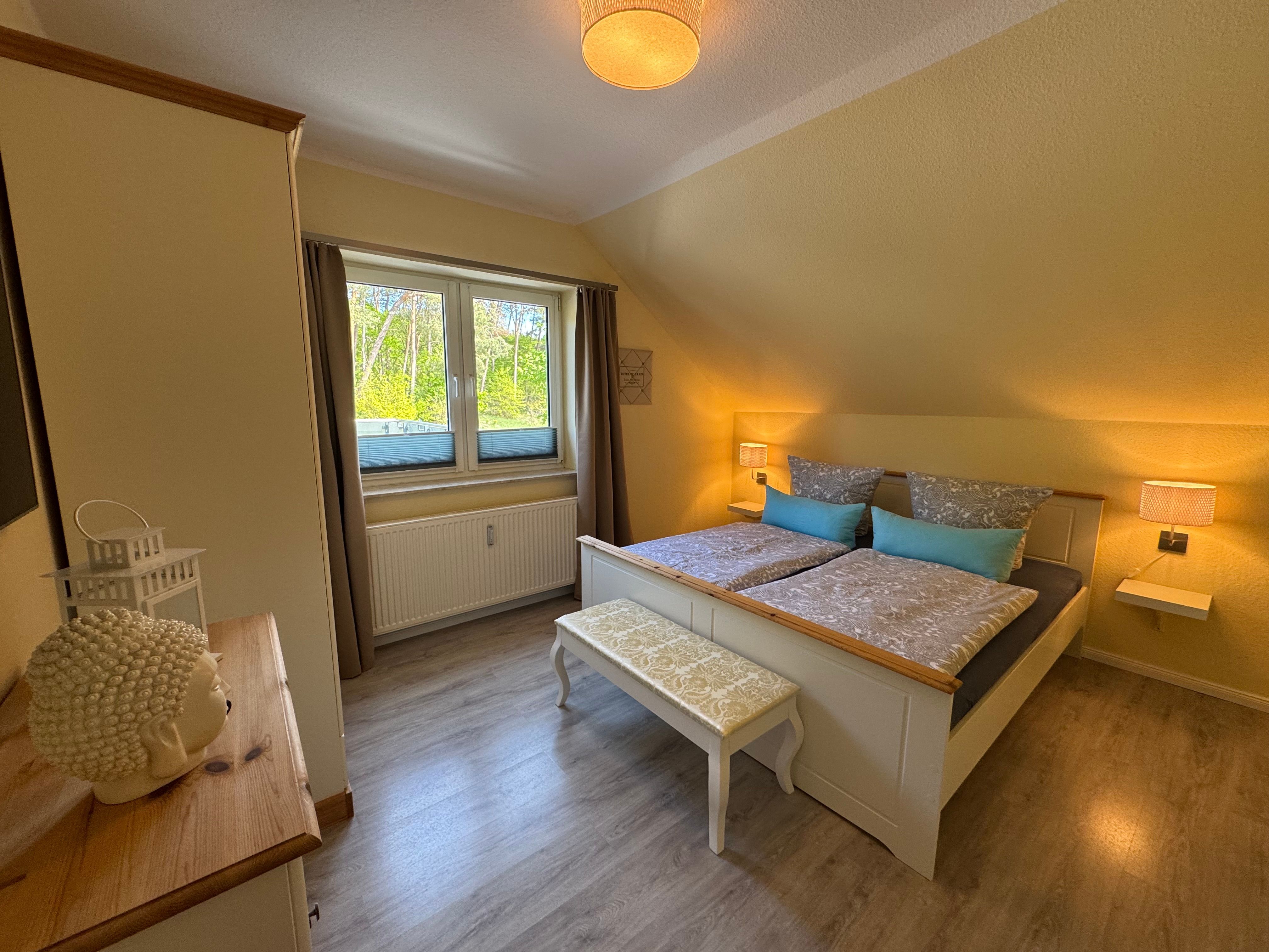 Im behaglichen Schlafzimmer erwartet Sie ein komfortables Doppelbett (180 x 200 cm), das bei Ihrer Anreise bereits frisch bezogen ist. Geräumige Schränke bieten ausreichend Platz für Ihre Urlaubsgarderobe hier beginnt Entspannung mit dem ersten Moment.