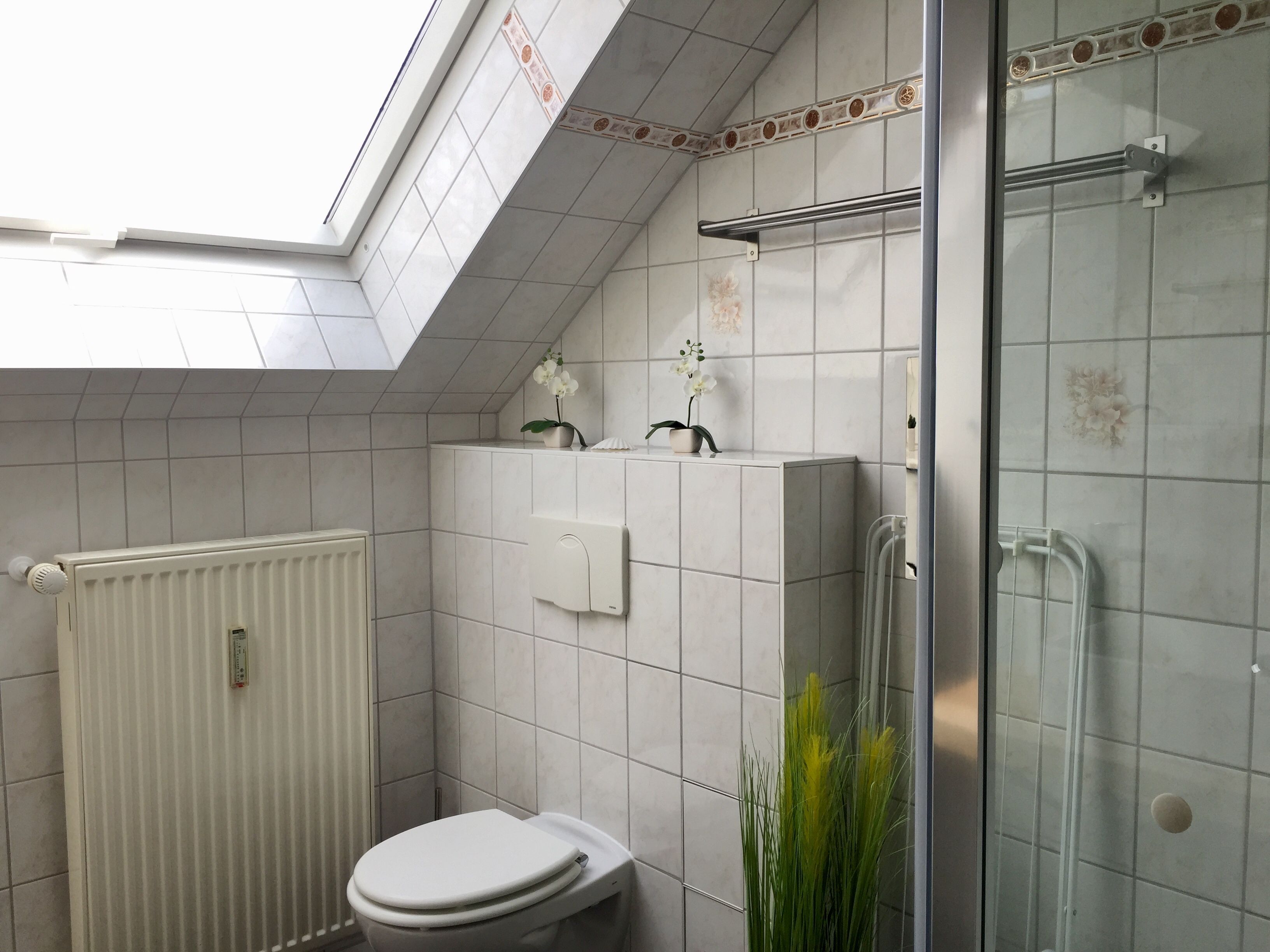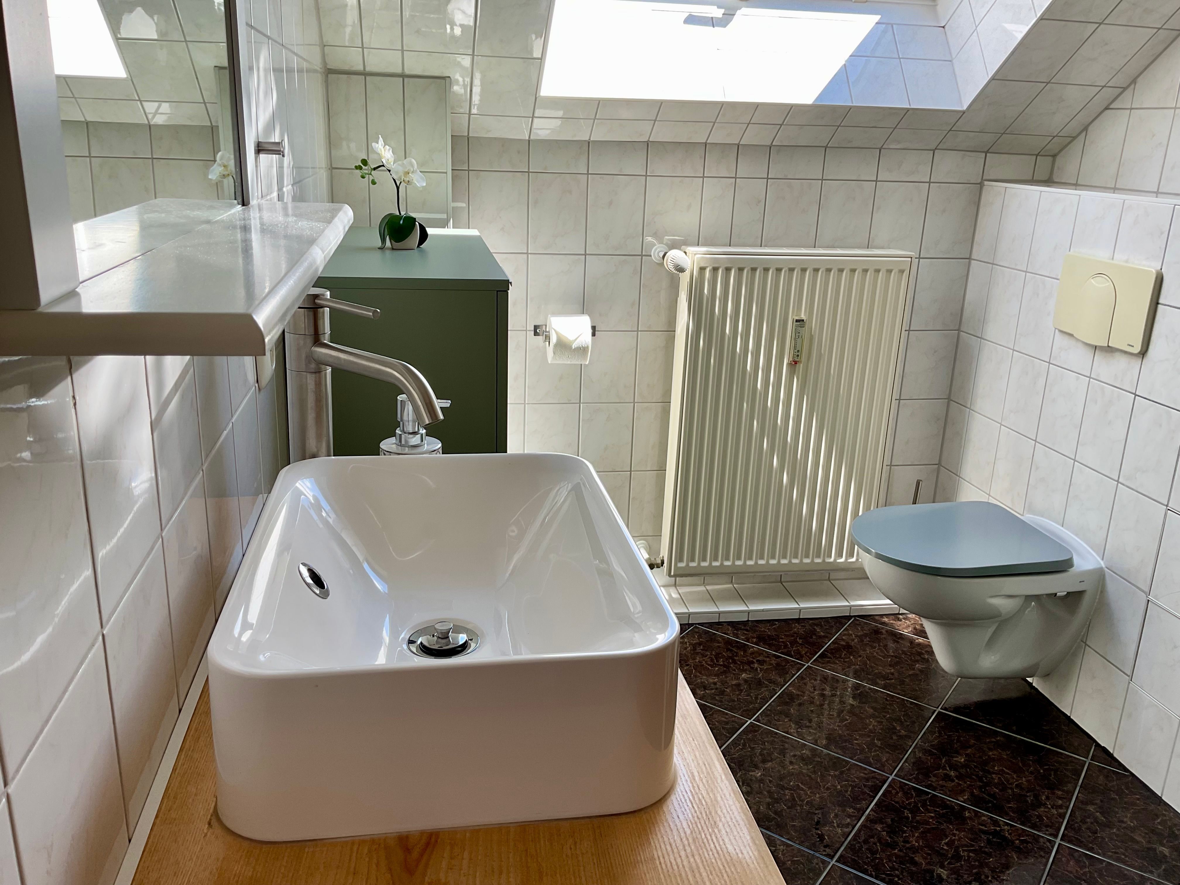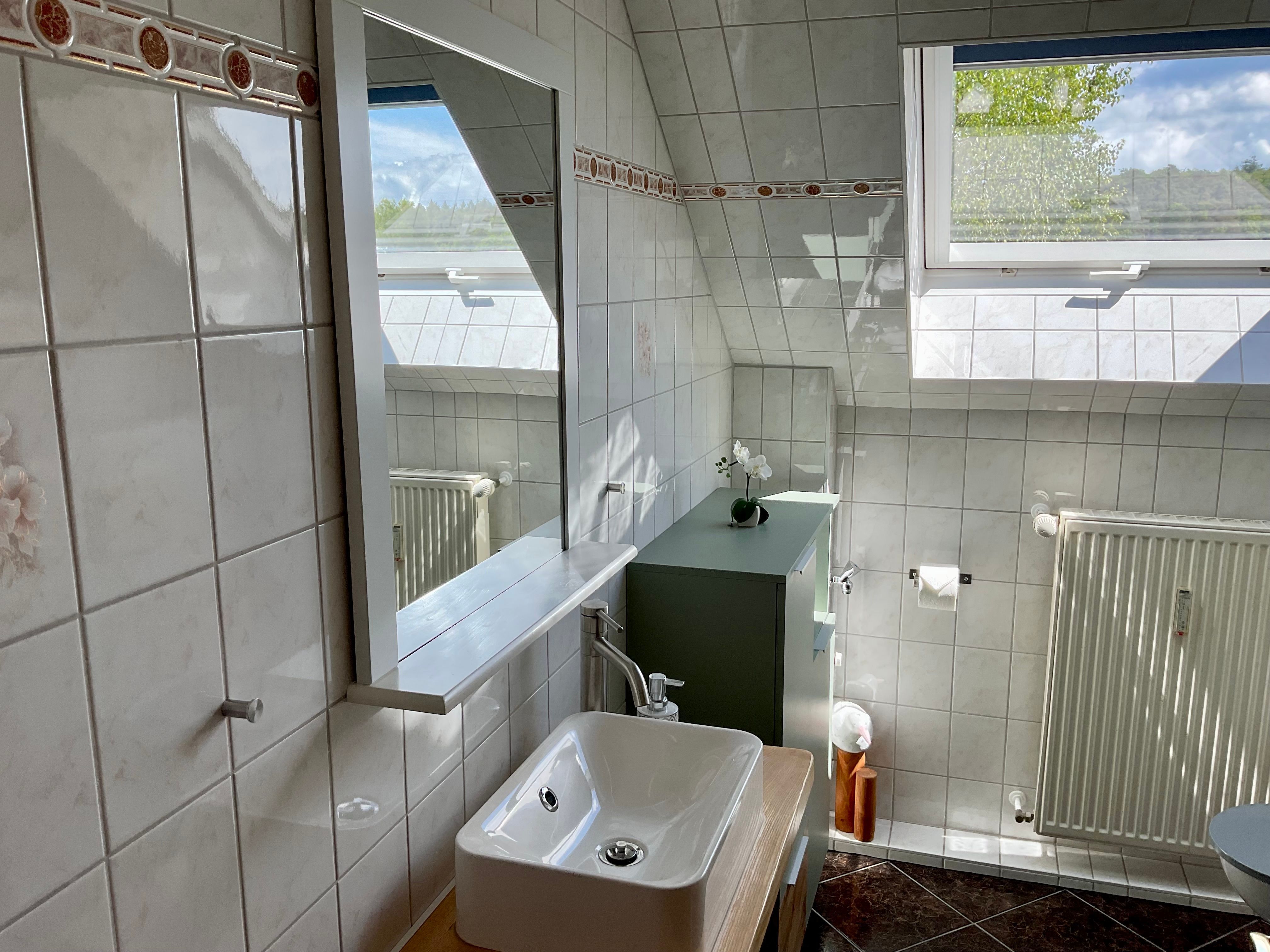 Das helle Tageslichtbad ist ausgestattet mit Dusche, Waschbecken, WC und Föhn für einen angenehmen Start in den Urlaubstag.