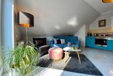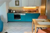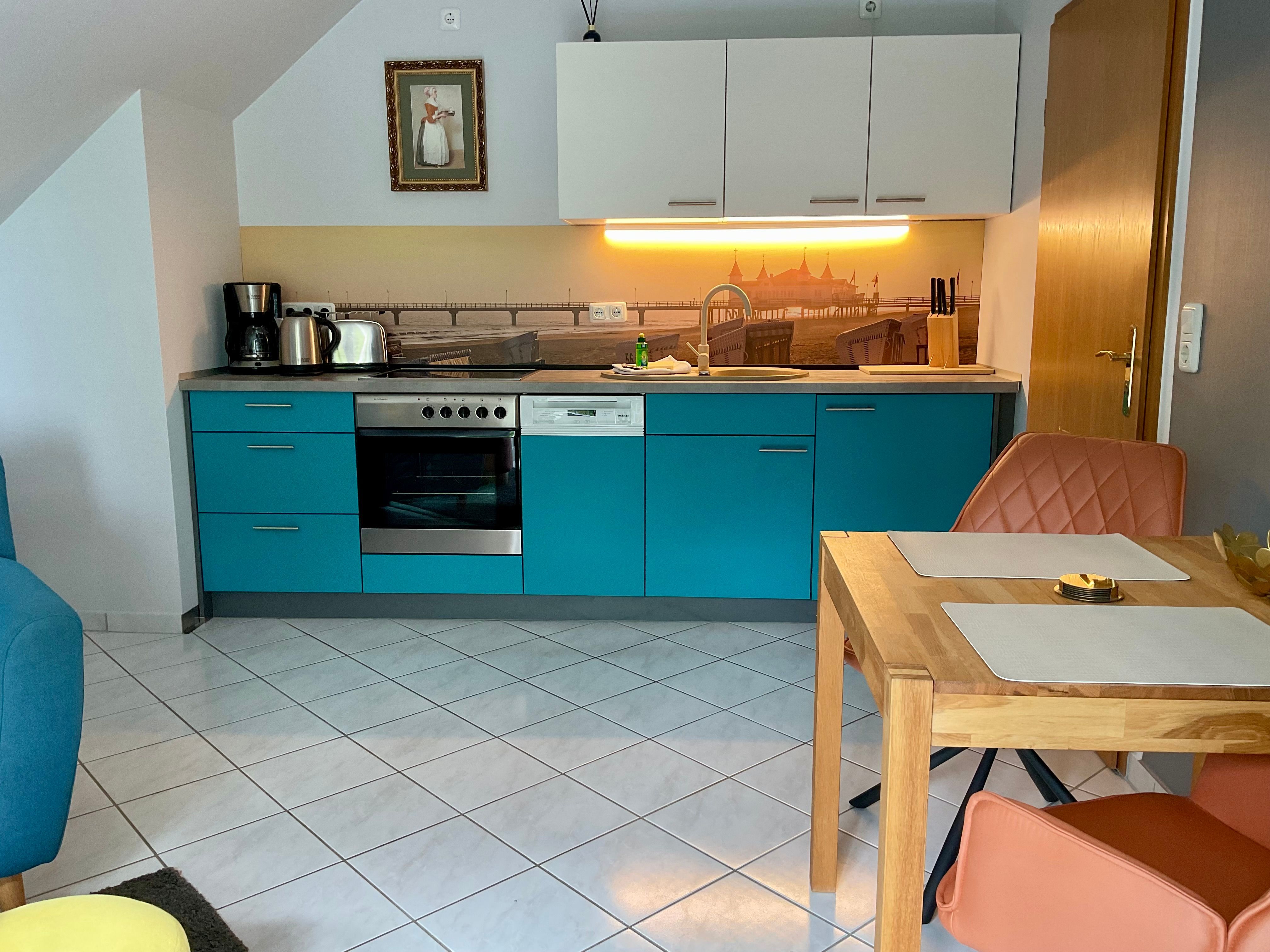 Die moderne, voll ausgestattete Einbauküche fügt sich harmonisch in den Wohnraum ein und lässt keine Wünsche offen: Cerankochfeld, Backofen, Geschirrspüler und Kühlschrank stehen Ihnen zur Verfügung.