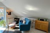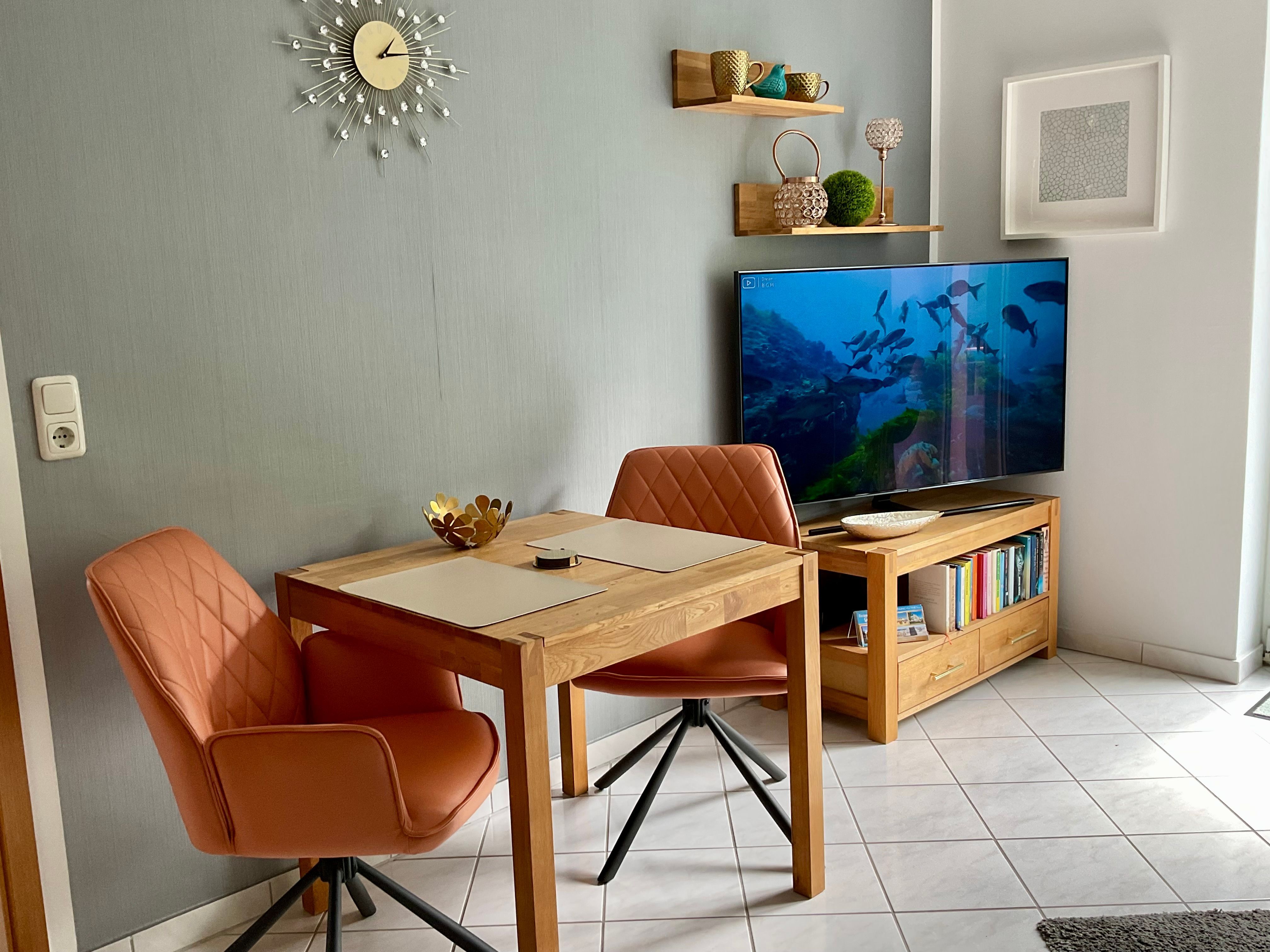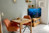 Genießen Sie die behagliche Atmosphäre im Wohnbereich mit komfortablem 2-Sitzer-Sofa, gemütlichem Sessel und einem Flat-TV. Der angrenzende Esstisch lädt zu einem entspannten Frühstück ein der perfekte Start in Ihren Urlaubstag.