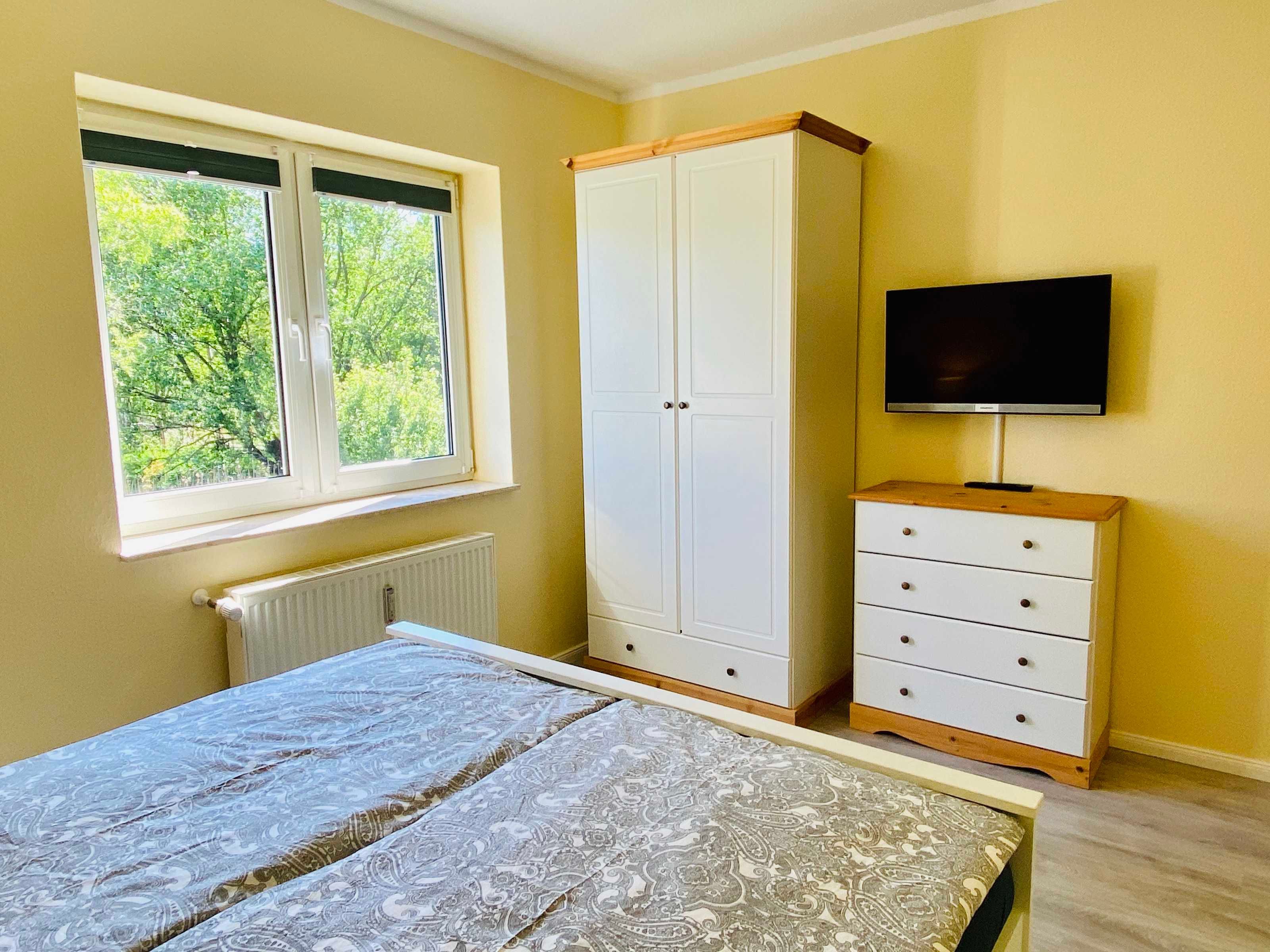 Im separaten Schlafzimmer erwartet Sie ein bequemes Doppelbett (160 x 200 cm), das bei Ihrer Anreise bereits bezogen ist. Viel Stauraum für Ihre Urlaubsgarderobe und ein zusätzlicher Flat-TV sorgen für höchsten Komfort.