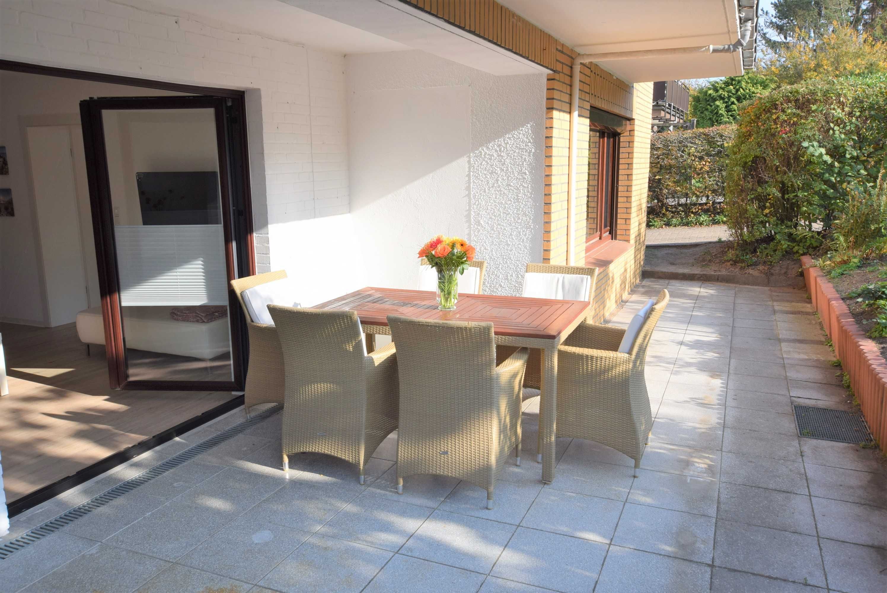 Die Wohnung für maximal 6 Personen (5. und 6. Person ist nur auf Anfrage mietbar) (90m ²) besteht aus einem Wohnzimmer mit Essbereich, einem Schlafzimmer mit Doppelbett, einem Schlafzimmer mit 2 jeweils ausziehbaren Einzelbetten, einer komplett ausgestatteten Küche, einem modernen Duschbad, einem separaten WC und einer sonnigen Terrasse inklusive Garten.