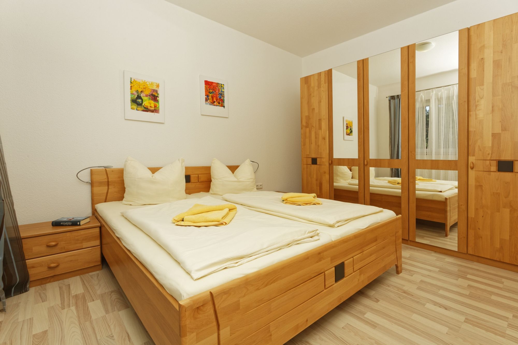 Das Schlafzimmer bietet einen gemütlichen Rückzugsort. Hier befinden sich ein gemütliches Doppelbett (180 x 200 cm) und ein geräumiger Schrank. In dem großzügigen Wohnzimmer befindet zudem sich eine Schlafcouch für eine zusätzliche Aufbettung. Durch Fernseher und Stereoanlage können Sie sich in der Wohnung entspannen. Zur Ausstattung der hochwertigen Einbauküche gehört ein Herd mit Backofen, Geschirrspüler sowie ein großer Kühlschrank mit Gefrierfach. Das moderne Bad mit Dusche ist mit Fußbodenheizung und einem elektrischen Handtuchtrockner ausgestattet. Auf dem Balkon können Sie ihre Mahlzeiten auch direkt im Sonnenschein genießen. Die gesamten Fenster wurden mit Jalousien versehen.