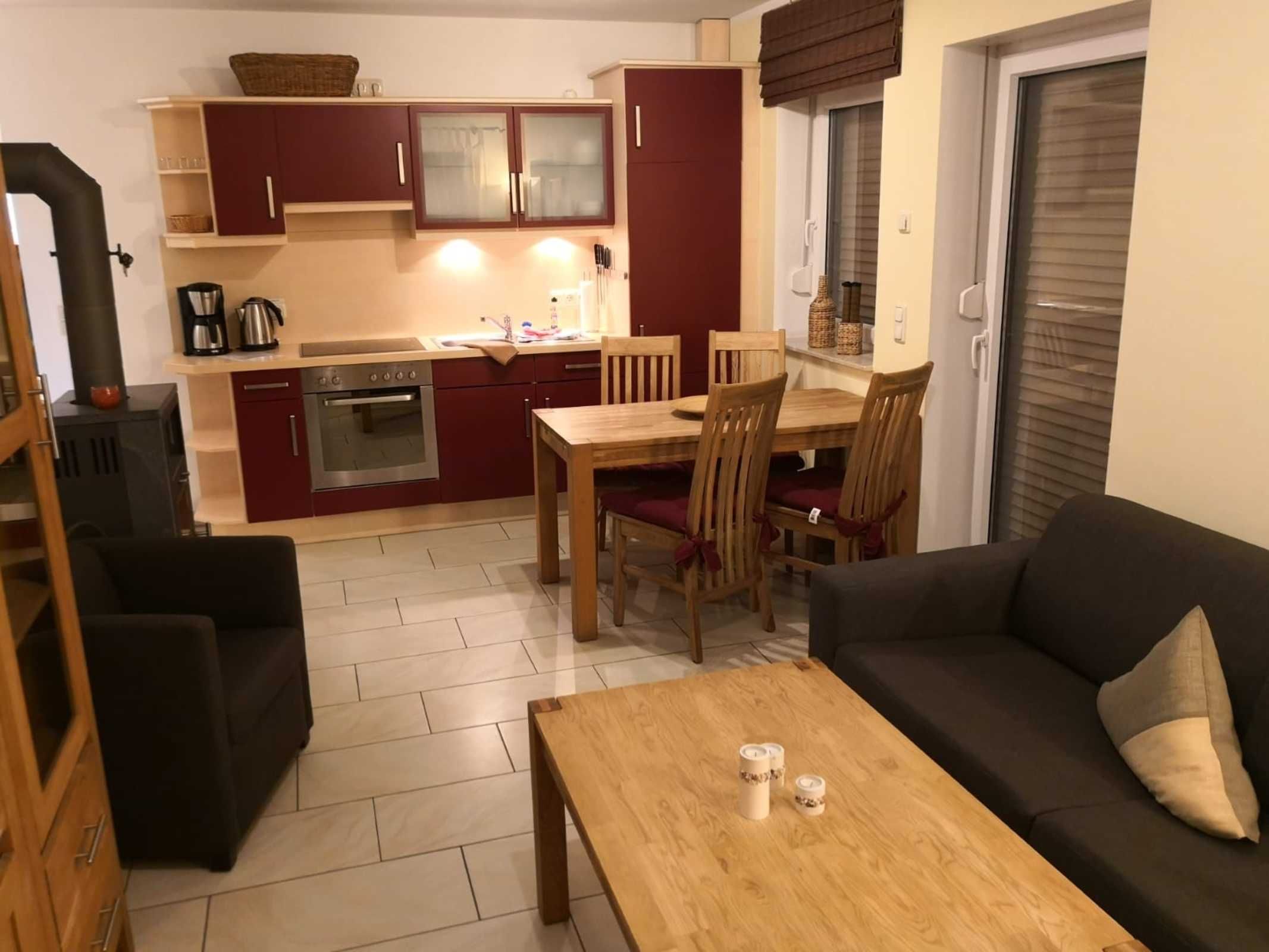 Unsere Nichtraucherwohnungen verfügen über einen großen Wohnraum mit integrierter Küche, Balkon oder Terrasse und separate, Schlafzimmer. Die Wohnungen haben Fußbodenheizung und für gemütliche Abende einen Kaminofen sowie einen Grillplatz und PKW-Stellplatz. Die Küchenzeile im Koch-Wohnbereich verfügt über alles, um sich im Urlaub selbst zu versorgen.