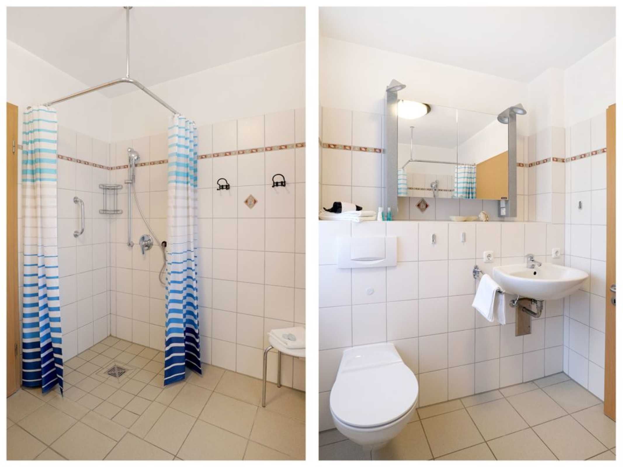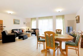 Die 71qm große 2 Zimmer- Ferienwohnung Nr. 3 in der Residenz am Teich ist barrierefrei, verfügt über eine Terrasse mit kleinem Garten und empfängt bis zu 2 Personen für einen entspannten Urlaub. Der großzügige Wohnbereich bietet den direkten Zugang auf die sonnige Terrasse. Die in den Wohnraum integrierte Küche ist ausgestattet mit Geschirrspüler, Herd mit Ceranfeld und Backofen, Dunstabzugshaube, Kühlschrank mit Gefrierfach. Kaffeemaschine, Wasserkocher, Toaster u.v.m. Ihre Speisen nehmen Sie an einem großen Esstisch ein. Im Wohnbereich befinden sich desweiteren ein bequemes Leder Sofa, Flachbild TV und auch ein Radio. In dem separaten Schlafzimmer mit Doppelbett und Kleiderschrank steht ein weiteres Fernsehgerät bereit. Zur Wohnung gehört ein geräumiges Duschbad, das mit einer ebenerdigen Dusche, Sitzhocker sowie WC ausgestattet ist. Innerhalb der Ferienwohnung befindet sich ein Abstellraum, in dem eine Waschmaschine und ein Wäschetrockner gegen Gebühr genutzt werden können. Direkt am Haus ist ein kostenfreier PKW Stellplatz für die Gäste der Wohnung Nr.3 reserviert. Es handelt sich bei diesem Feriendomizil um eine Nichtraucher-/ Haustier freie Unterkunft.