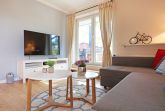 Diese hell und freundlich eingerichtete 55qm große 2-Zimmer-Wohnung liegt im Dachgeschoss des Mehrparteienhauses und bietet Ihnen genügend Platz für bis zu 4 Personen. Genießen Sie auf der umlaufenden Dachterrasse gemütliche Urlaubsstunden in den dort zur Verfügung stehenden 2 Strandkörben und lassen Sie die Seele baumeln. Im kombinierten modernen Wohn- und Essbereich verfügen Sie über ein wohnliches Schlafsofa für die entspannten Stunden, einen Flachbild-TV mit DVD-Player und einen Esstisch mit 4 Stühlen. Hier befindet sich auch der Zugang zur Dachterrasse. Das helle, großzügige Schlafzimmer ist mit einem Doppelbett und einem großen Kleiderschrank für Ihre Urlaubsgarderobe ausgestattet. Die separate Küche verfügt unter anderem über einen Herd, Backofen, Mikrowelle, Kaffeemaschine, Toaster, und Wasserkocher.