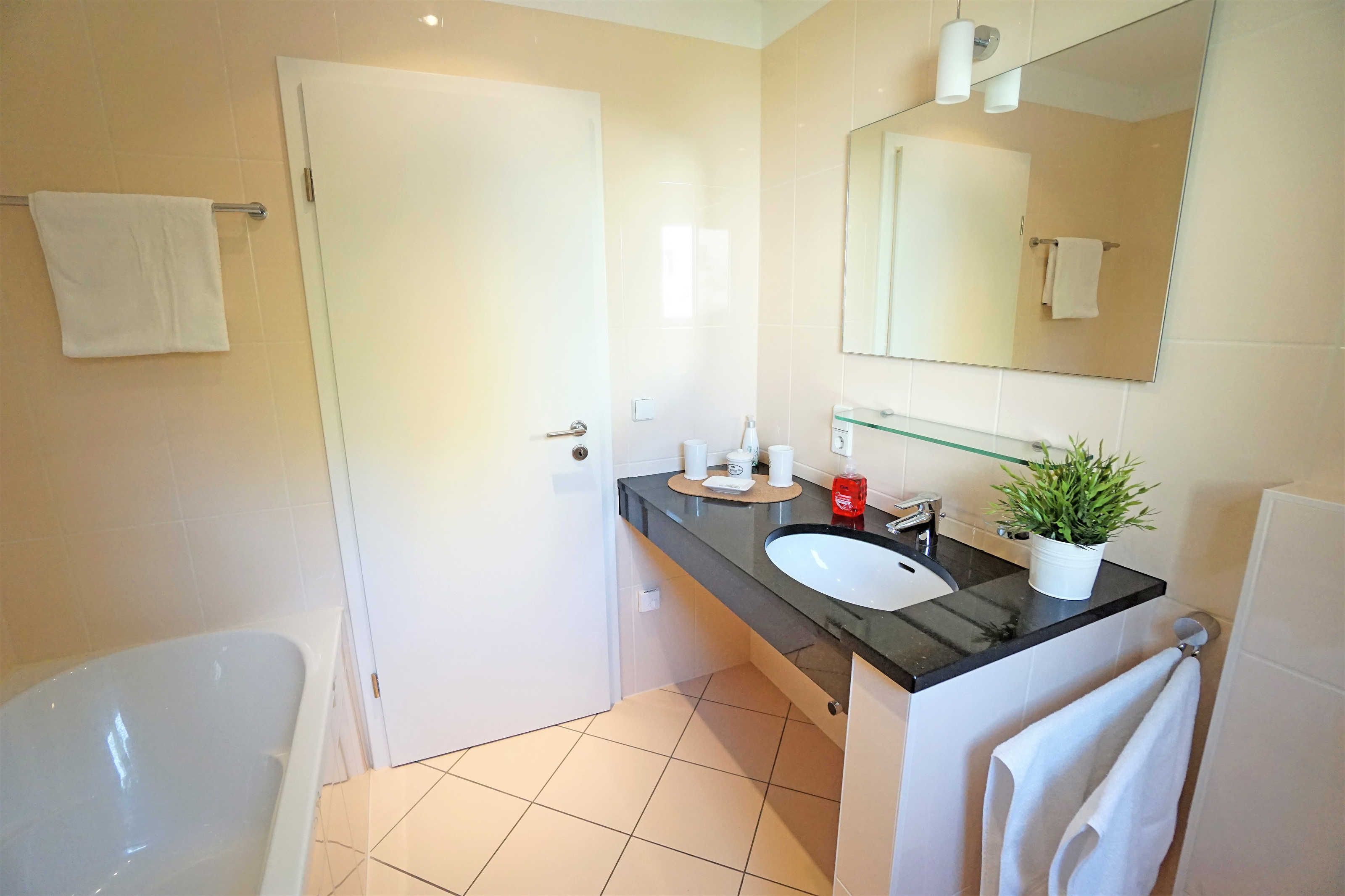 Die hochwertig eingerichtete 3-Zimmer Ferienwohnung (65m²) befindet sich im Hochparterre des Hauses Villa Marlen. Das geräumige Wohnzimmer mit offener, vollausgestatteter Küchenzeile, großem Esstisch und gemütlicher Couch lässt keine Wünsche offen. Vom Wohnzimmer aus erreicht man den großen Balkon mit einer Treppe zum Grundstück. Zwei Schlafzimmer mit jeweils einem großen Doppelbett (180x200) und einem großen Kleiderschrank bieten genug Platz für bis zu 4 Personen. Eines der beiden Schlafzimmer hat einen eigenen Balkon. Unter anderem verfügt diese Ferienwohnung über ein Duschbad und einem weiteren Badezimmer mit Badewanne.
