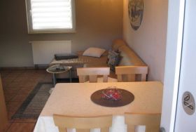 3-Zimmer-Ferienappartment über 2 Etagen mit Terrasse, ca. 55m², Bad mit Dusche und WC, voll ausgestattete Küche, hochwertige und moderne Möblierung, 1 Schlafzimmer mit Doppelbett, 1 Schlafzimmer mit zwei Einzelbetten. Sehr gute Polsterbetten. PKW-Stellplatz, Grill, Herd mit Ceranfeld, Mikrowelle, Kühlschrank mit Gefrierfach, Kaffeemaschine, Wasserkocher, Toaster, Geschirr komplett für 4 Personen, Waschen auf Anfrage. Radio, Kabel-TV, W-LAN kostenlos