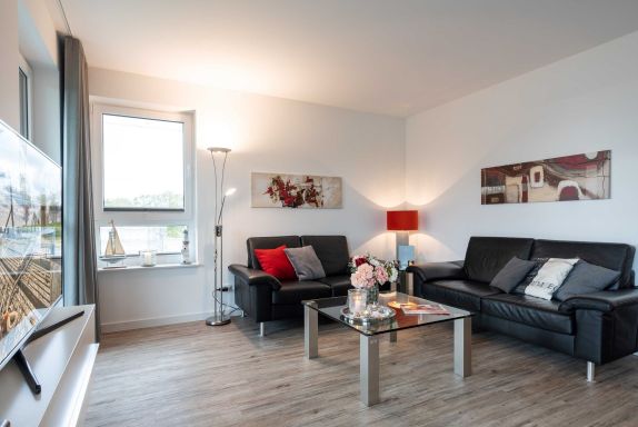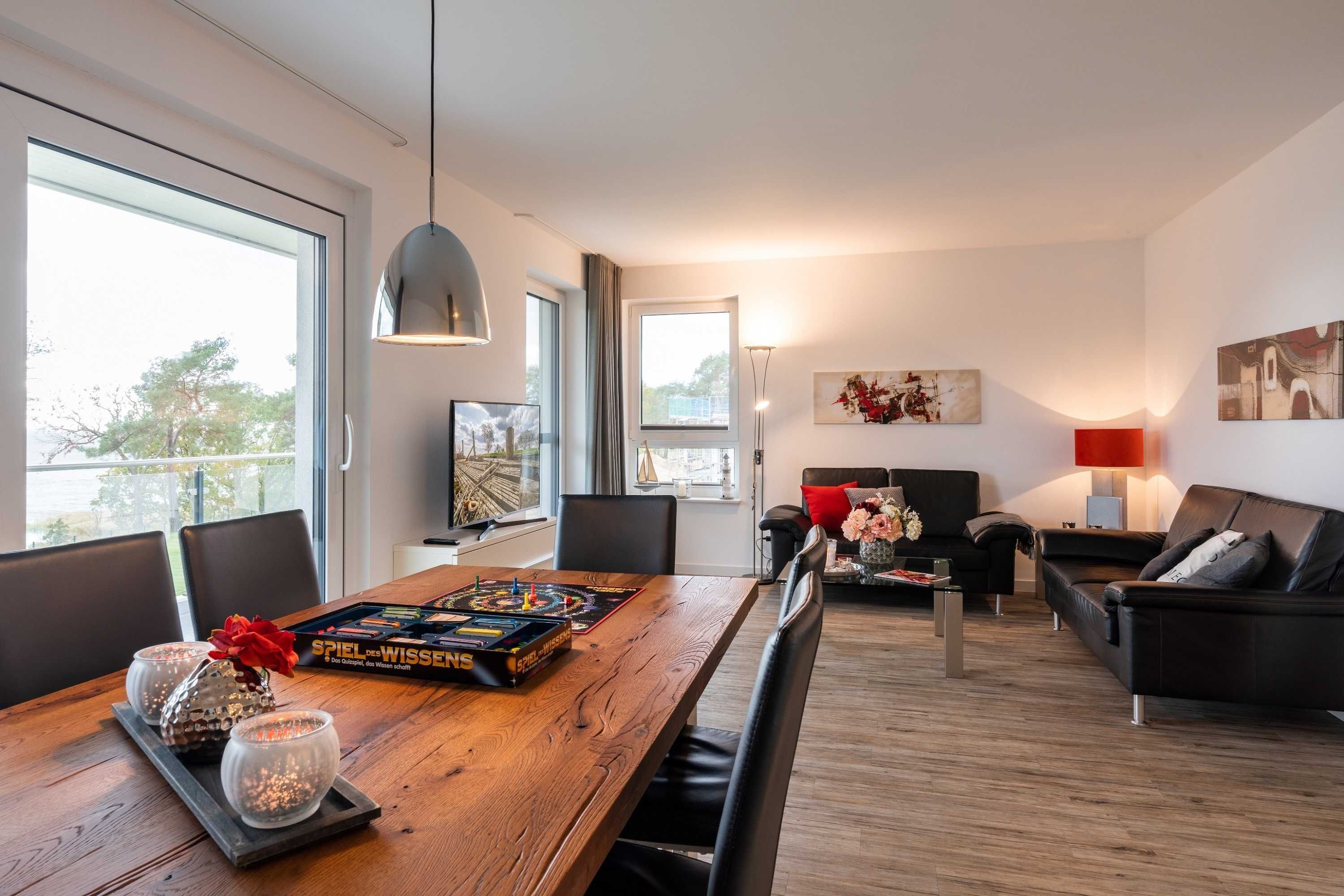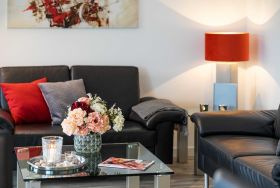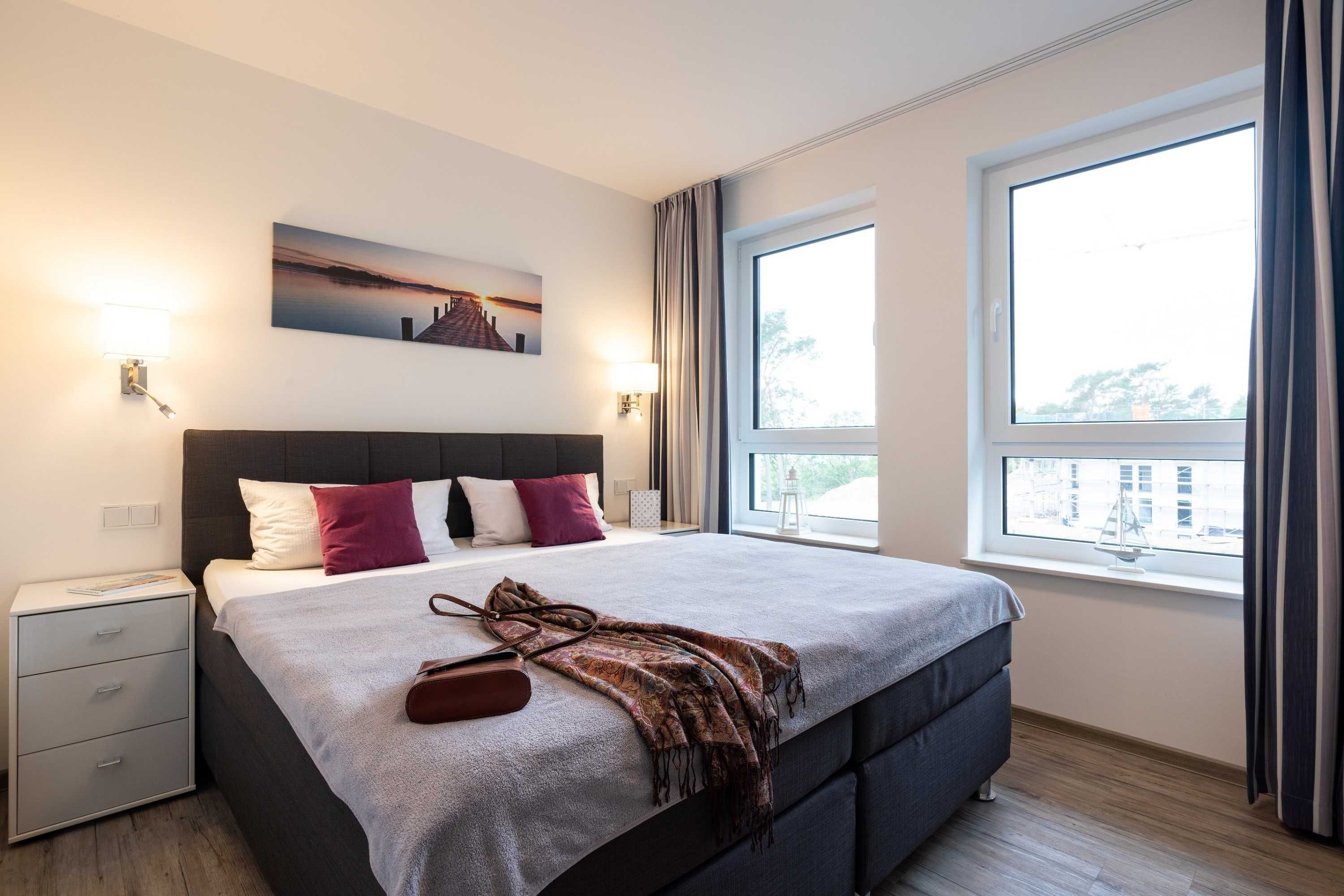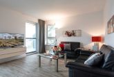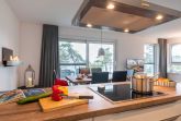 Diese lichtdurchflutete, helle 3-Zimmer-Wohnung im obersten Geschoss von Haus 2 (Aufzug vorhanden) mit Platz für maximal 4 Personen sowie einem Kleinkind bis 2 Jahre im Babybett verfügt über eine Wohnfläche von 94 m² und hat 2 Schlafzimmer sowie 2 voll ausgestattete Duschbäder. Die große Sonnenterrasse mit 17 m² liegt in idealer Süd-Ausrichtung. Die Wohnung ist modern eingerichtet mit offenem Wohn-Essbereich, großem Esstisch, Ledersofa sowie Flat-TV (inkl. Sky-Abo). Die hochwertig ausgestattete Küche, offen zum Wohnbereich, lässt keine Wünsche offen. Erholsamer Schlaf in den beiden Schlafzimmern mit Boxspringbetten und Flat-TV ist garantiert. Das Badezimmer en Suite ist mit einer begehbaren Dusche ausgestattet. Auf dem großen, überdachten Sonnenbalkon mit Essgruppe und zwei Relax-Sesseln, Fußhockern sowie einem Sonnenschirm können Sie die Seele baumeln lassen.