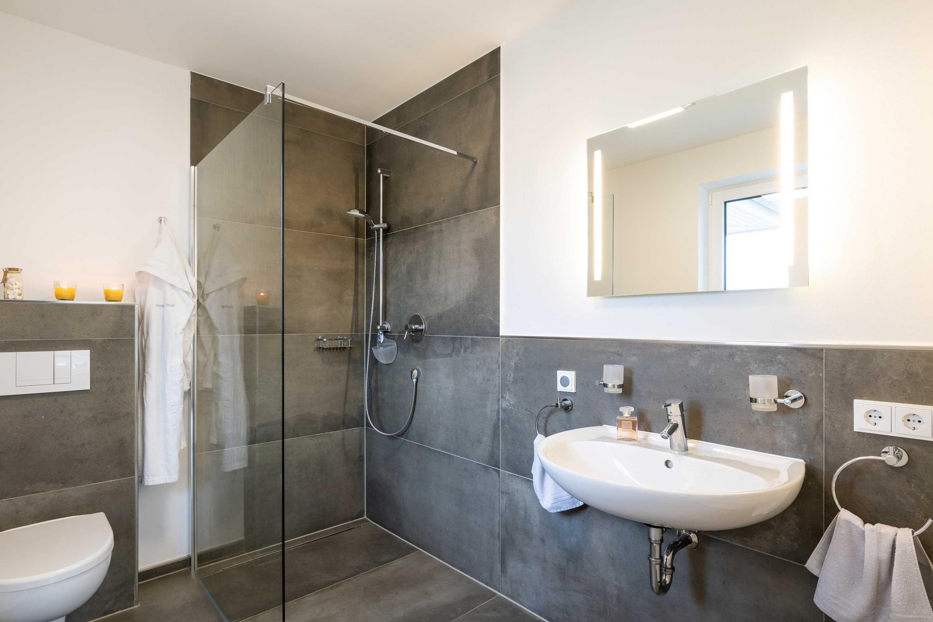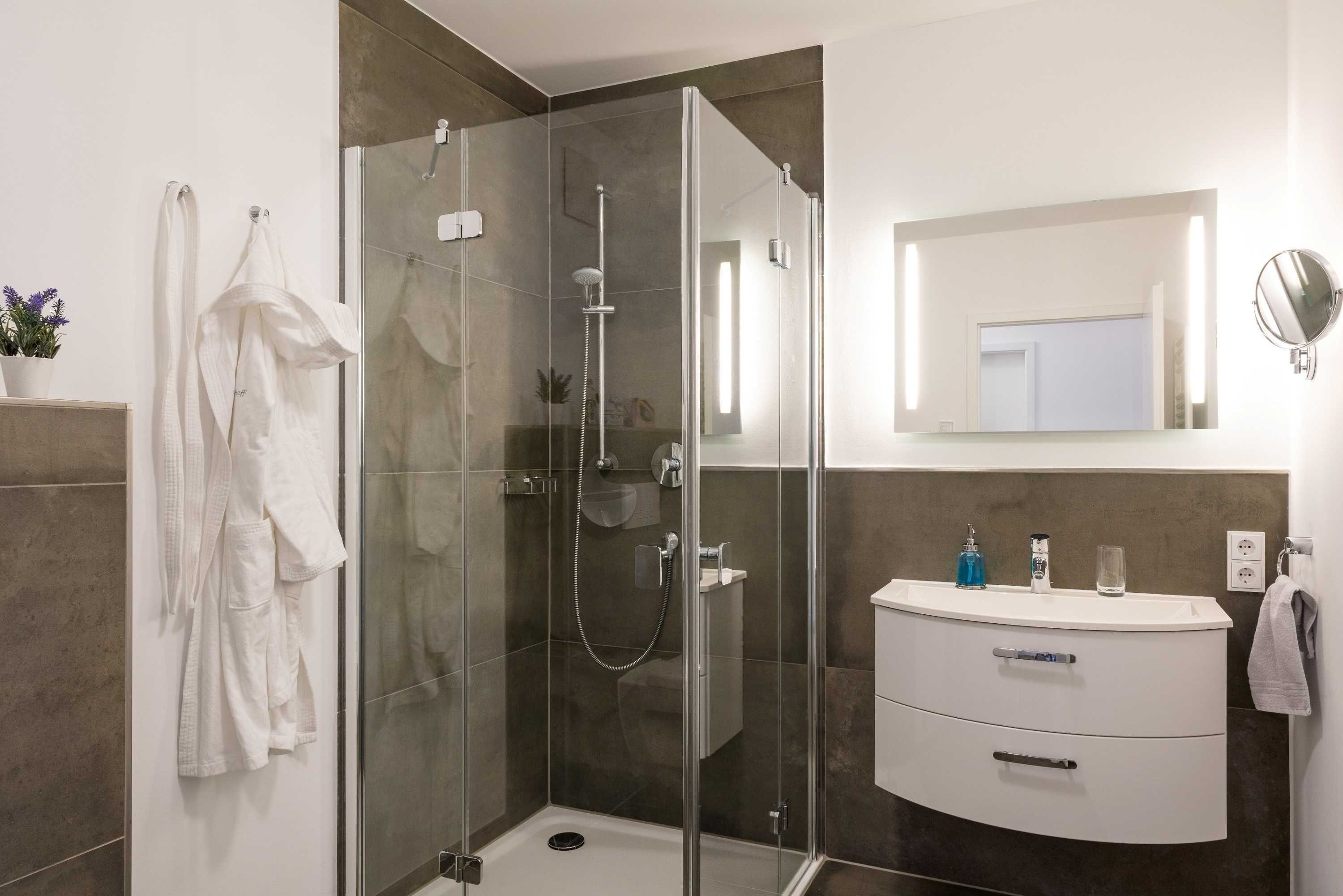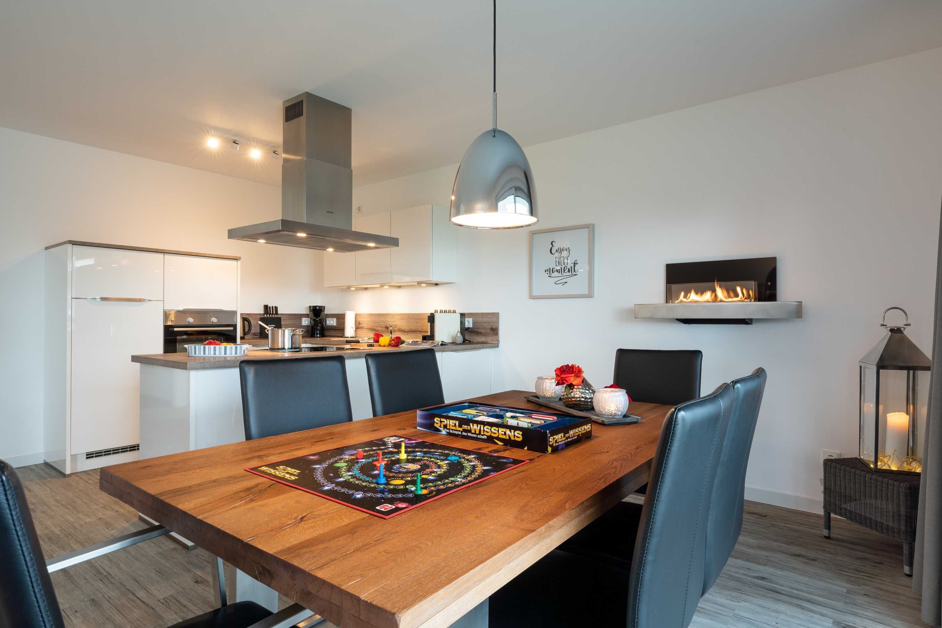 Diese lichtdurchflutete, helle 3-Zimmer-Wohnung im obersten Geschoss von Haus 2 (Aufzug vorhanden) mit Platz für maximal 4 Personen sowie einem Kleinkind bis 2 Jahre im Babybett verfügt über eine Wohnfläche von 94 m² und hat 2 Schlafzimmer sowie 2 voll ausgestattete Duschbäder. Die große Sonnenterrasse mit 17 m² liegt in idealer Süd-Ausrichtung. Die Wohnung ist modern eingerichtet mit offenem Wohn-Essbereich, großem Esstisch, Ledersofa sowie Flat-TV (inkl. Sky-Abo). Die hochwertig ausgestattete Küche, offen zum Wohnbereich, lässt keine Wünsche offen. Erholsamer Schlaf in den beiden Schlafzimmern mit Boxspringbetten und Flat-TV ist garantiert. Das Badezimmer en Suite ist mit einer begehbaren Dusche ausgestattet. Auf dem großen, überdachten Sonnenbalkon mit Essgruppe und zwei Relax-Sesseln, Fußhockern sowie einem Sonnenschirm können Sie die Seele baumeln lassen.