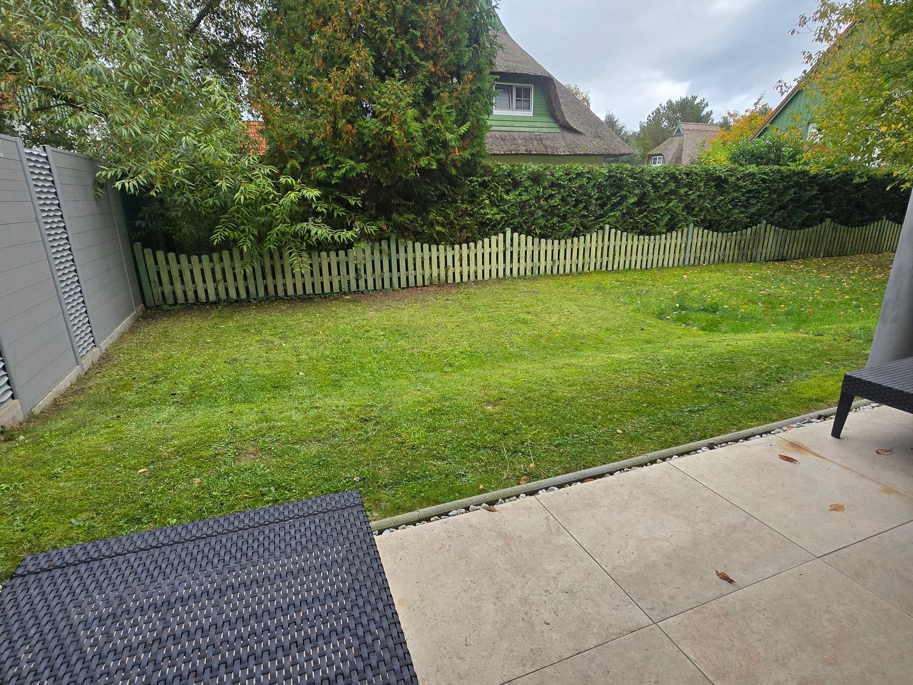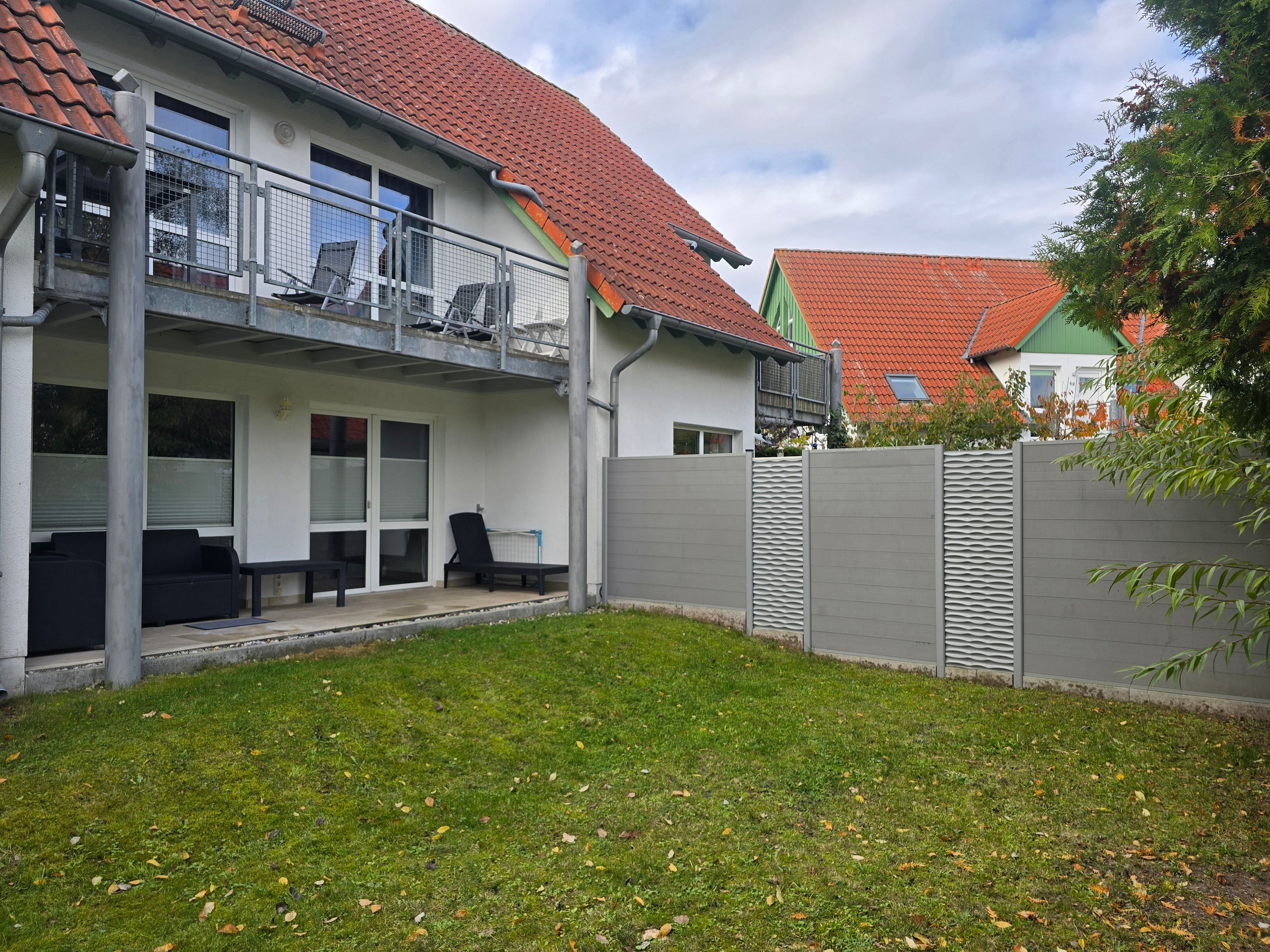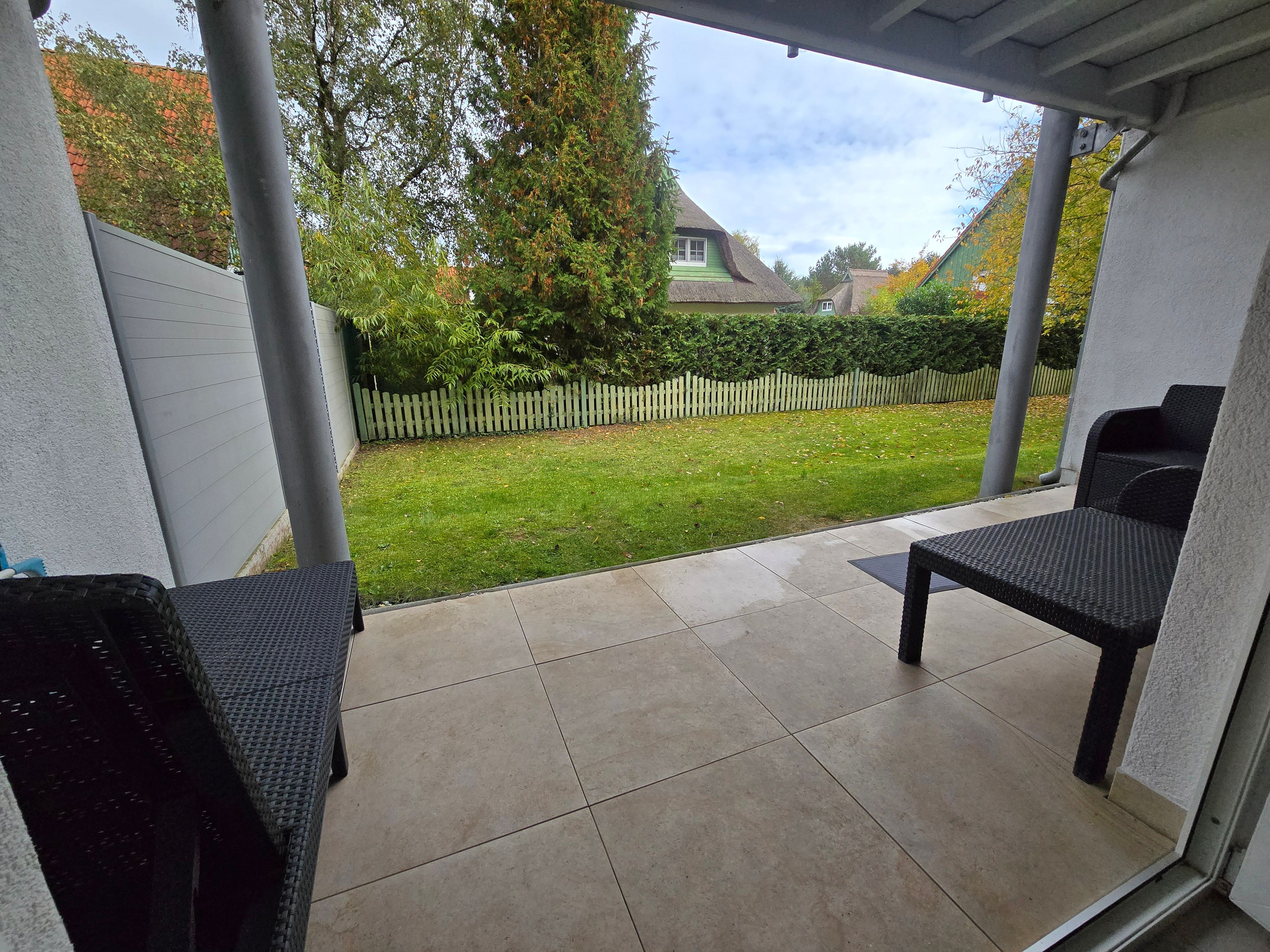 Die Ferienwohnung Strandgold verfügt über eine überdachte Terrasse, auf welcher Sitzmöbel und ein Tisch vorhanden sind. Der kleine Gartenbereich wird durch Hecken, welche hervorragenden Sichtschutz bieten, abgegrenzt.