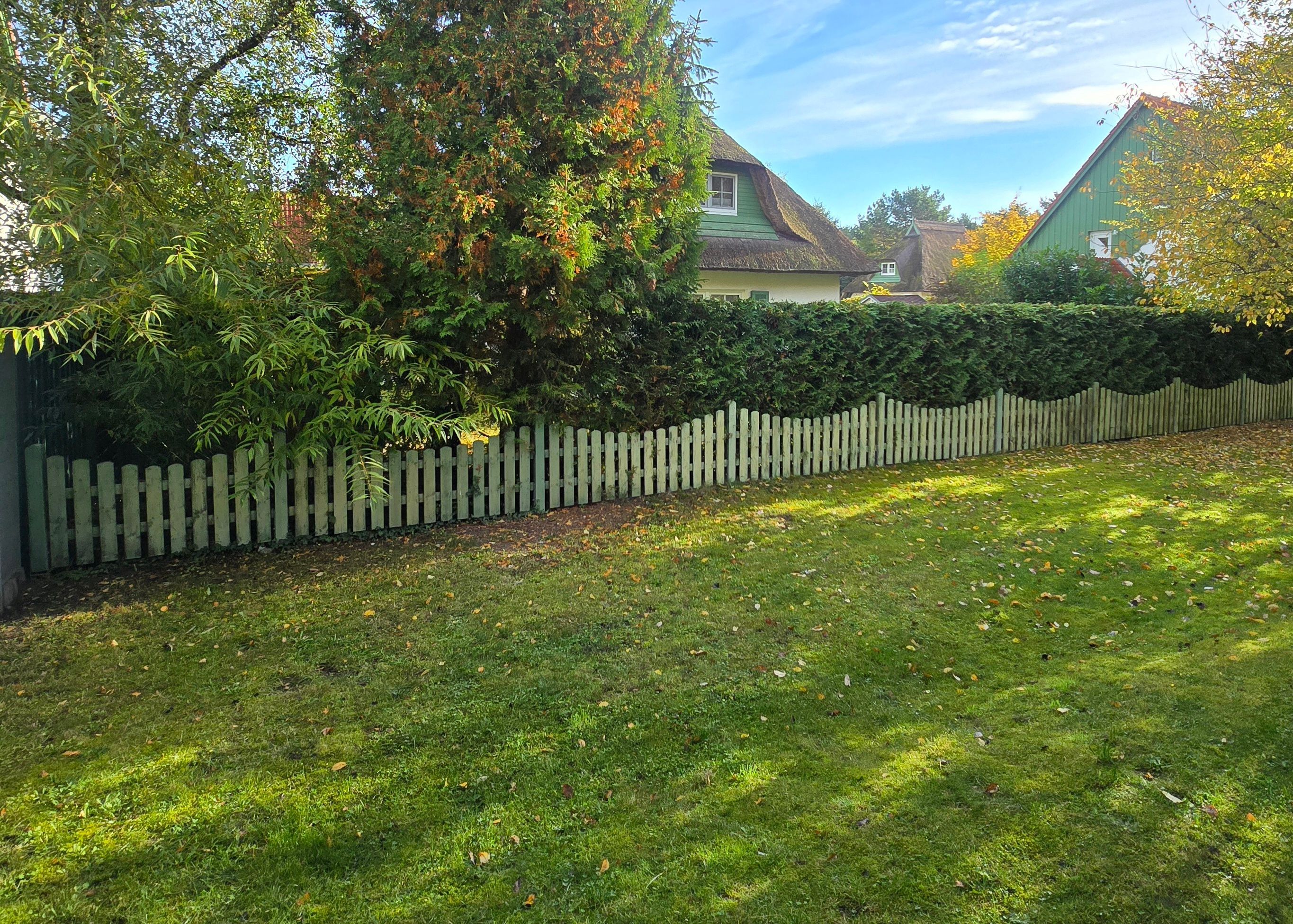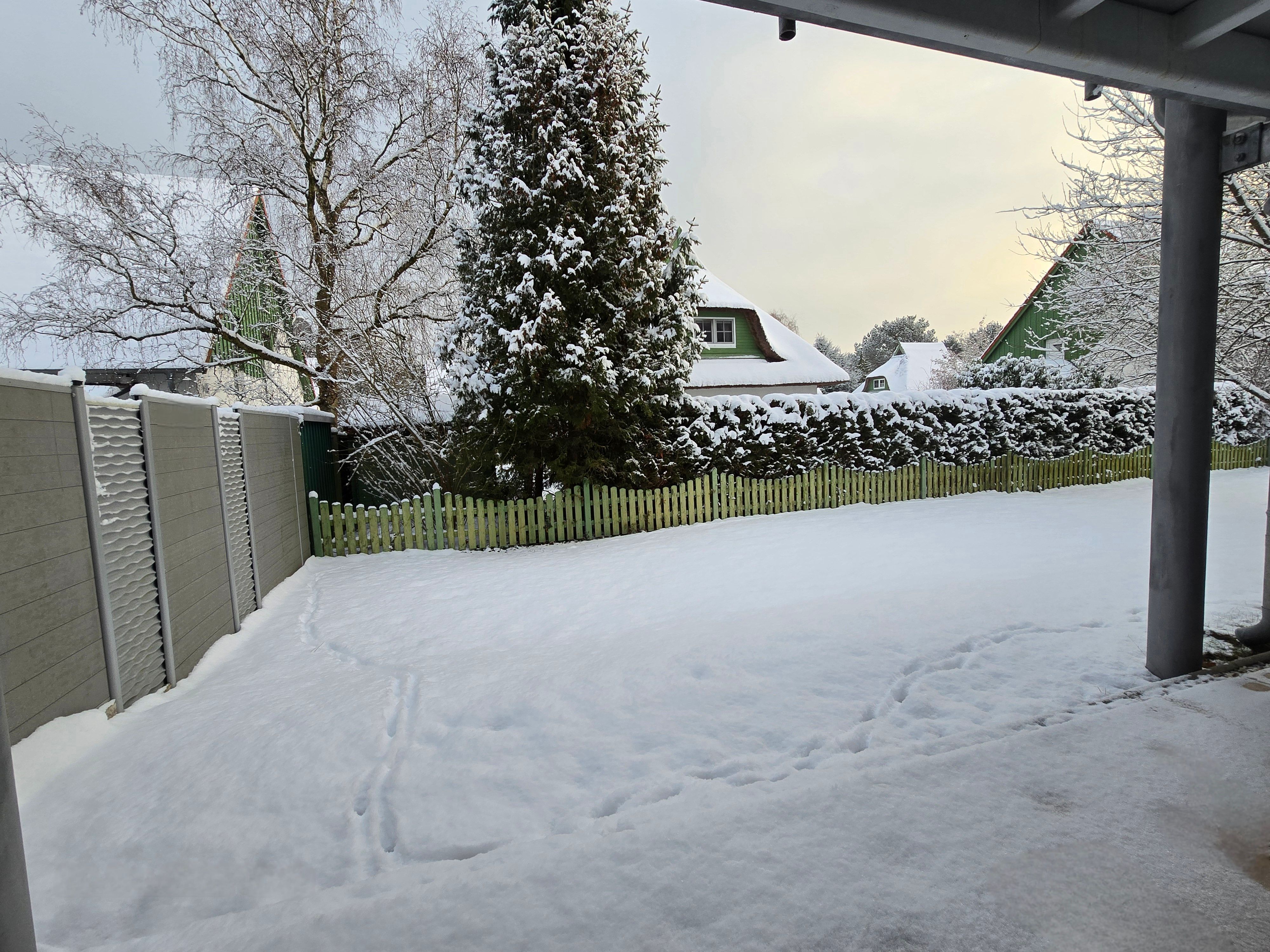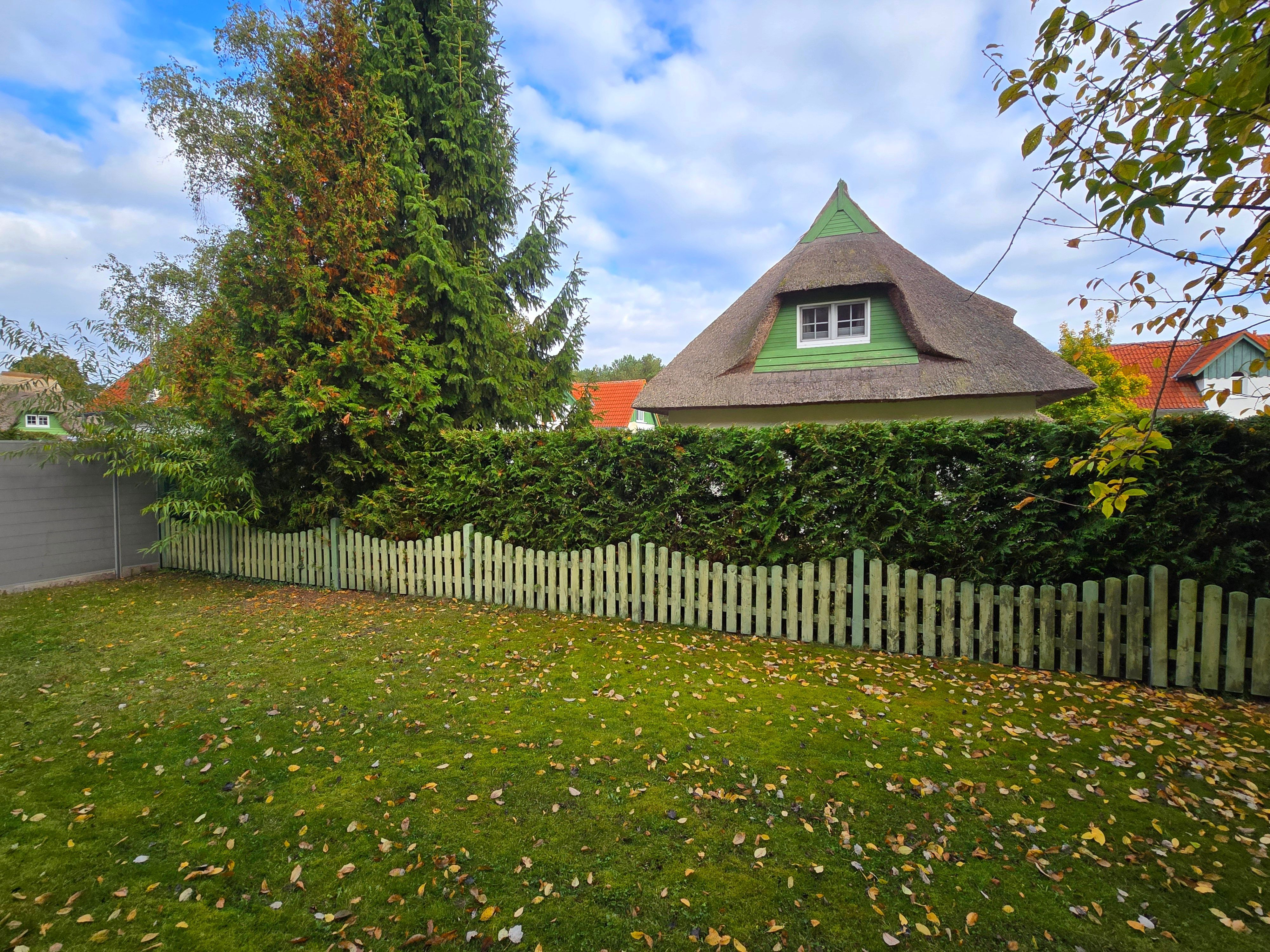 Die Ferienwohnung Strandgold verfügt über eine überdachte Terrasse, auf welcher Sitzmöbel und ein Tisch vorhanden sind. Der kleine Gartenbereich wird durch Hecken, welche hervorragenden Sichtschutz bieten, abgegrenzt.