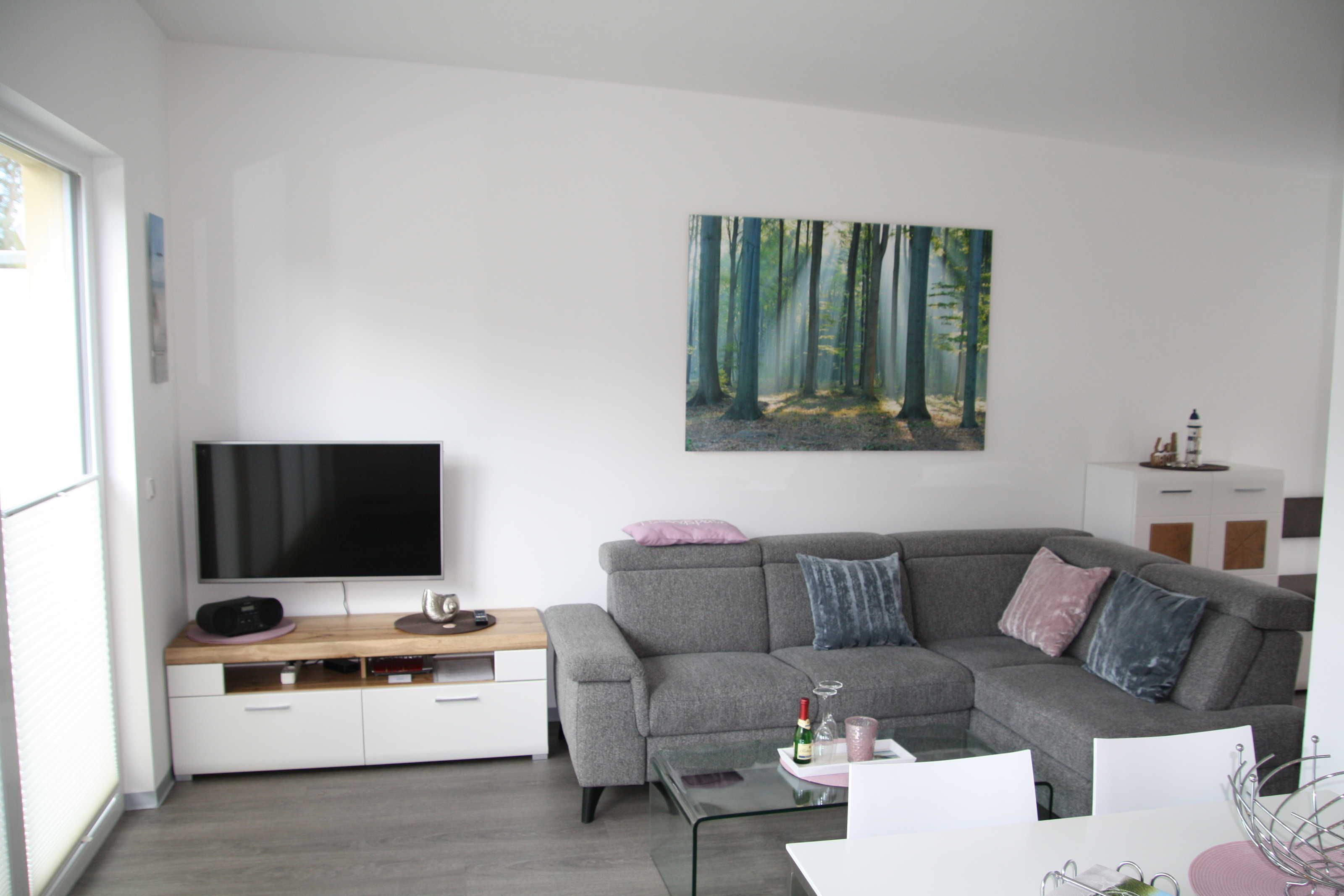 • Den Wohnraum haben wir Ihnen mit einer gemütlichen Sofaeckgarnitur ausgestattet. Ein Fernseh-/Lesesessel steht für Sie zum Entspannen bereit. Ferner finden Sie dort einen hochwertigen Flachbild-TV und eine Radio-CD-Kombination vor. Selbstverständlich ist die Wohnung mit WLAN ausgerüstet und ans Glasfasernetz angeschlossen.