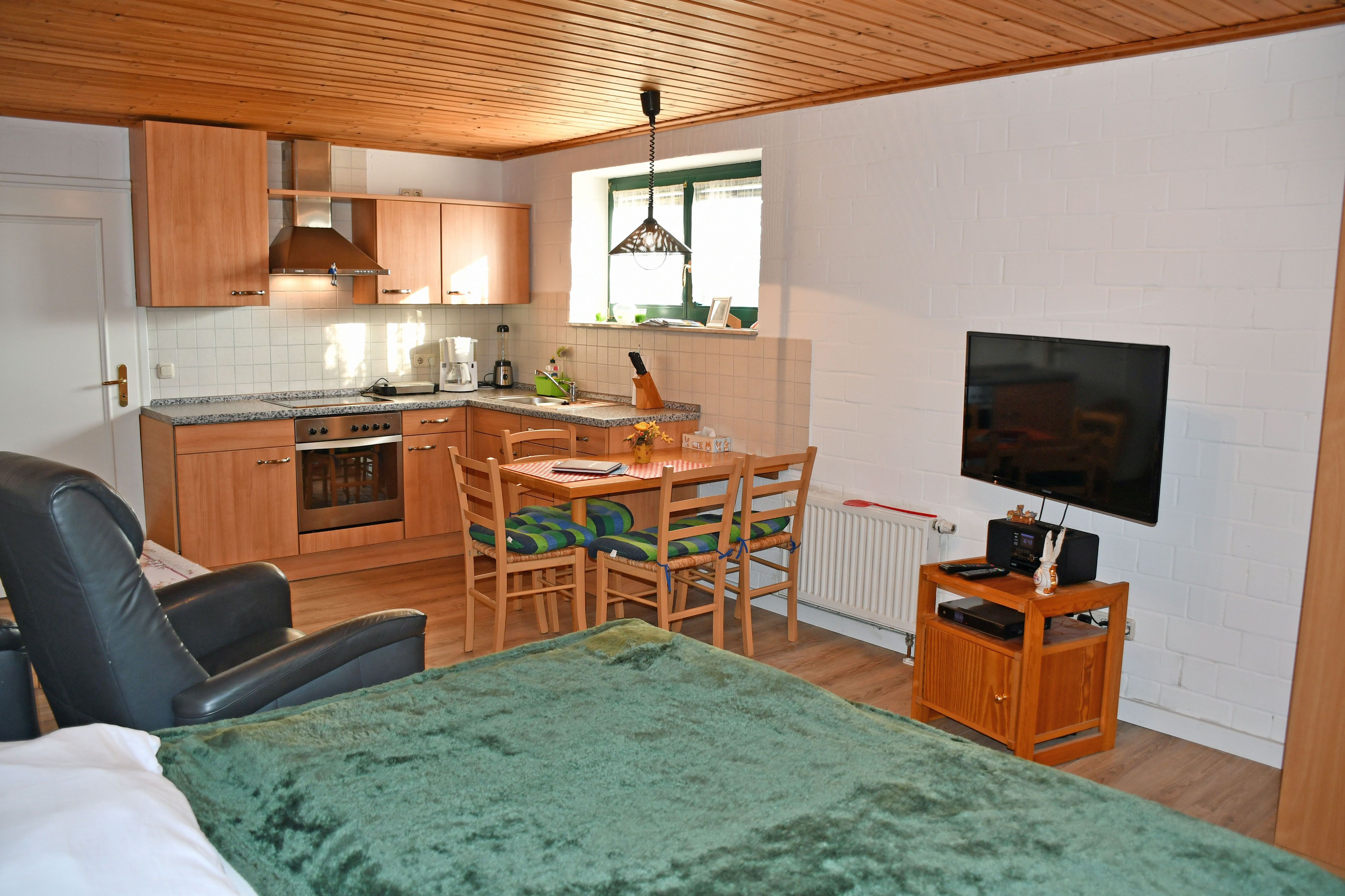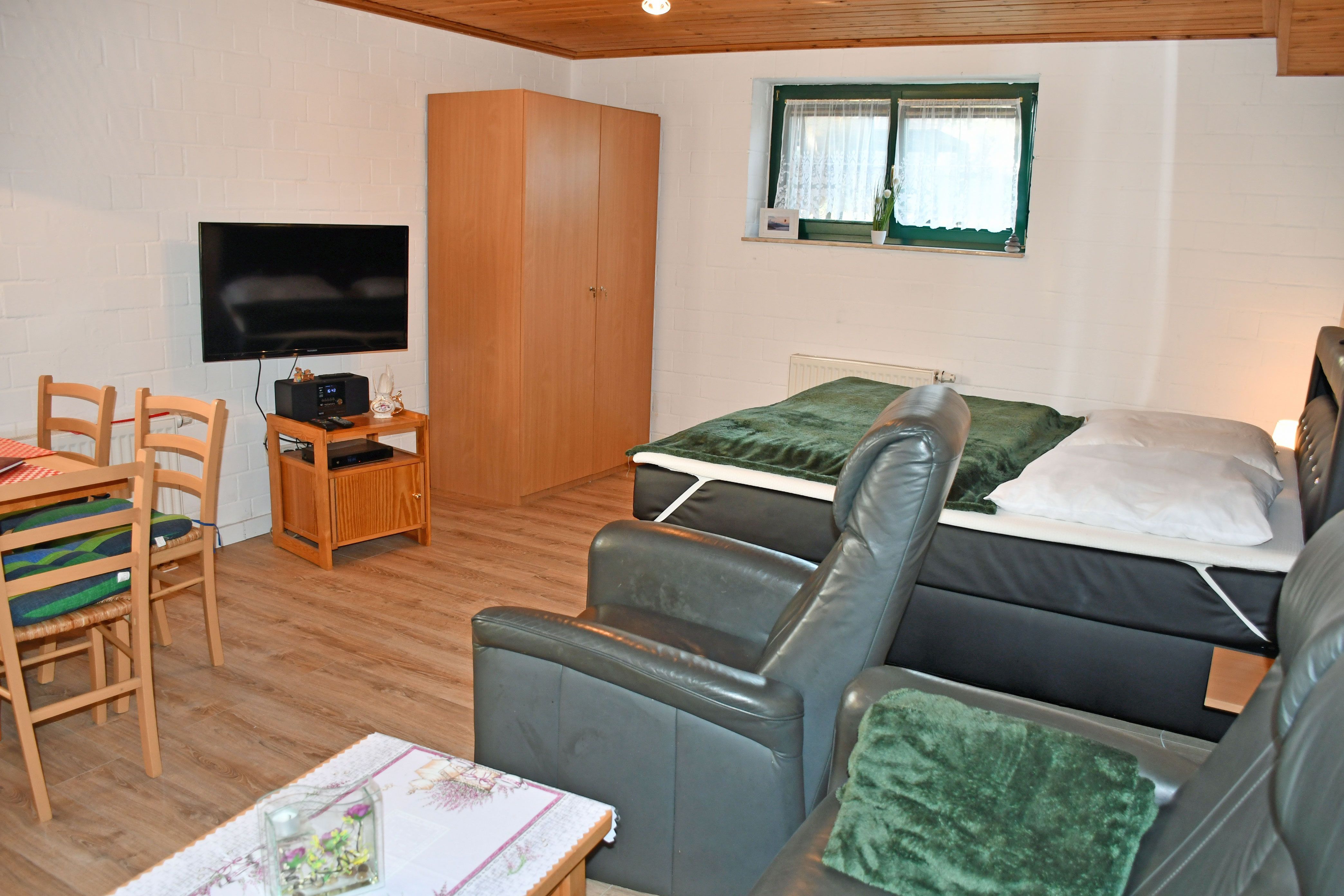 Wir vermieten hier eine modern und liebevoll eingerichtete Ferienwohnungen (1 Wohn-/Schlafzimmer, 1 Schlafzimmer, Küchenzeile, Dusche/WC, WLAN, Terrasse mit Gartenmöbeln, Soutterain) für 4 Gäste.