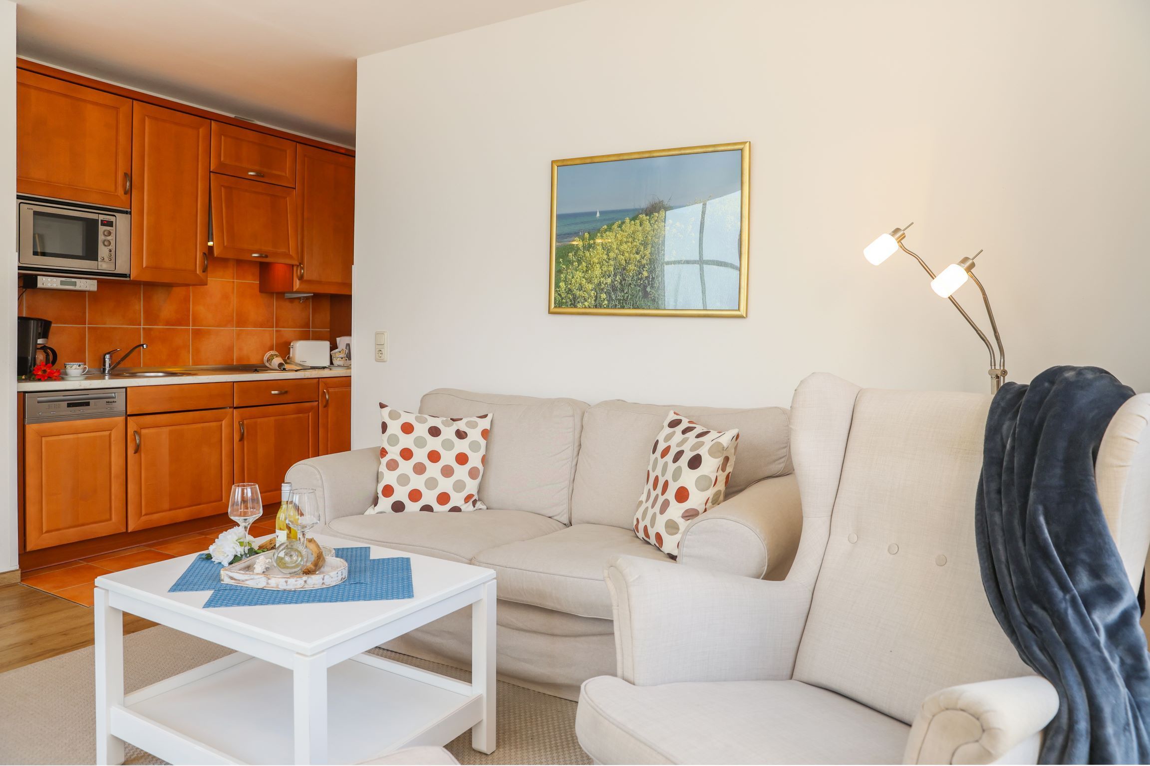 Nur 10 m vom Strand wohnen Sie in einer modern eingerichteten 3-Raum-Ferienwohnung. Die 63 qm große Wohnung liegt in der 4. Etage. Das Wohnzimmer ist mit einer Schlafcouch, Couchtisch, zwei Sessel, Anrichte, Kabel-TV, Radio, Essbereich (Esstisch und 4 Stühle) und Küchenzeile ausgestattet. Das französische Fenster bietet einen freien Blick auf die Ostsee. Im Schlafzimmer stehen ein Doppelbett und ein Kleiderschrank und im Gästezimmer ein Ausziehbares Bett und ein Wäscheschrank. Die Küchenzeile wurde modern ausgestaatet mit Mikrowelle, Kühlschrank, Kaffeemaschine, Zweiplattenkochfeld, Geschirrspüler, Toaster und Wasserkocher. Das Bad mit Dusche/WC und der Flur mit Garderobe komplettieren die Wohnung.