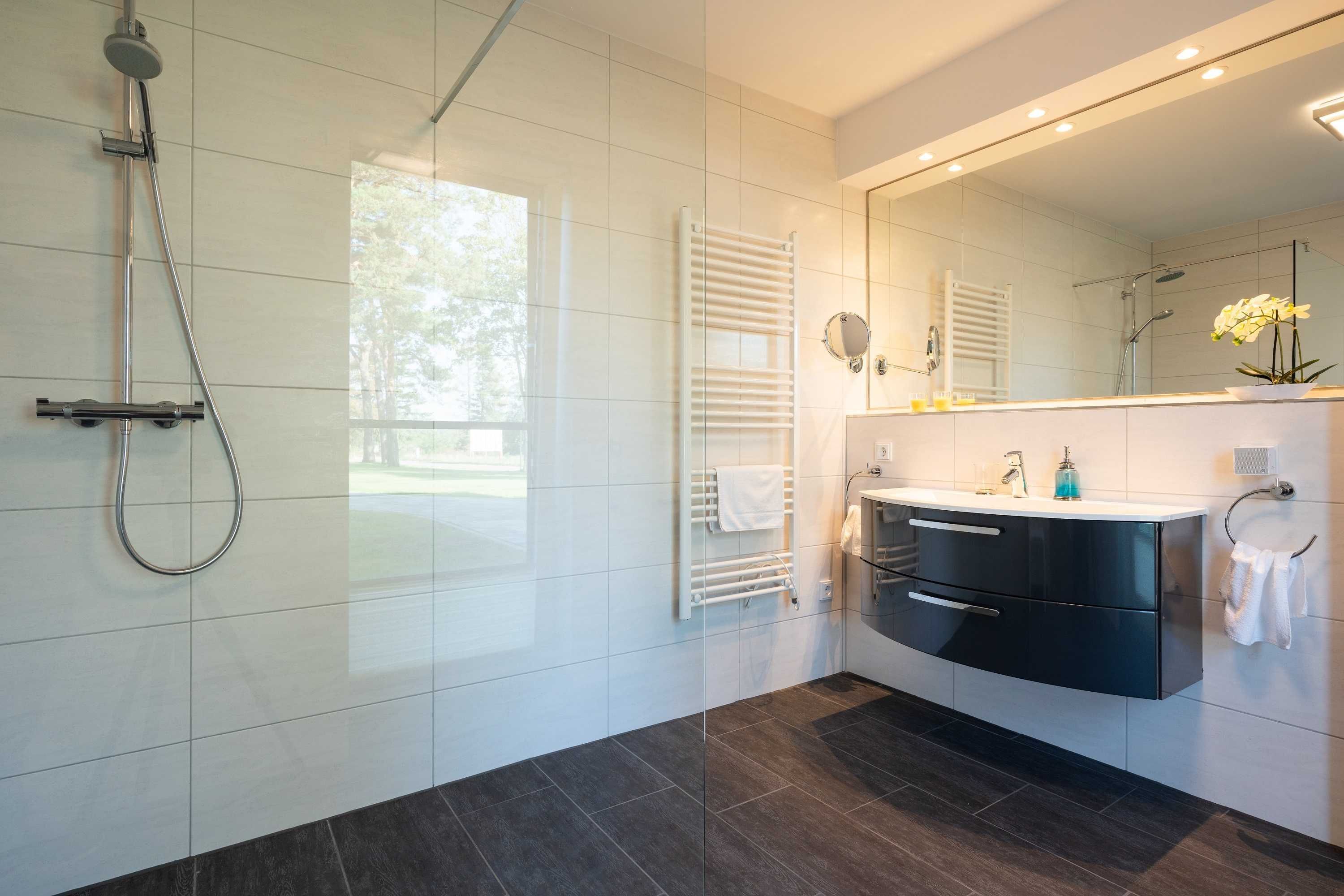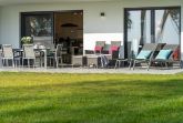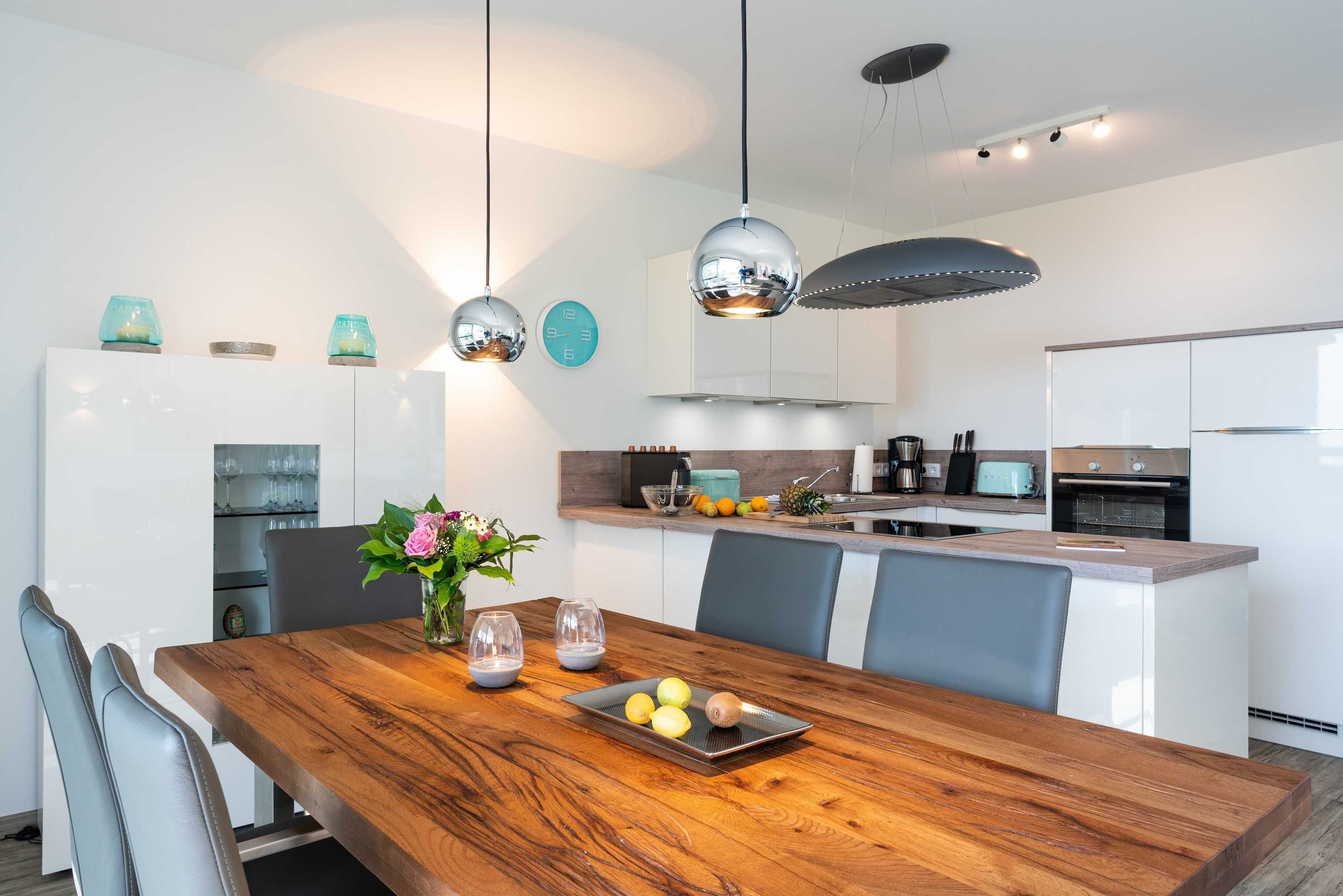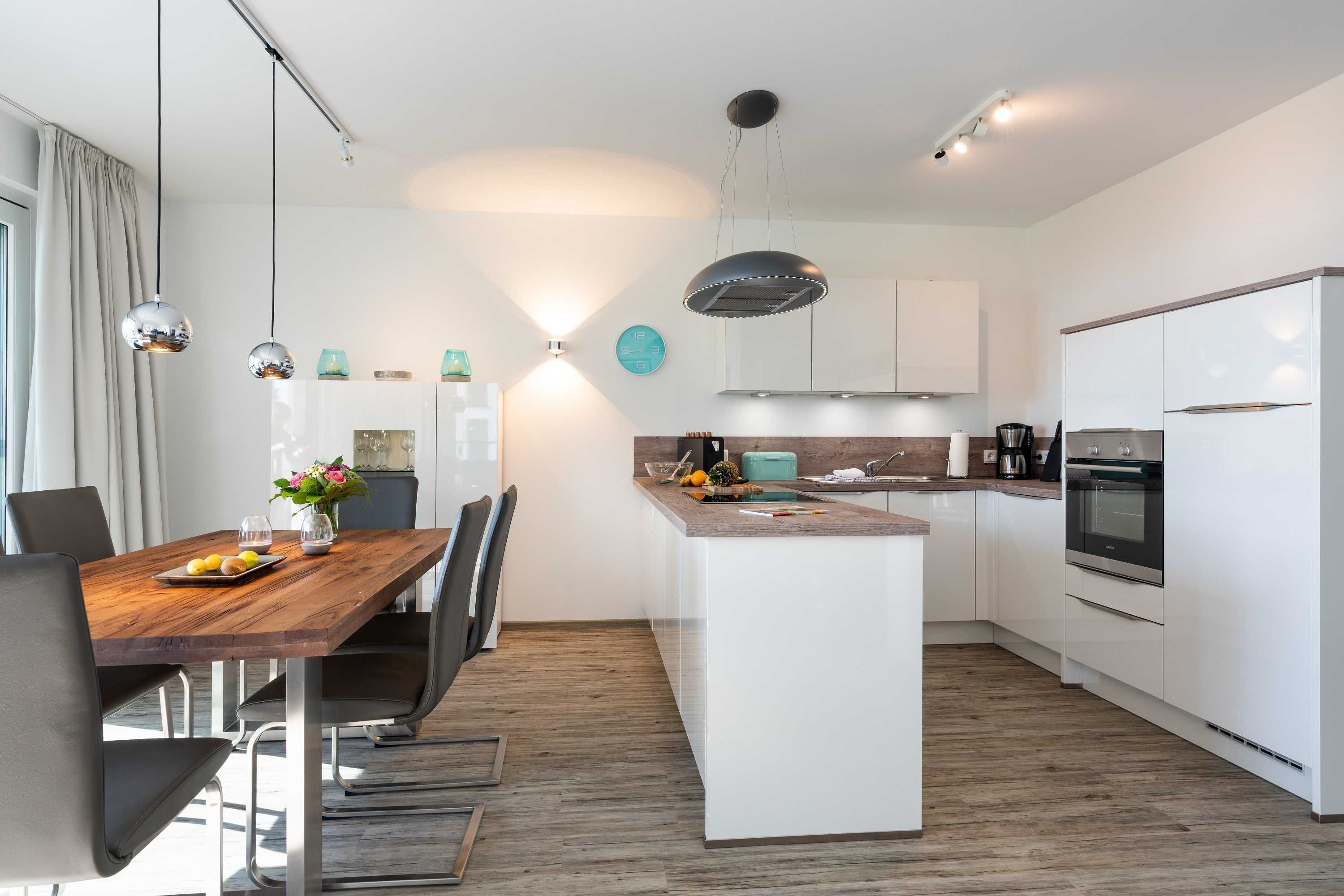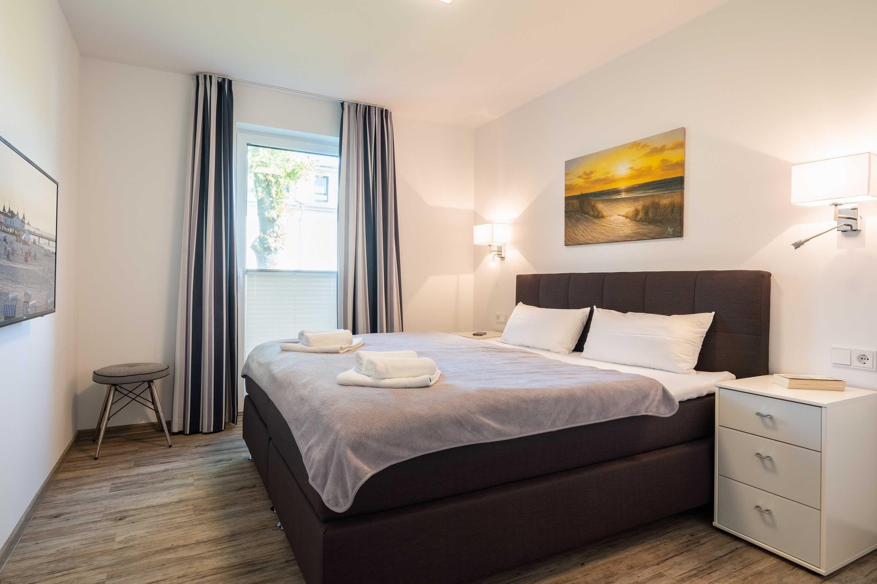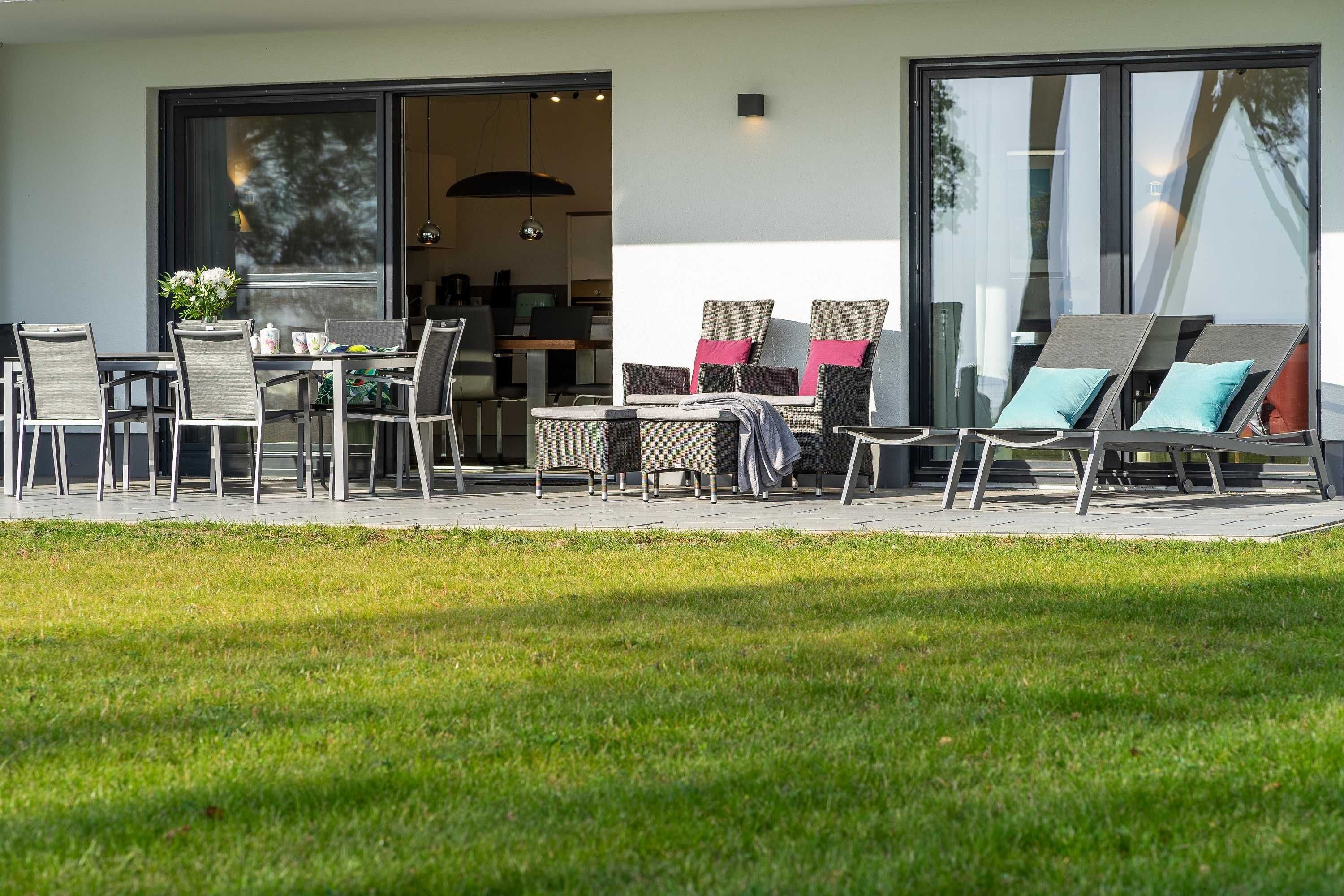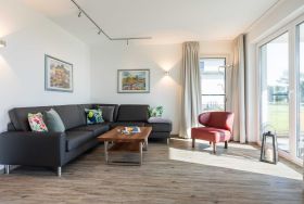Diese luxuriöse 4-Zimmer-Wohnung im Erdgeschoss von Haus 4 mit Platz für maximal 6 Personen sowie einem Kleinkind bis 2 Jahre im Babybett verfügt über eine Wohnfläche von 119 m² und hat 3 Schlafzimmer sowie 2 voll ausgestattete Duschbäder. Die große Sonnenterrasse mit 21 m² liegt in idealer Süd-Ausrichtung. Die Wohnung ist modern eingerichtet mit offenem Wohn-Essbereich, großem Esstisch, Ledersofa sowie Smart-TV (inkl. Sky-Abo). Die hochwertig ausgestattete Küche, offen zum Wohnbereich, lässt keine Wünsche offen. Erholsamer Schlaf in den beiden Schlafzimmern mit Boxspringbetten und Smart-TV ist garantiert. Im dritten Schlafzimmer befindet sich ein bequemes Schlafsofa (Liegefläche: 1,80 x 2,00 m) und ein Smart-TV. Das Badezimmer en Suite ist mit einer begehbaren Dusche ausgestattet. Auf der großen, überdachten Sonnenterrasse mit Essgruppe und jeweils zwei Relax-Sesseln, Fußhockern, Sonnenschirm und Sonnenliegen können Sie die Seele baumeln lassen.