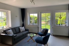 Die große Gartenanlage fügt sich harmonisch in die Landschaft ein und bietet viel Platz zum Erholen, Entspannen und Spielen. Im Garten befinden sich Terrassen mit Sitzgruppen, Strandkörbe, eine Liegewiese, Liegestühle und Sonnenschirme. Außerdem gibt es einen Grillplatz und einen Kinderspielplatz.