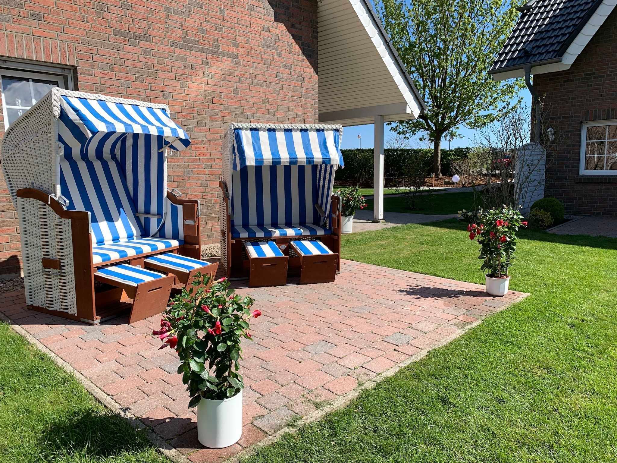 Die große Gartenanlage fügt sich harmonisch in die Landschaft ein und bietet viel Platz zum Erholen, Entspannen und Spielen. Im Garten befinden sich Terrassen mit Sitzgruppen, Strandkörbe, eine Liegewiese, Liegestühle und Sonnenschirme. Außerdem gibt es einen Grillplatz und einen Kinderspielplatz.