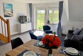 Die 3-Zimmer Maisonettewohnungen (70 m²) für Familien befinden sich im 1. OG und bieten einen wunderschönen Blick in die Natur. Die Maisonettewohnungen haben 2 Schlafzimmer mit Boxspringbetten, 2 Badezimmer, einen großen Wohnraum mit Couchgarnitur (Schlafsofa), eine integrierte Einbauküche mit Essbereich und einen Balkon. Die Küche ist in den großen Wohnraum integriert.