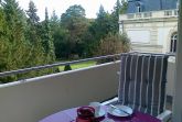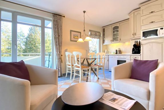 Zur Ferienwohnung gehört ein großer Balkon in Richtung Park der Residenz. Genießen Sie hier den Blick ins Grüne. Die Schlafzimmer sind mit Teppichboden ausgelegt und verfügen beide über Doppelbetten. Die Ferienwohnung 15 hat ein Badezimmer mit Badewanne. Internet und Sky (ausgewählte Programme) inklusive.