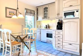 Der Stil der Einrichtung ist klassisch/modern zu nennen: einen schöne Sitzecke, schöne Terracottafliesen und ein toller Glastisch als Hingucker und Esstisch zugleich. Die Komplettküche ist in den Wohnraum integriert und bietet alle Möglichkeiten vom Geschirrspüler bis zur Mikrowelle.
