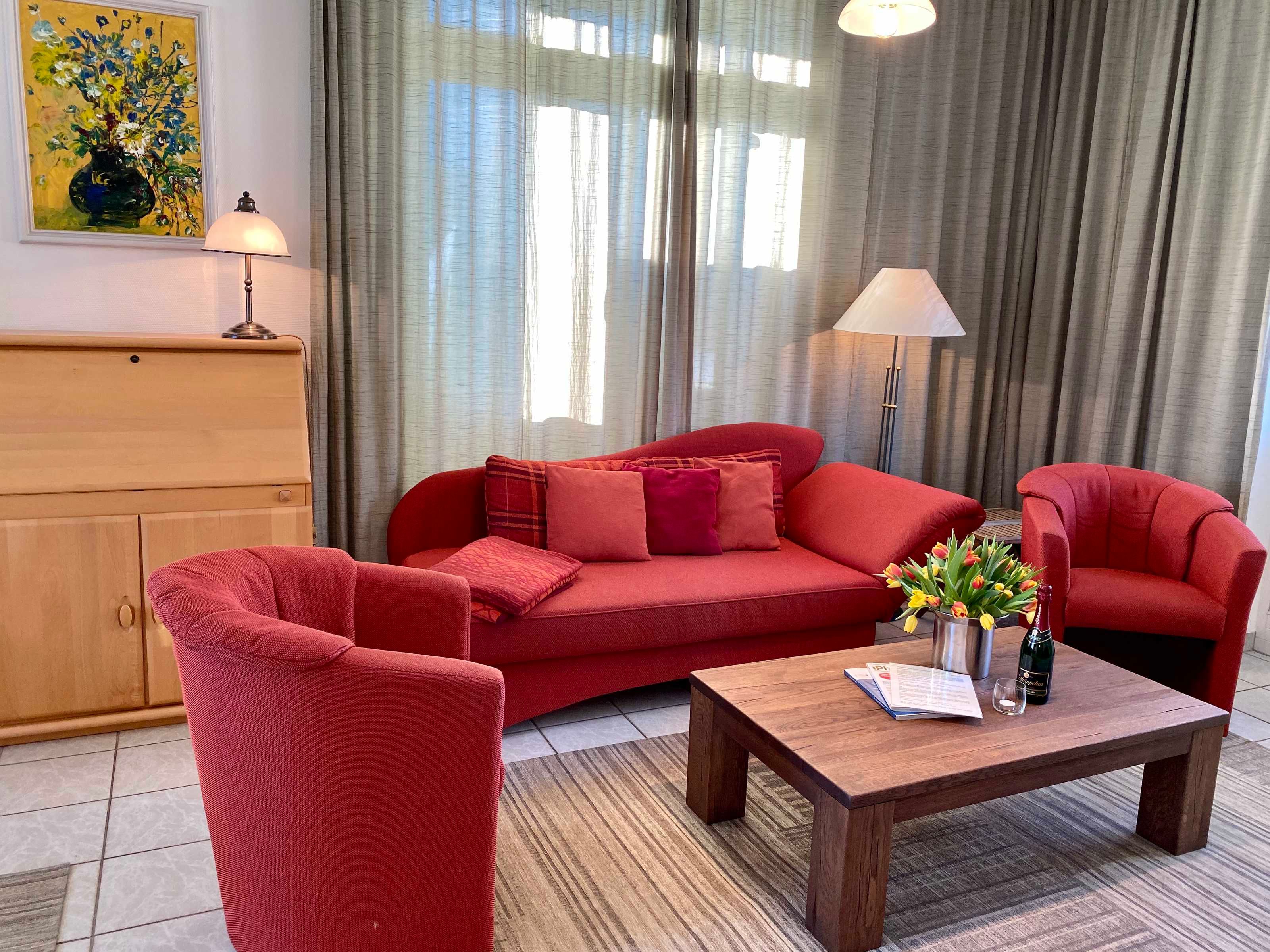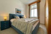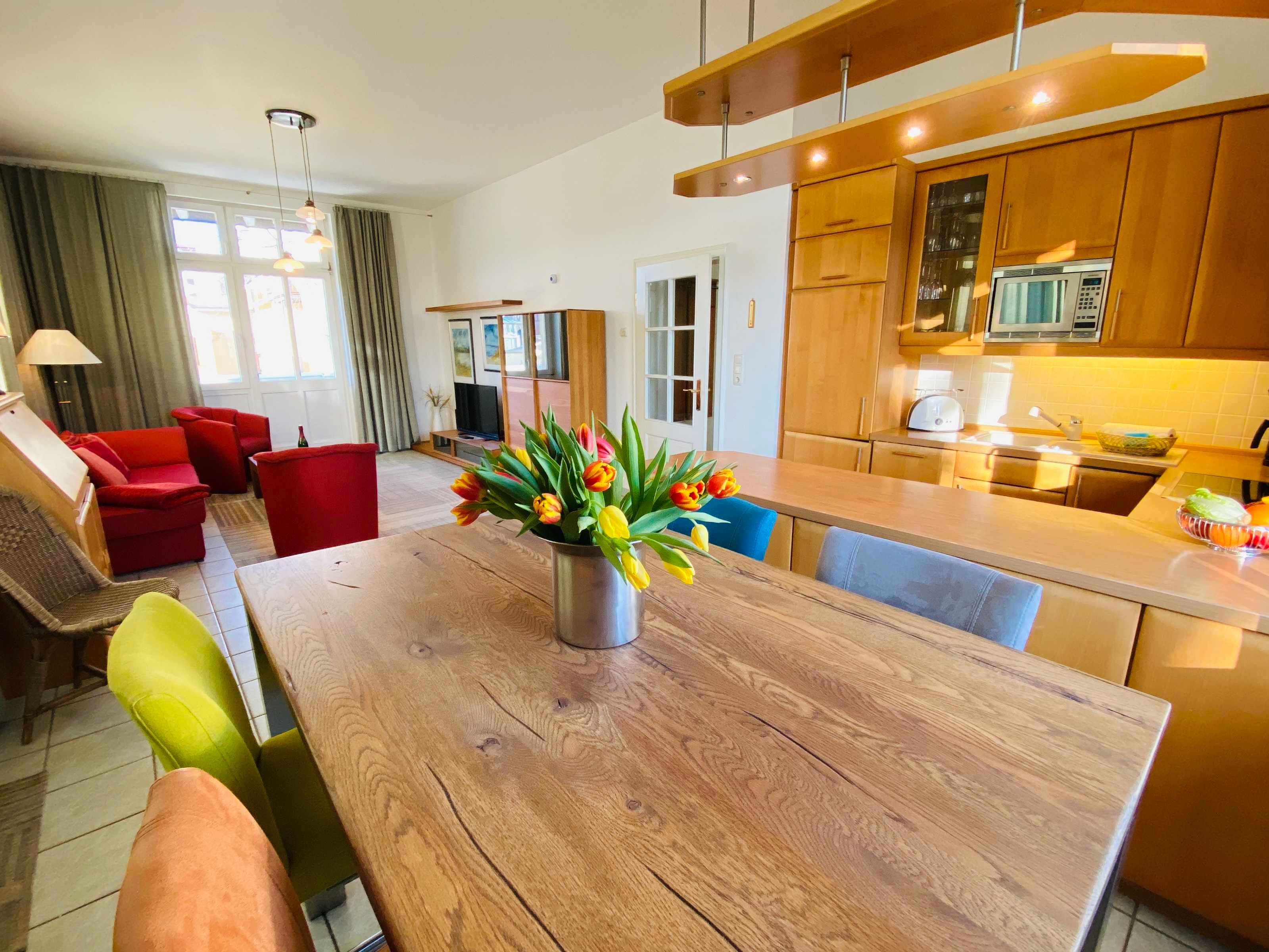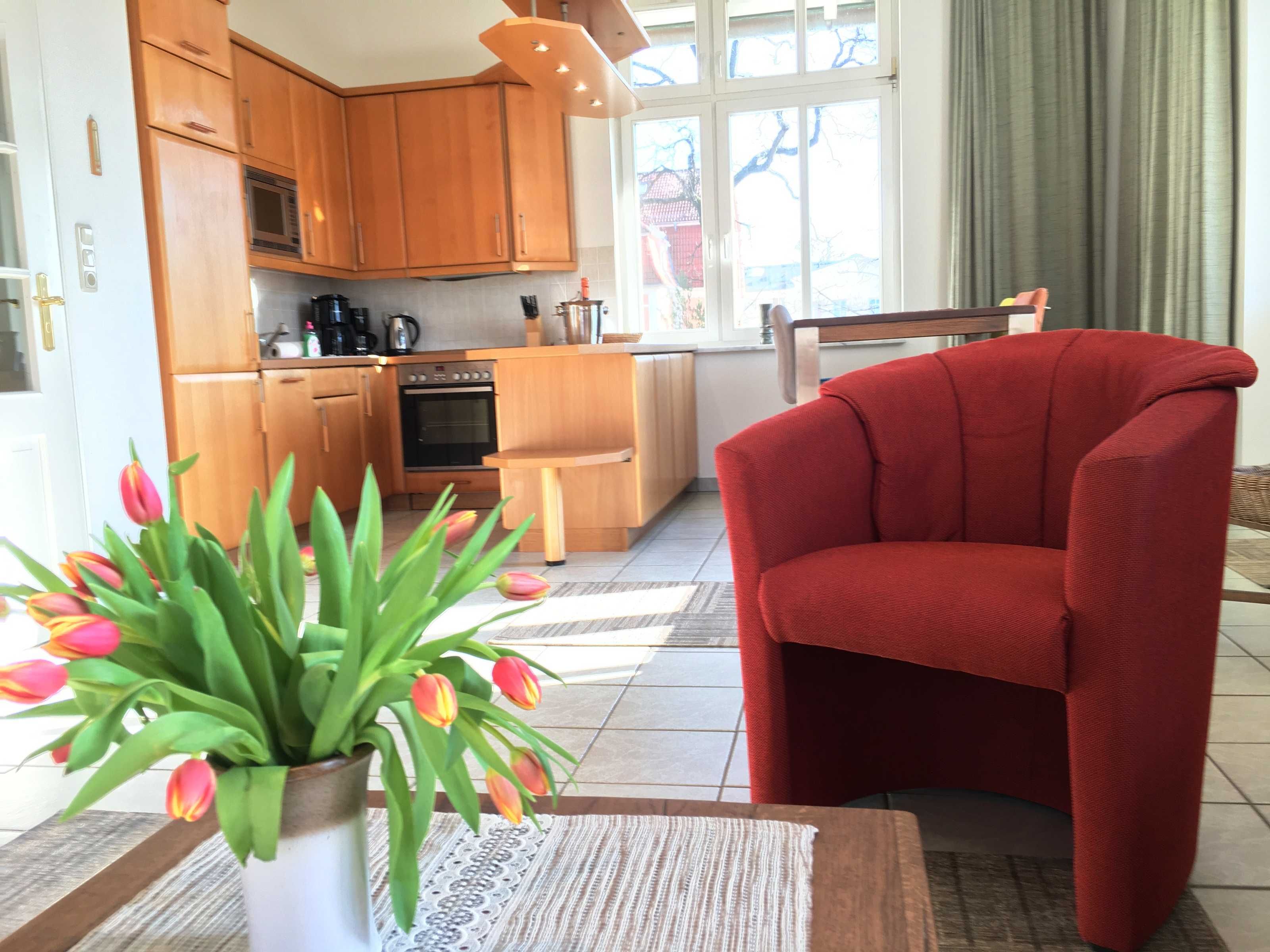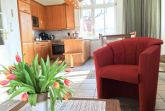 Die komfortable Zweiraumwohnung  im 2.OG hat einen schönen Wohn- Essbereich mit Couchecke, TV, Esstisch und Komplettküche. Das Schlafzimmer ist mit einem gemütliches Boxspringbett und Kleiderschrank ausgstattet. Die Ferienwohnung hat ein Badezimmer mit Dusche. Die Wohnung hat 2 wunderschönen Balkonen: einer Richtung Süden mit Strandkorb, der zweite kleinere in Richtung Westen/Promenade/See.