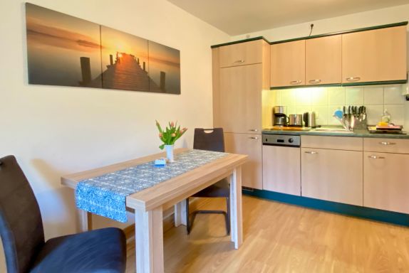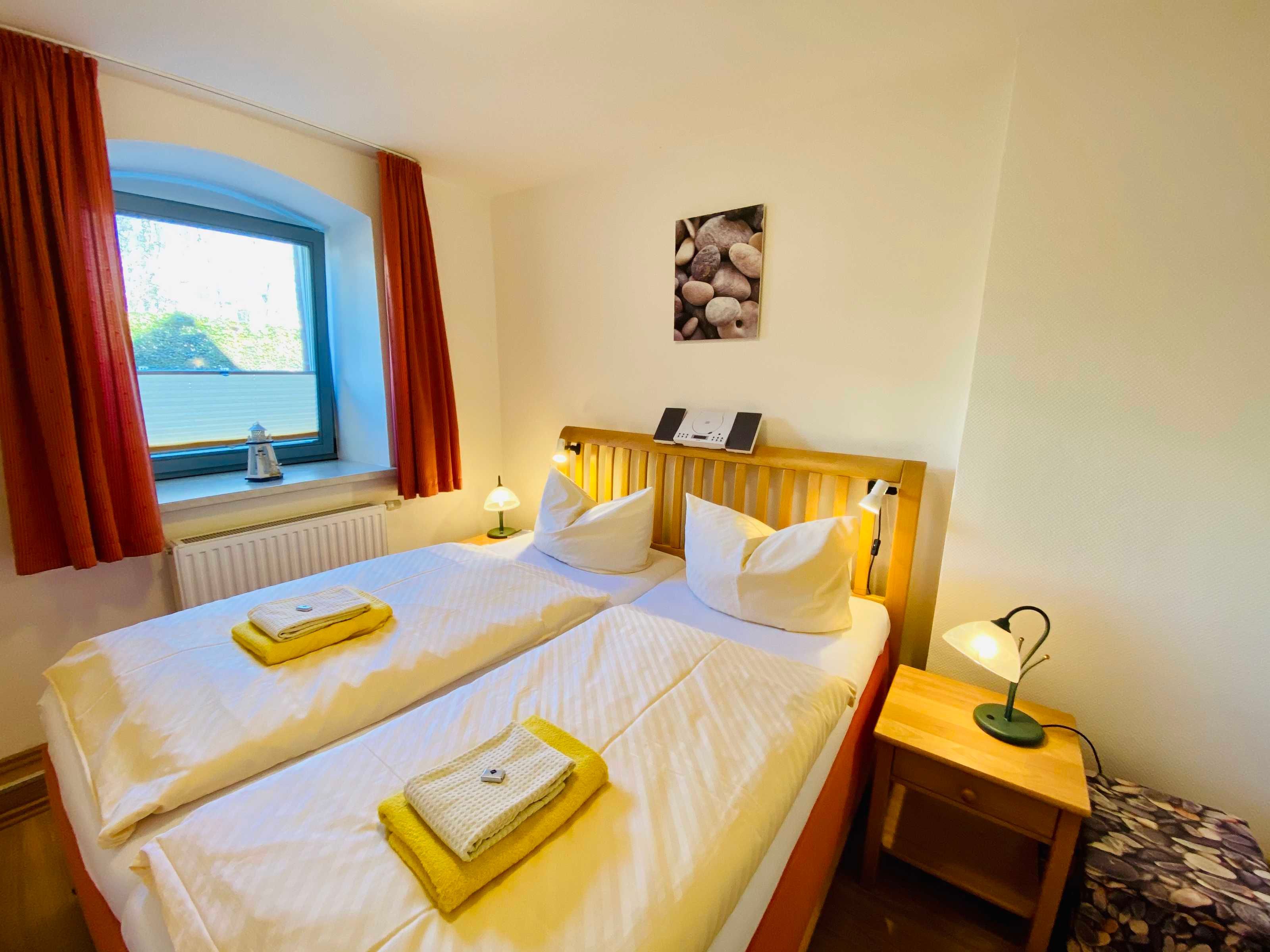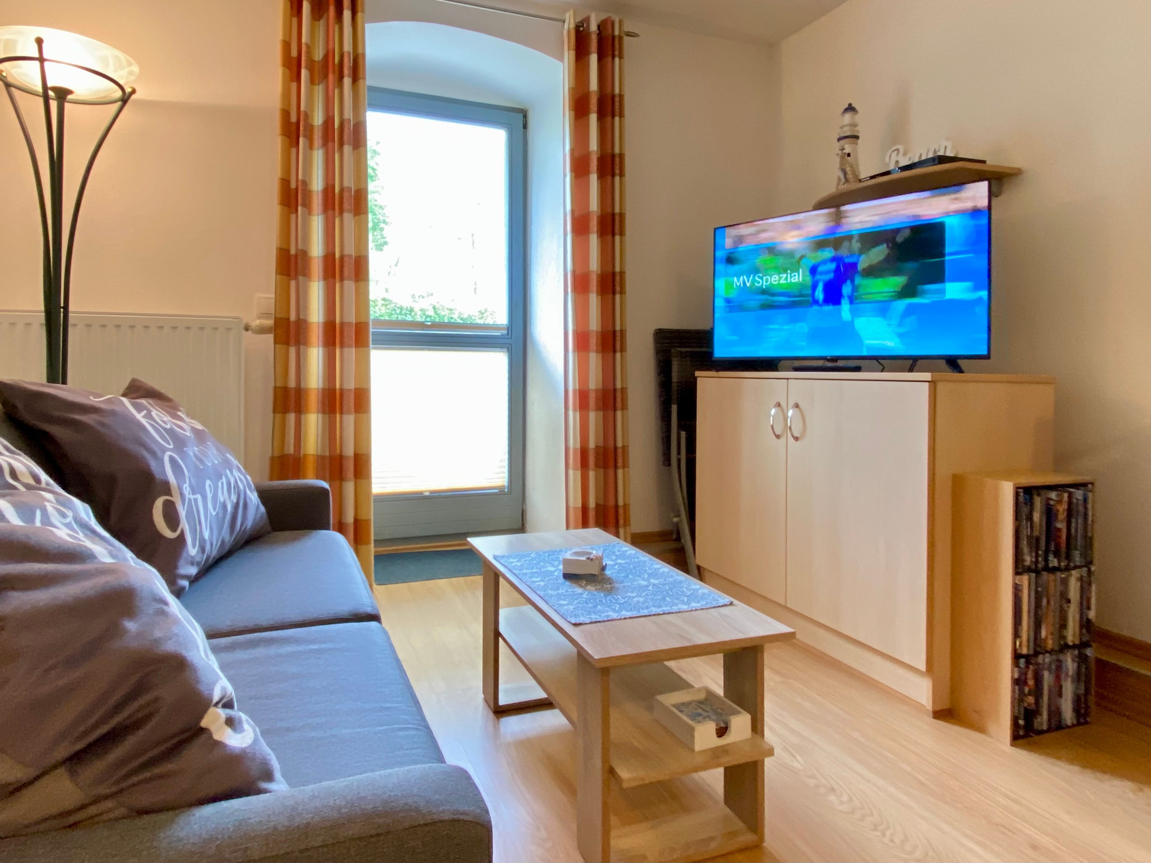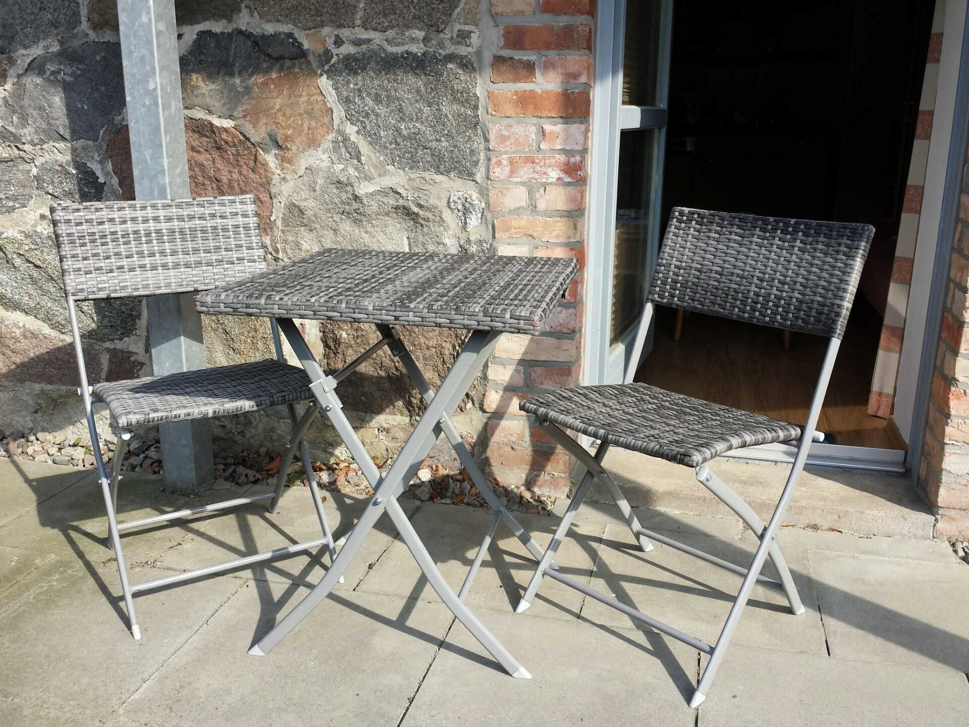 Die kleine 2-Raumferienwohnung verfügt über eine überdachte Terrasse mit Möbeln, ein Bad mit Dusche, ein Schlafzimmer mit Doppelbett in Komforthöhe und CD-Player, einen kombinierten Wohn-Essraum mit kleiner Küchenzeile (Geschirrspüler, 2-Plattenherd, Mikrowelle). Im Wohnzimmer befindet sich ein TV und ein DVD-Player mit DVDs für den Regentag im Urlaub. Stellplatz für den PKW und Fahrradschuppen sind vorhanden.Internet inklusive