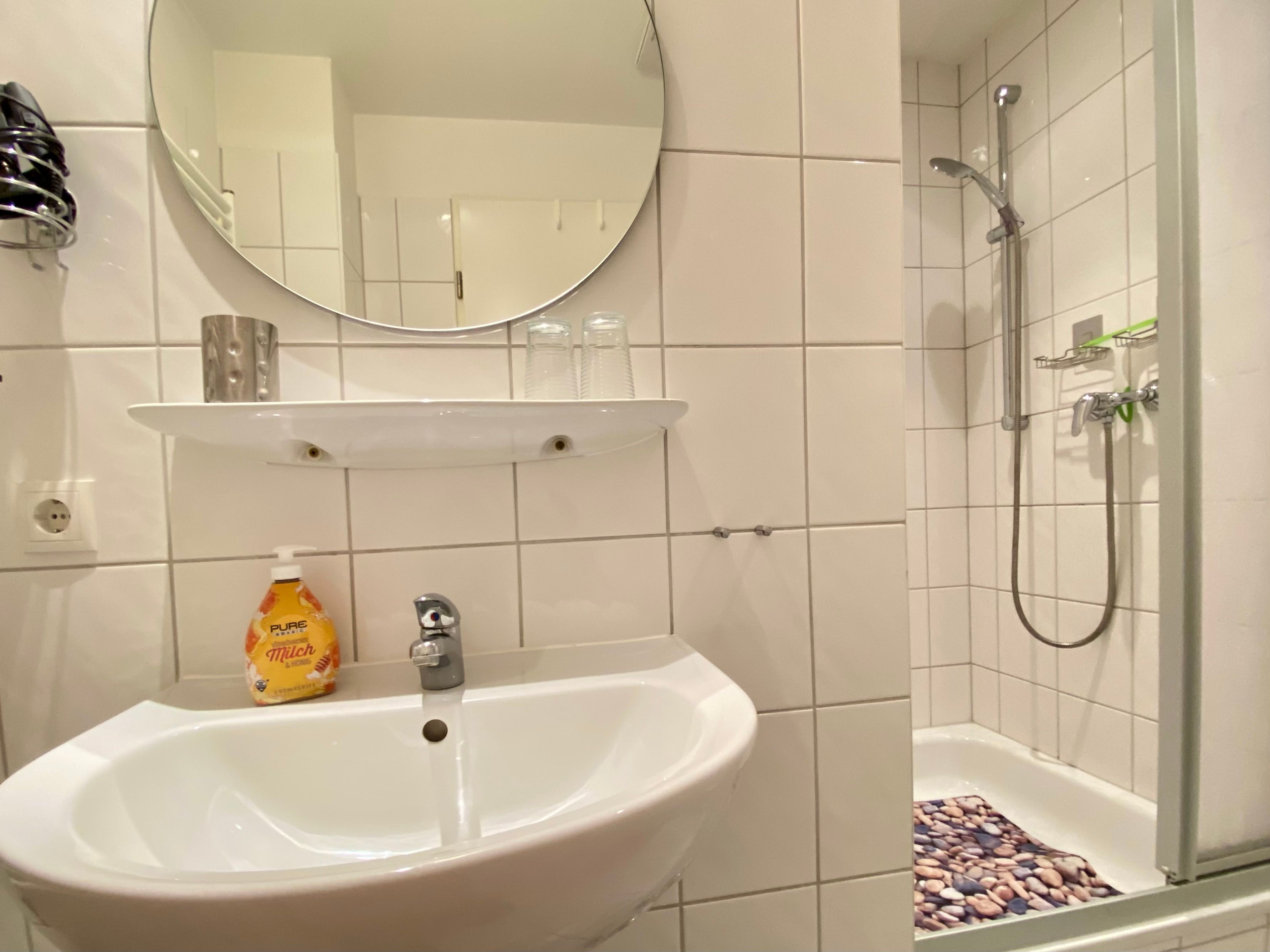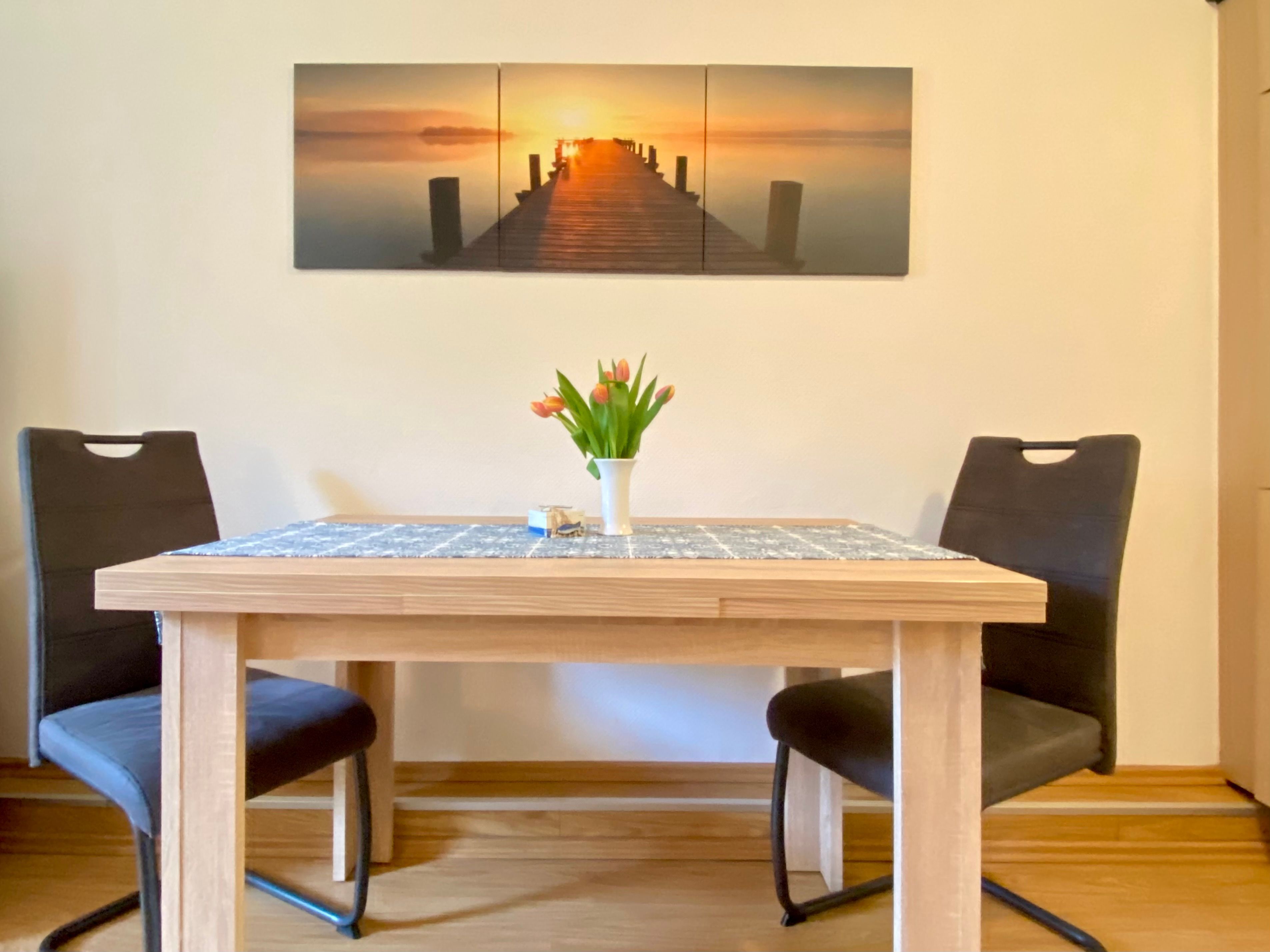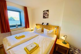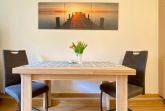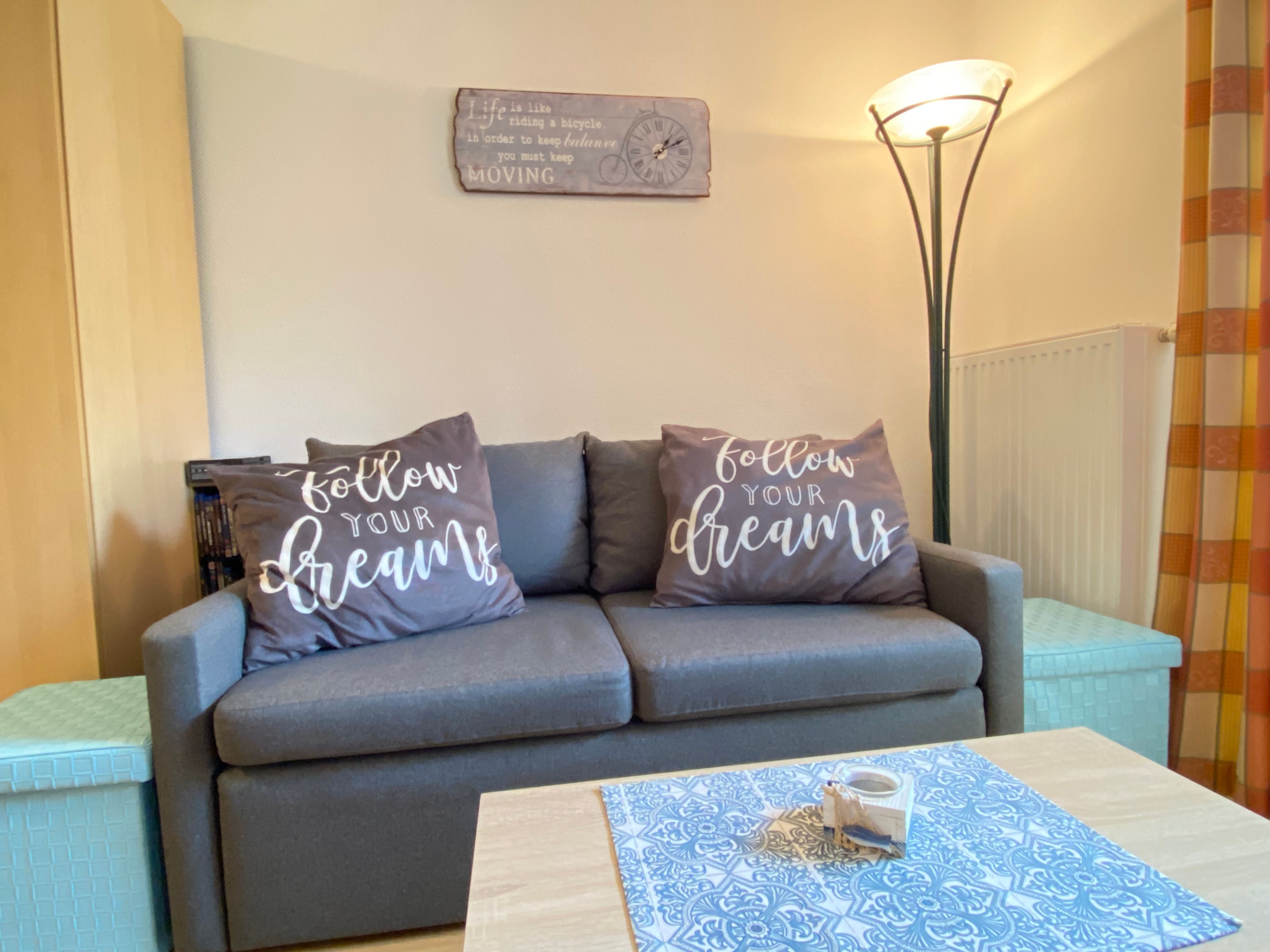 Die kleine 2-Raumferienwohnung verfügt über eine überdachte Terrasse mit Möbeln, ein Bad mit Dusche, ein Schlafzimmer mit Doppelbett in Komforthöhe und CD-Player, einen kombinierten Wohn-Essraum mit kleiner Küchenzeile (Geschirrspüler, 2-Plattenherd, Mikrowelle). Im Wohnzimmer befindet sich ein TV und ein DVD-Player mit DVDs für den Regentag im Urlaub. Stellplatz für den PKW und Fahrradschuppen sind vorhanden.Internet inklusive