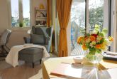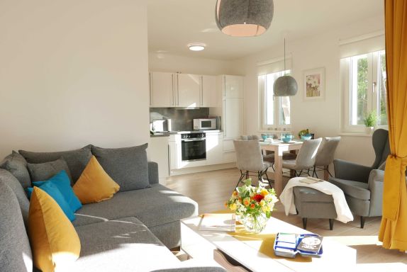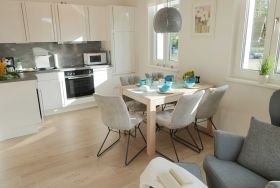 Luxus pur mit eigener Sauna in der Wohnung. Meerblick dazu. Freuen Sie sich auf erholsame Tage in dieser exklusiven 2-Zimmer-Ferienwohnung, die sowohl mit seitlichem Meerblick als auch mit einer privaten Farblichtsauna auftrumpft. In dem wohligen Wohnzimmer mit dimmbaren Lichtschaltern und integrierter Küchenzeile befindet sich neben einem gemütlichen Esstisch auch ein großes Schlafsofa für 2 Personen (ausgezogen mit den Maßen 150 x 200 cm).