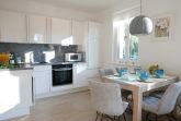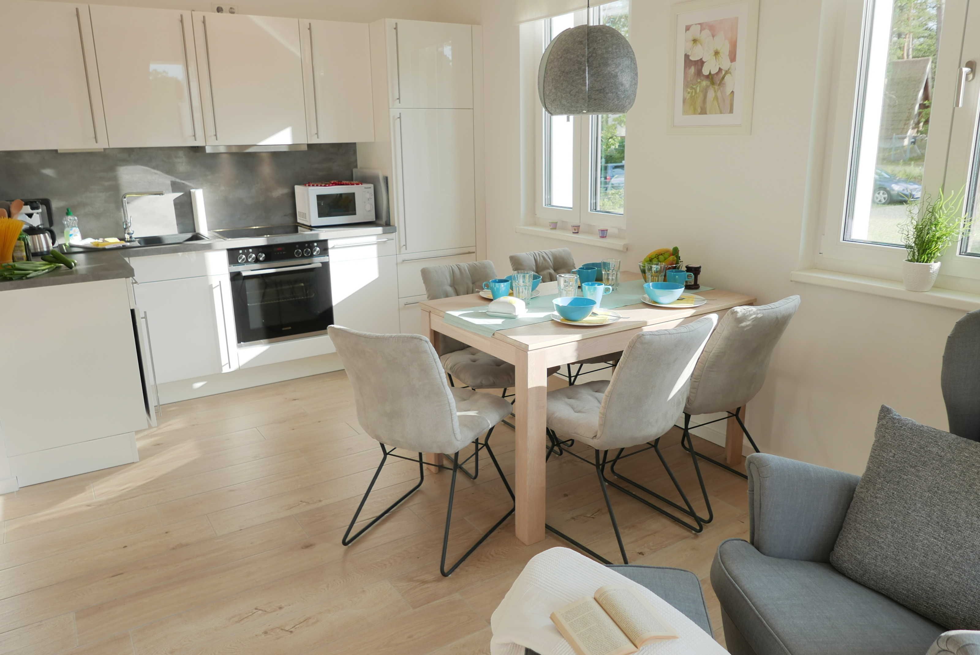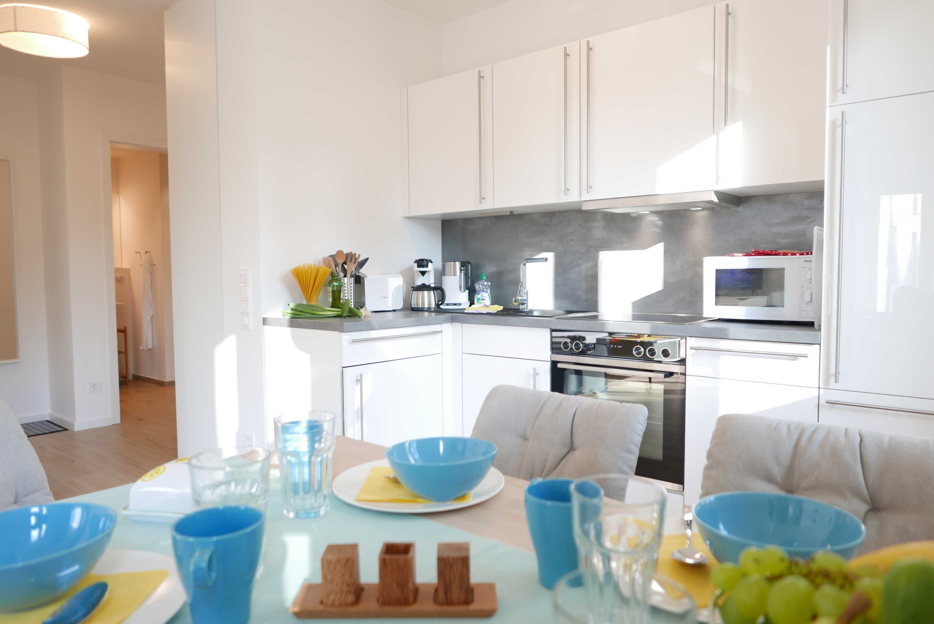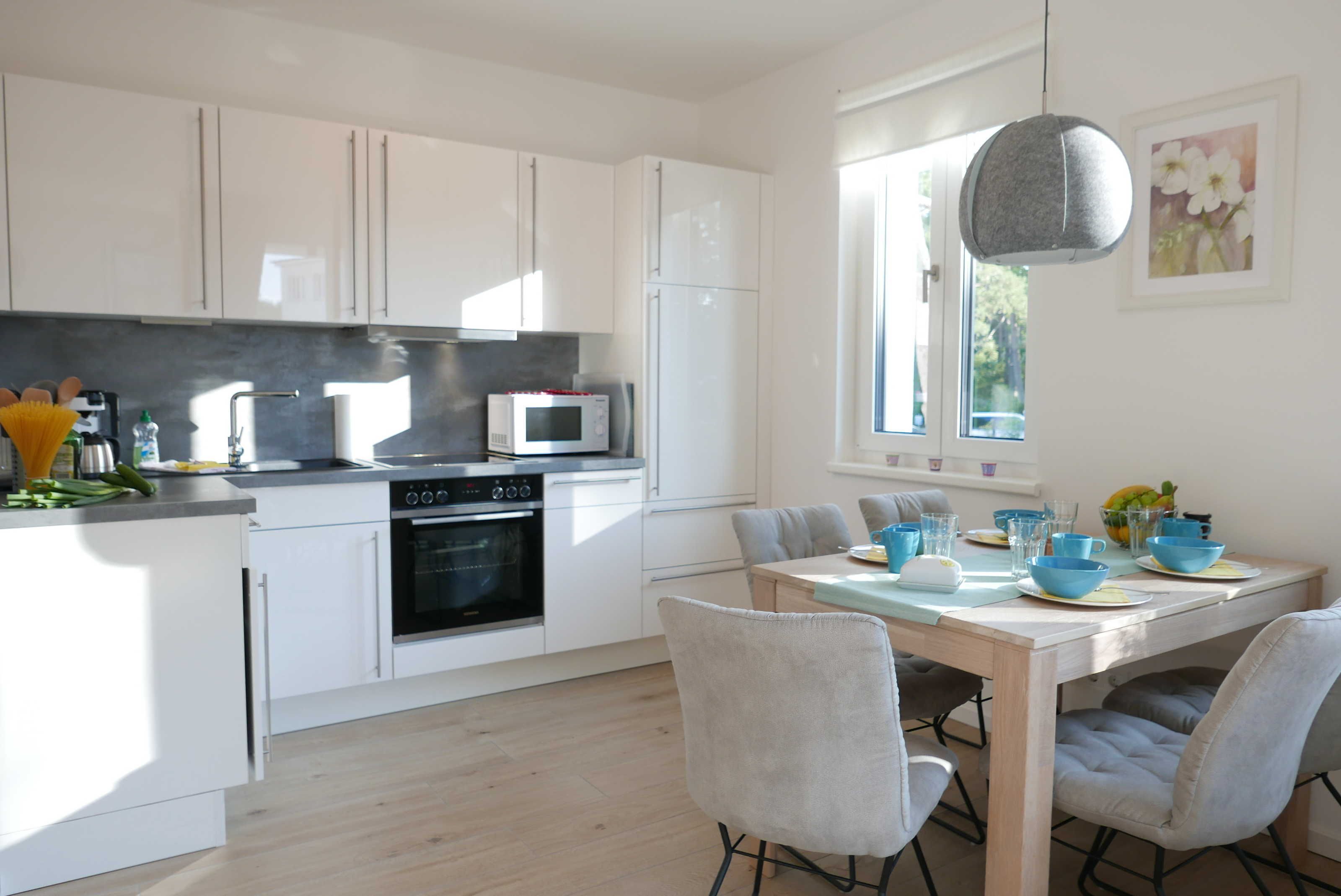 Die Küchenzeile ist ausgestattet mit 4-Platten-Ceranfeld, Kühlschrank mit Gefrierfach, Mikrowelle, Backofen, Geschirrspülmaschine, Toaster, Kaffeemaschine Senseo Switch (Pad und Filterkaffeemaschine), sowie Wasserkocher.