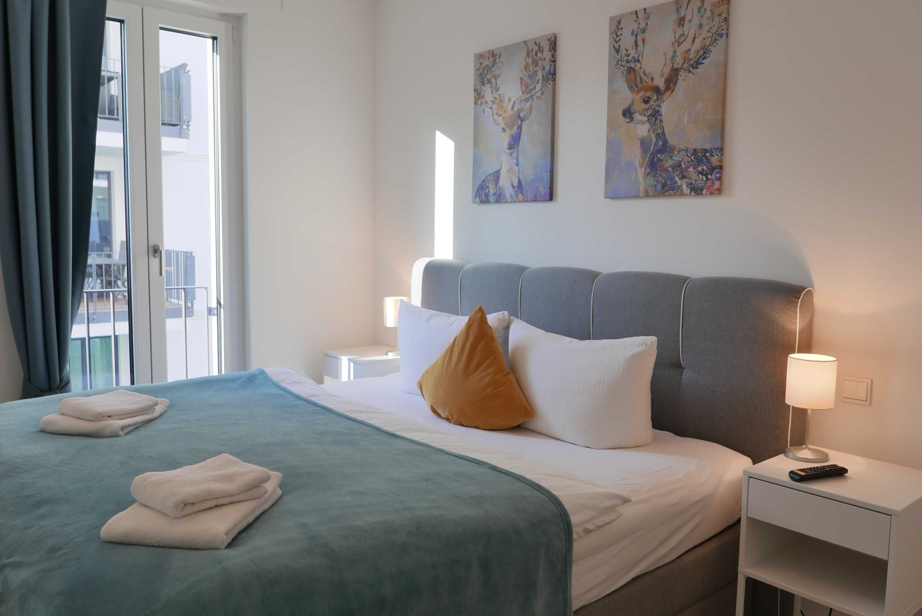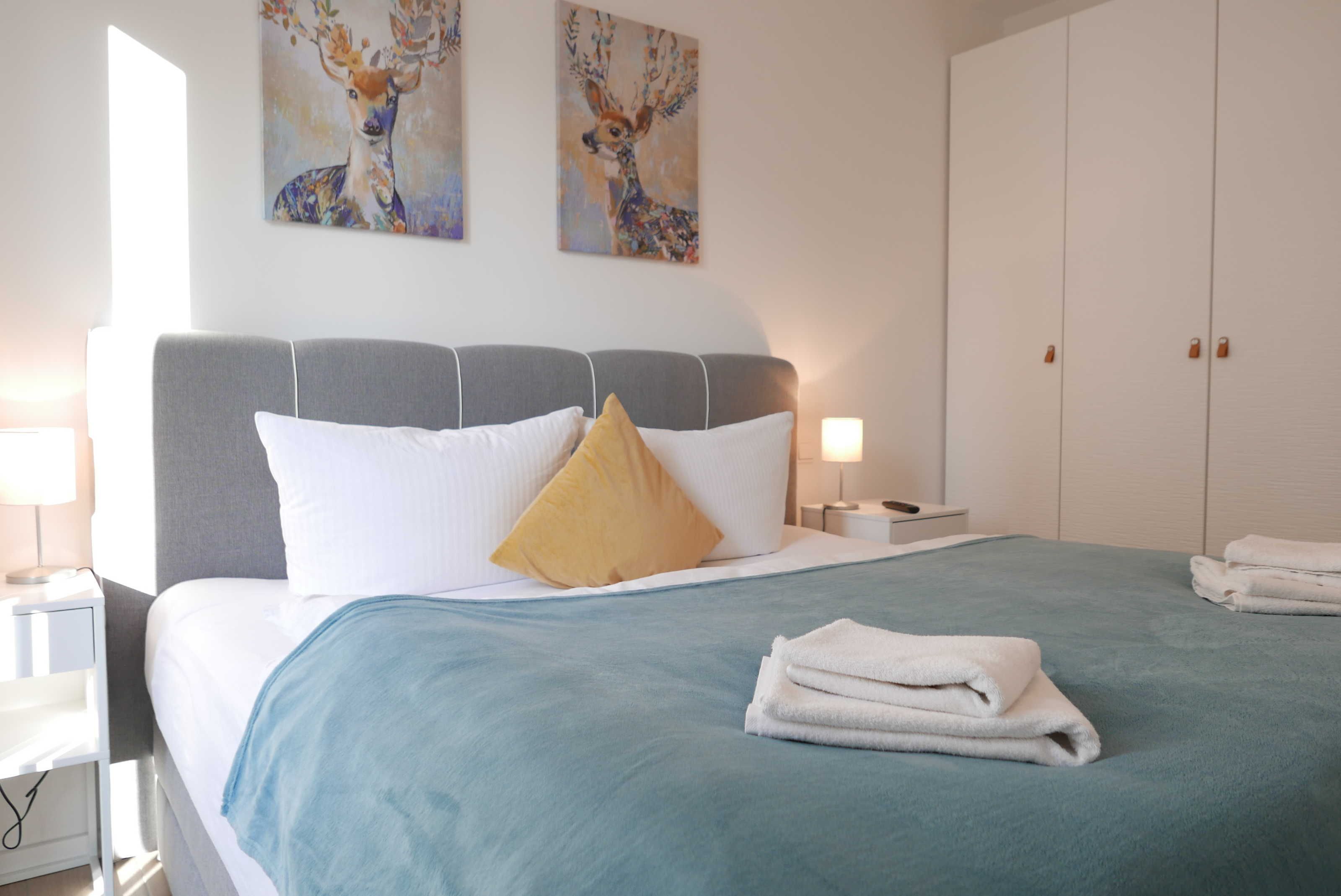 Das Schlafzimmer verfügt über ein Boxspringbett mit den Maßen 180 x 200 cm, sowie ein SMART-TV und ausreichend Stauplatz.