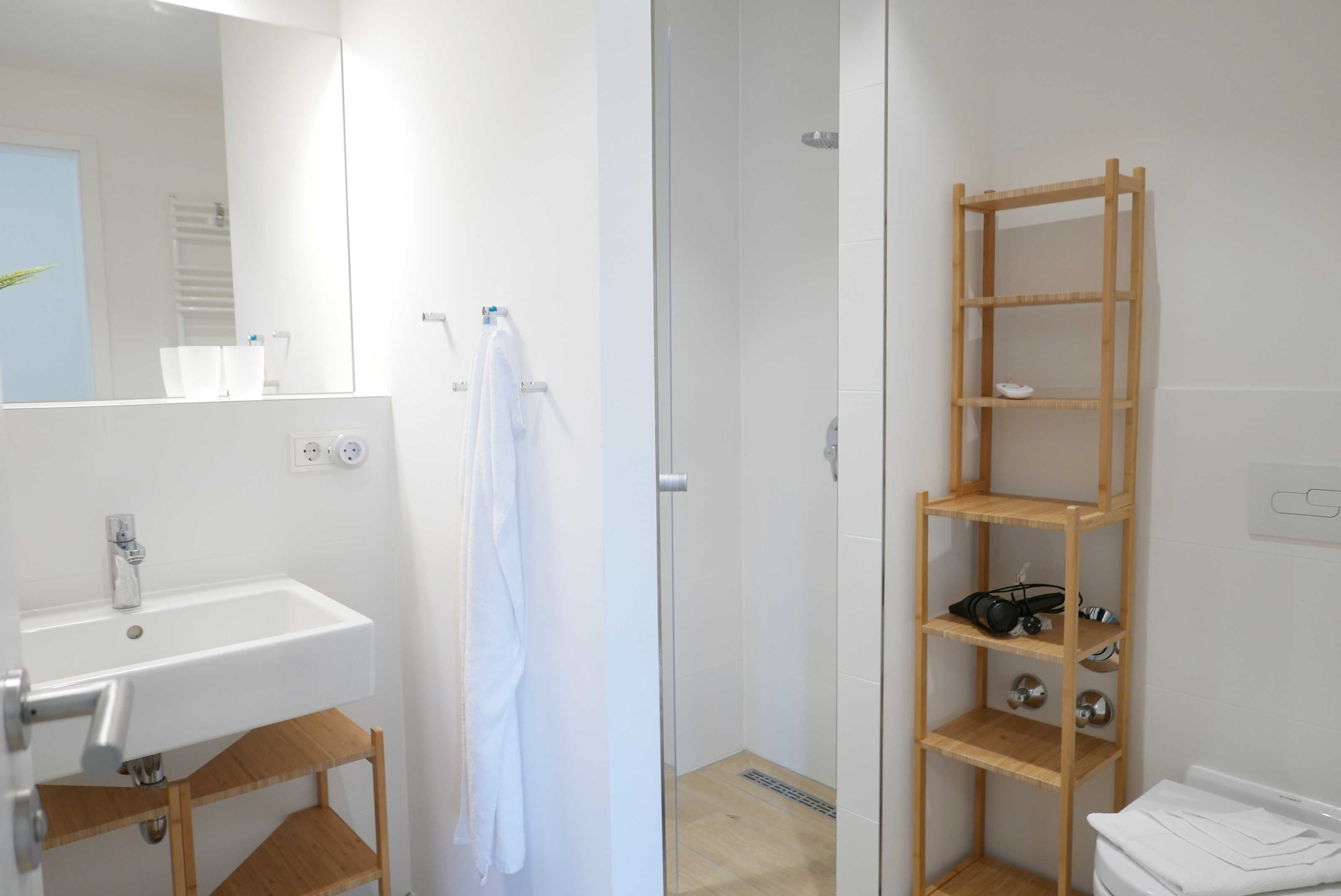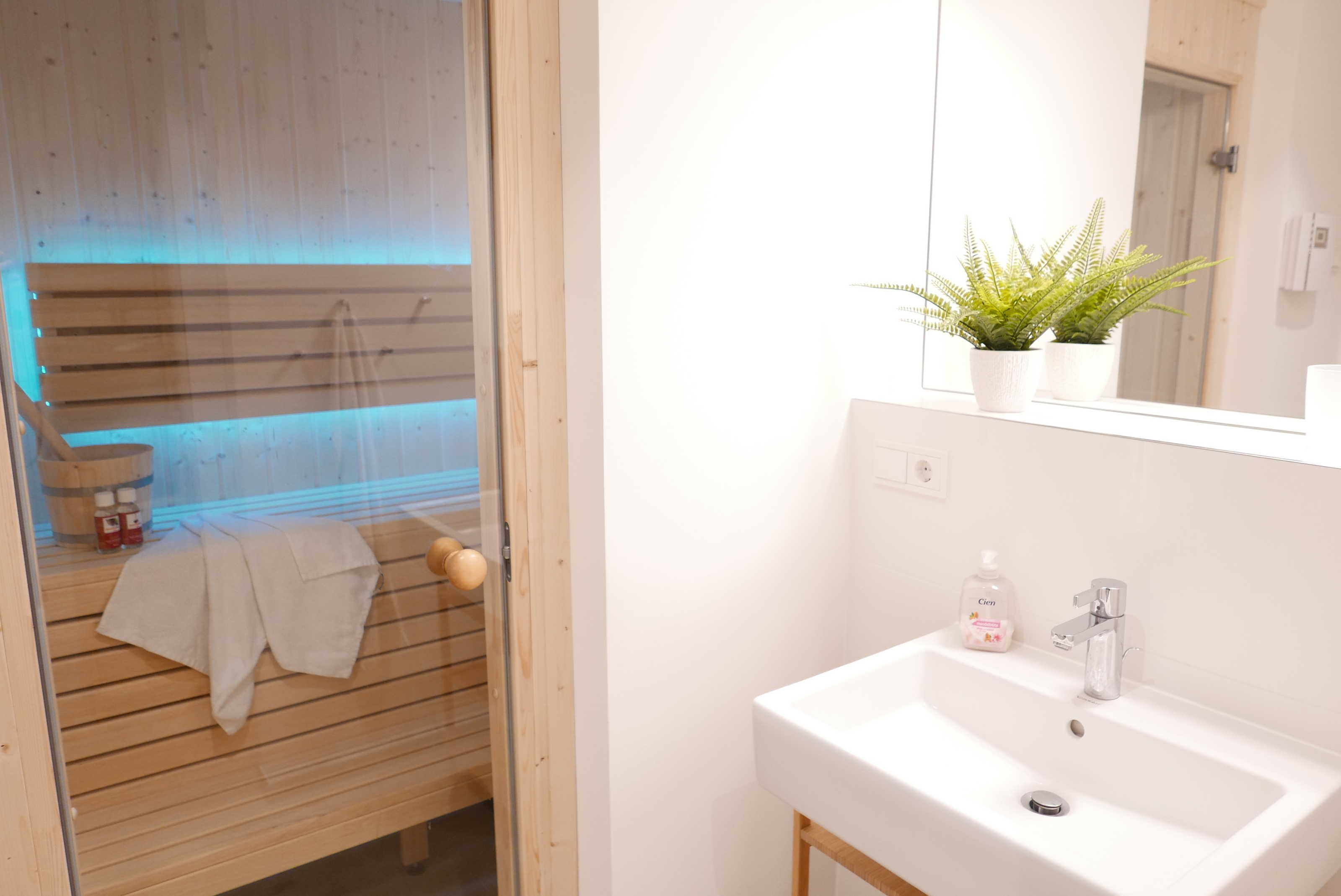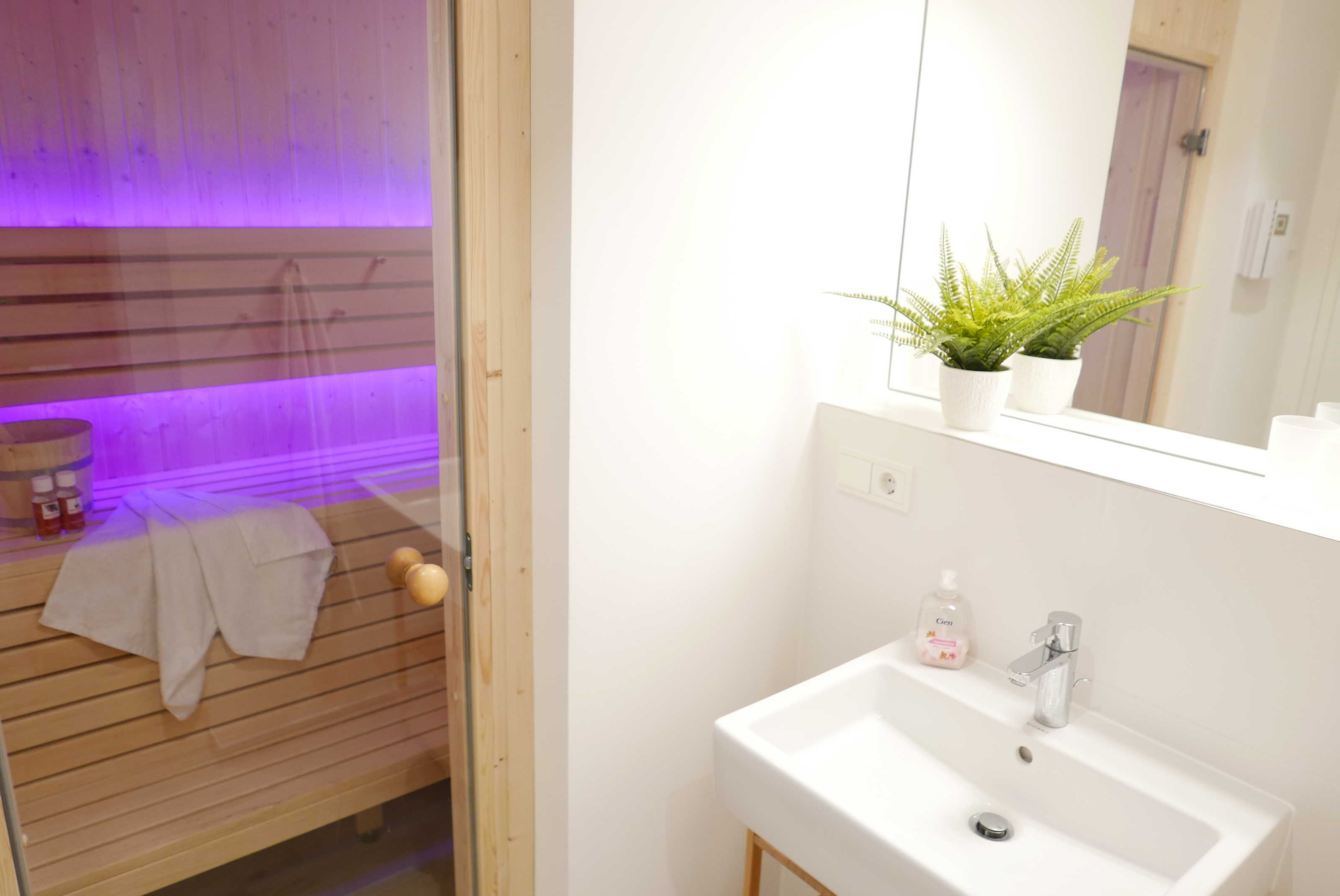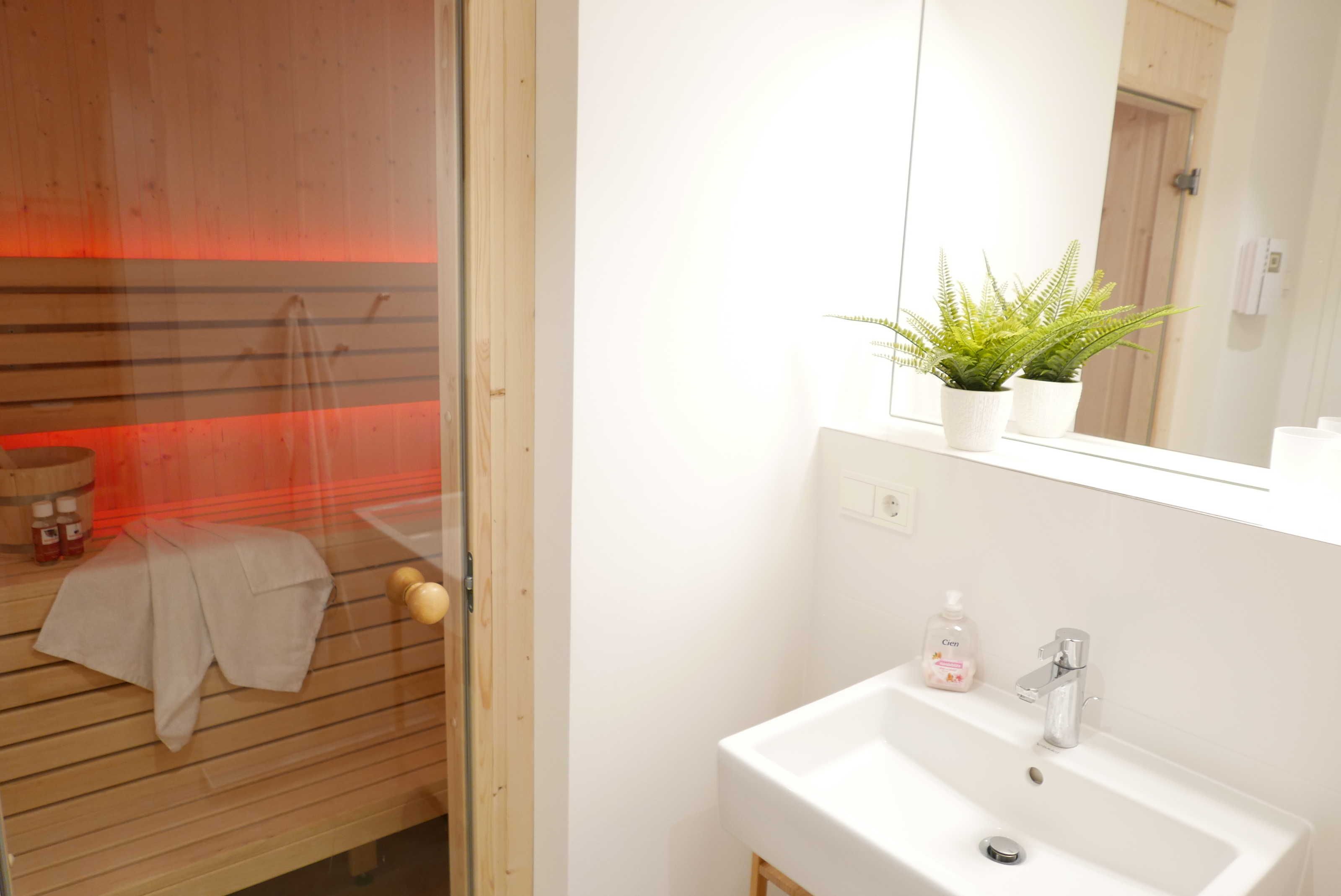 Über das Duschbadezimmer mit Handtuchheizkörper gelangt man in die Sauna.