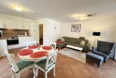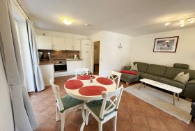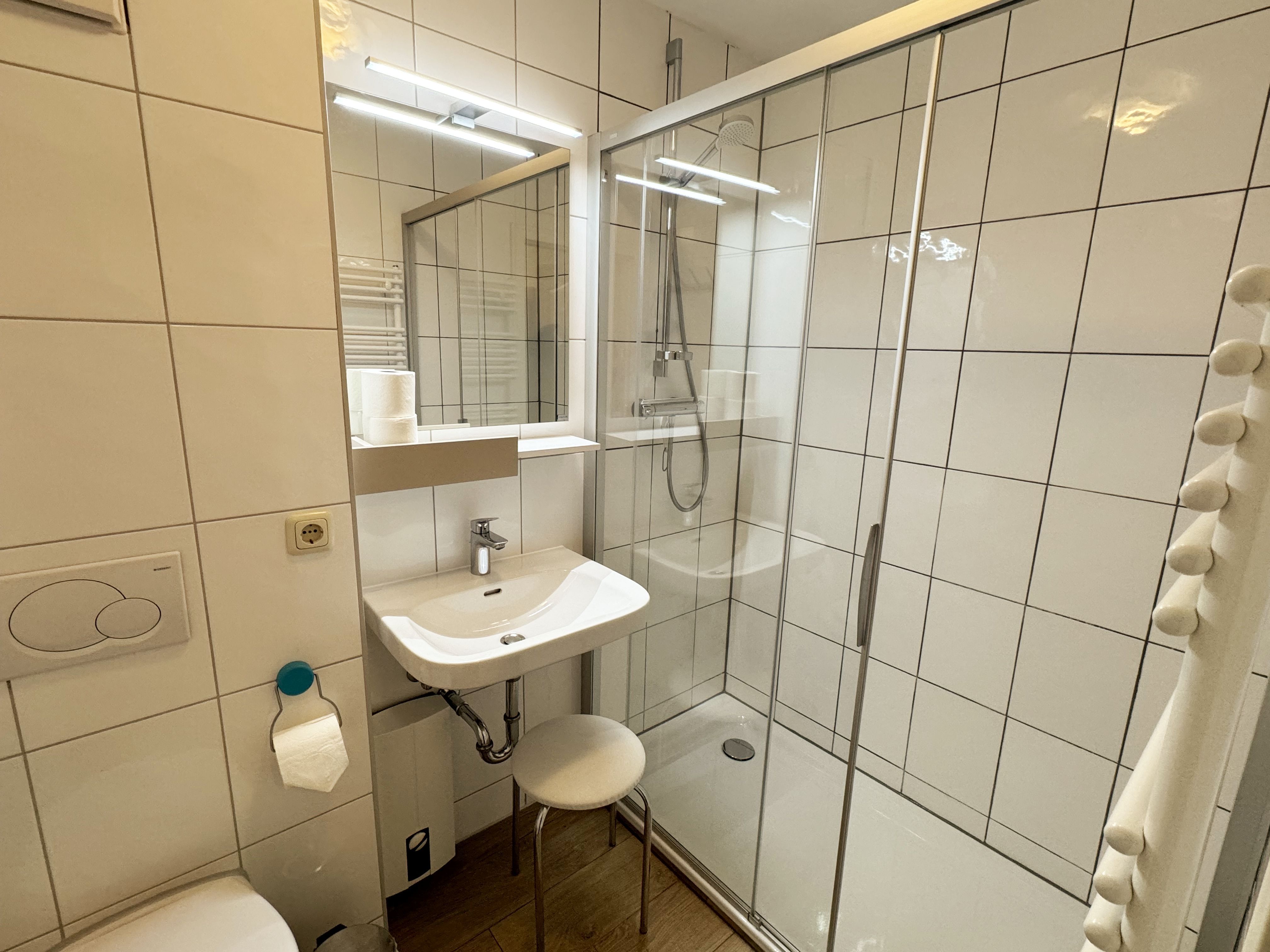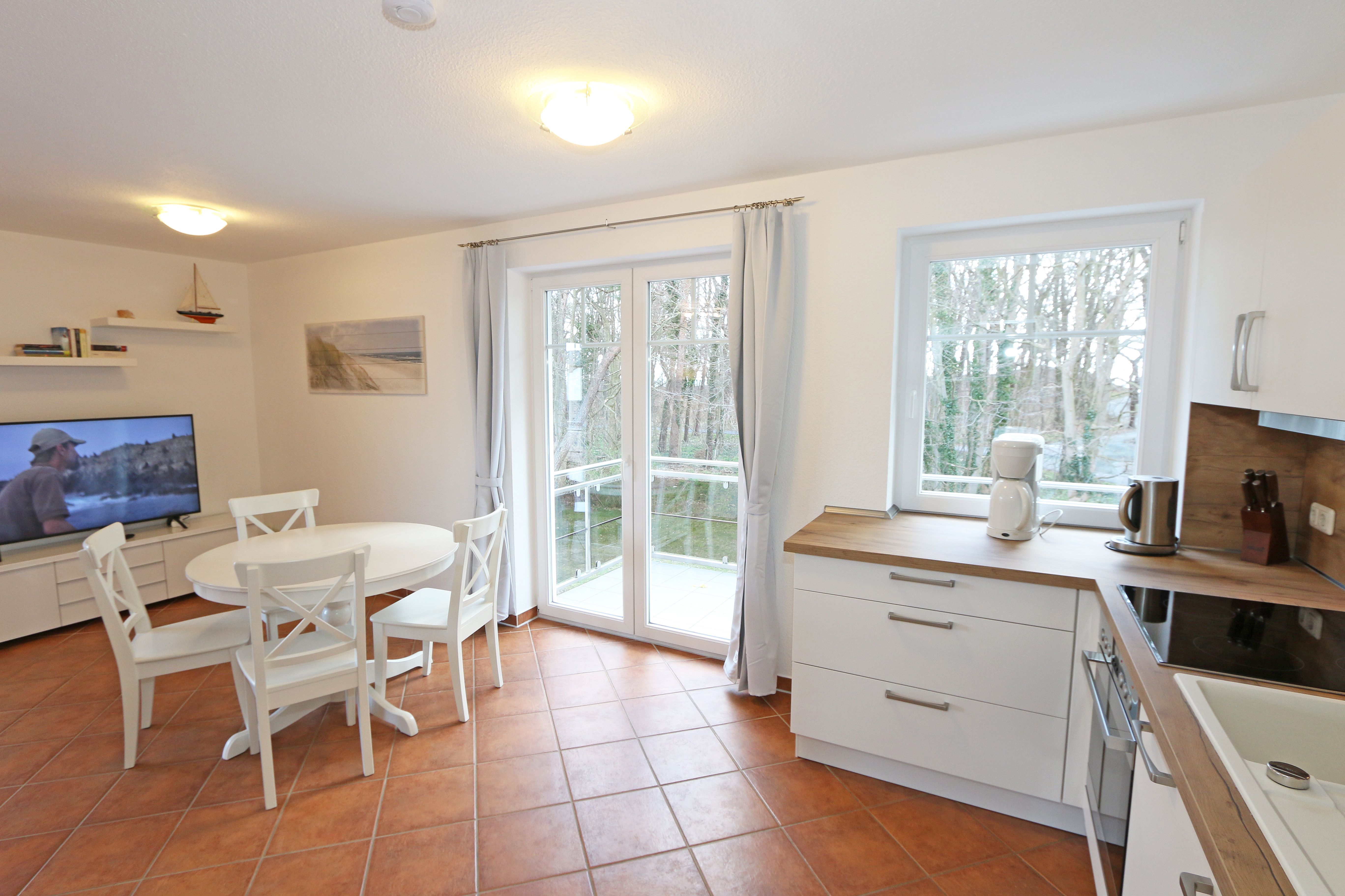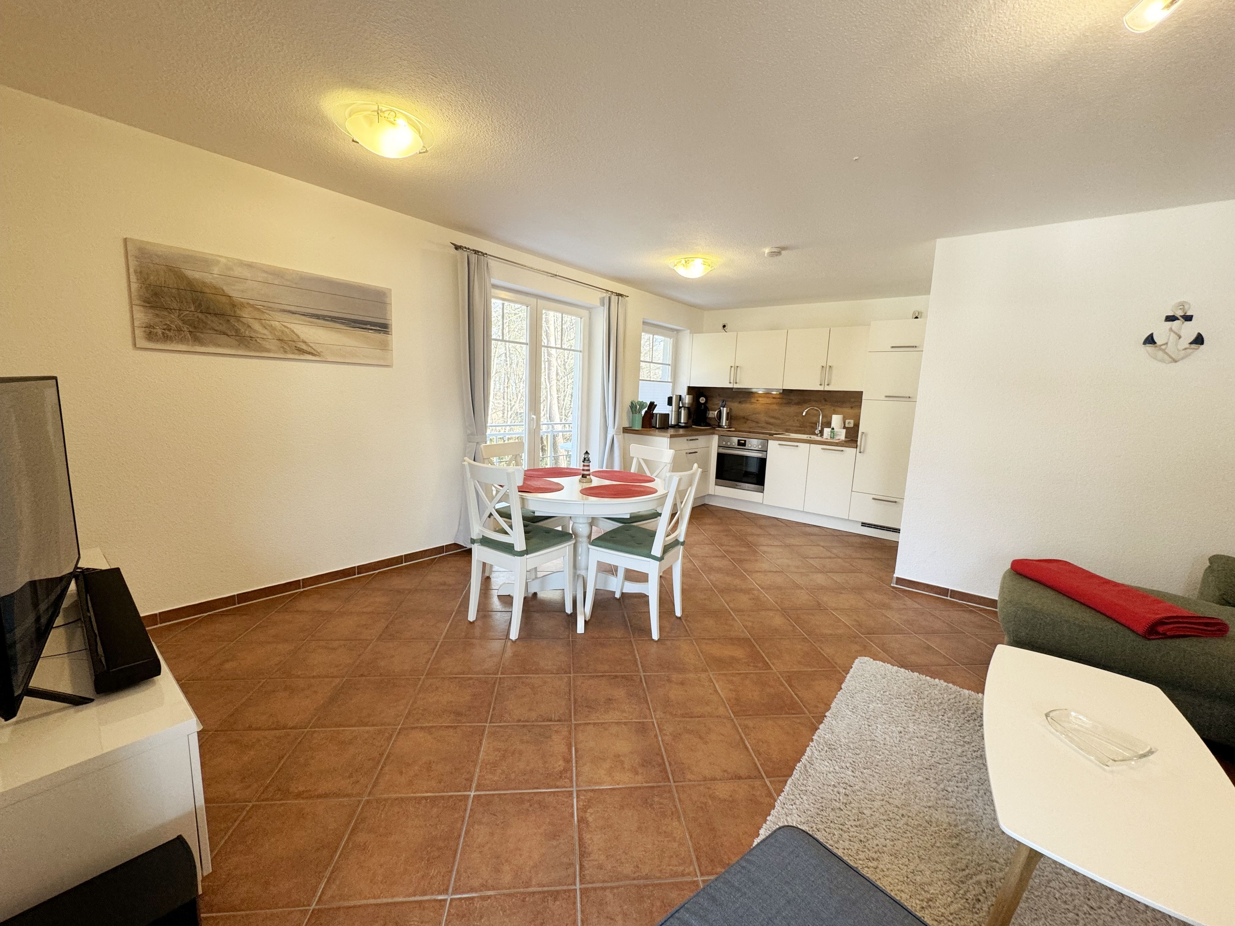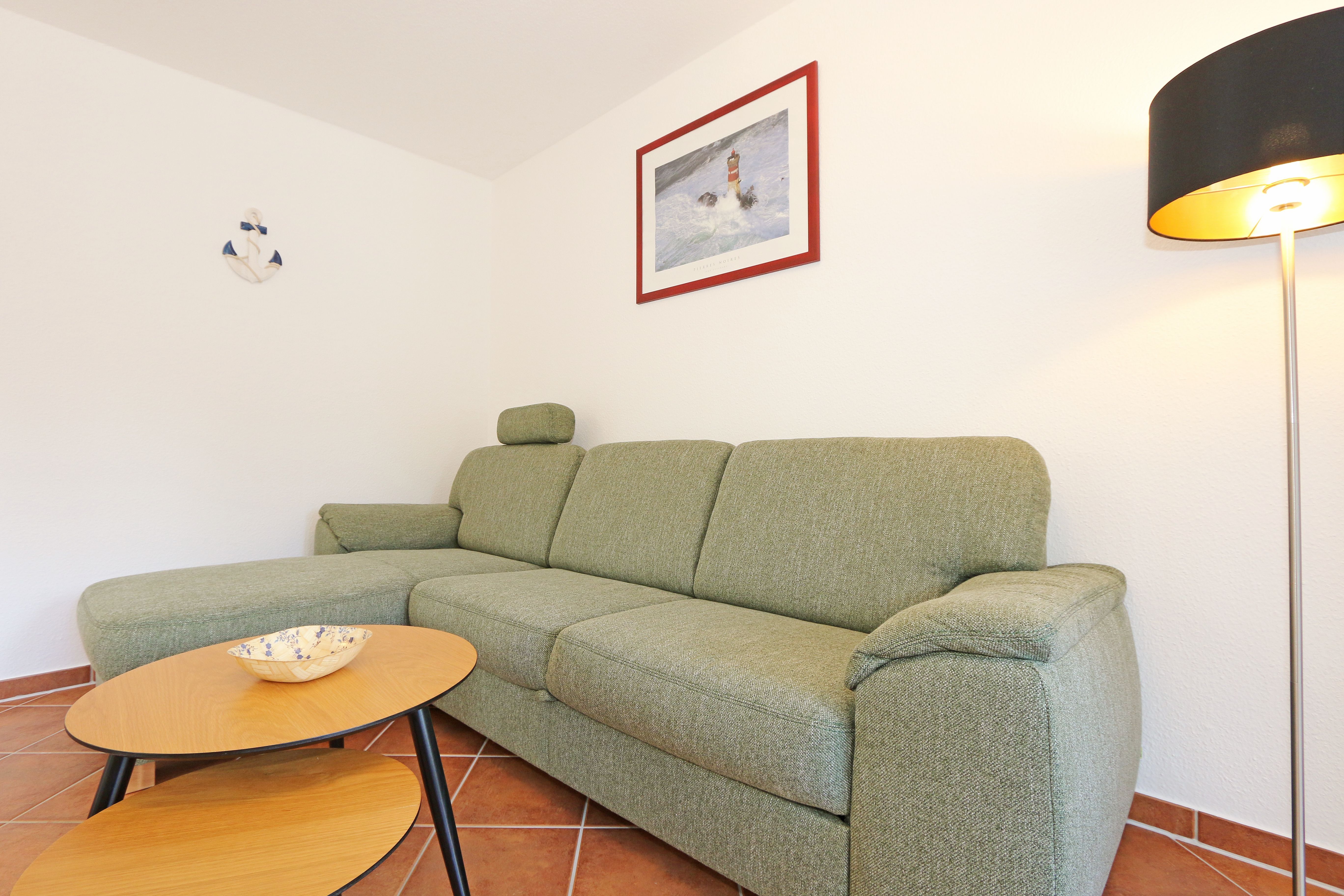 Die gemütlich eingerichtete und ruhig gelegene Nichtraucherwohnung mit ca. 55 m² und ist ideal für 2 bis max. 4 Personen geeignet. Die Wohnung 12 befindet sich in der 1. Etage. Der Wohnbereich besteht aus einem Smart-TV, Blue-Ray-Player und Mini-Stereo-Anlage, WLAN, einer Eck-Couch mit Ausziehfunktion für die 3./4. Person (1,15m x 2,20), Couchtisch, einen Ohrensessel mit Hocker, Leselampe sowie einen Esstisch mit 4 Stühlen. Angrenzend zum Wohnbereich finden Sie eine offene Küchenzeile. Diese verfügt über diverse Küchenhelfer wie zum Beispiel einem Ceranfeld mit Backofen, Kühlschrank, Geschirrspüler, Mikrowelle, Wasserkocher, Toaster, Kaffeemaschine, Pad-Maschine (Senseo) und weitere Küchenutensilien. Vom Wohn- und Essbereich aus haben Sie jeweils einen Zugang zum Balkon die beide bestuhlt sind und zusätzlich einen Sonnenschirm und eine Sonnenliege bietet. Das separate Schlafzimmer mit bodentiefen Fenstern ist mit einem Boxspringbett (1,80 m x 2,00 m), Nachttischkonsolen und einem Kleiderschrank ausgestattet. Auch vom Schlafzimmer können Sie auf den östlichen Balkon gelangen. Im innenliegenden Badezimmer runden eine Dusche, WC, Fön und ein Waschtisch den Bereich ab. Alle Räumlichkeiten sind gefliest, außer das Schlafzimmer, in dem Laminat verlegt ist. Insektenschutzgitter befinden sich zusätzlich in allen Räumlichkeiten. Ein PKW-Stellplatz (7B/12) ist für Sie reserviert und befindet sich hinter dem Haus. Für Ihre geliehenen oder auch mitgebrachten Fahrräder ist eine abschließbare Unterstellmöglichkeit vorhanden. Für unsere kleinen Gäste sind 1x Kinderreisebett (ohne Matratze und Bett Inlett) sowie 1x Hochstuhl inklusive. Haustiere nicht erlaubt. Die Erstausstattung eines Wäschepaketes (komplette Bettwäsche, 1 Duschhandtuch, 2 kleine Handtücher) können Sie bis 14 Tage vor Anreise gegen einen Aufpreis dazu buchen oder durch eigene ergänzen. Ab 2 gebuchten Paketen erhalten Sie einmalig 1 Geschirrhandtuch und 1 Duschvorleger hinzu.