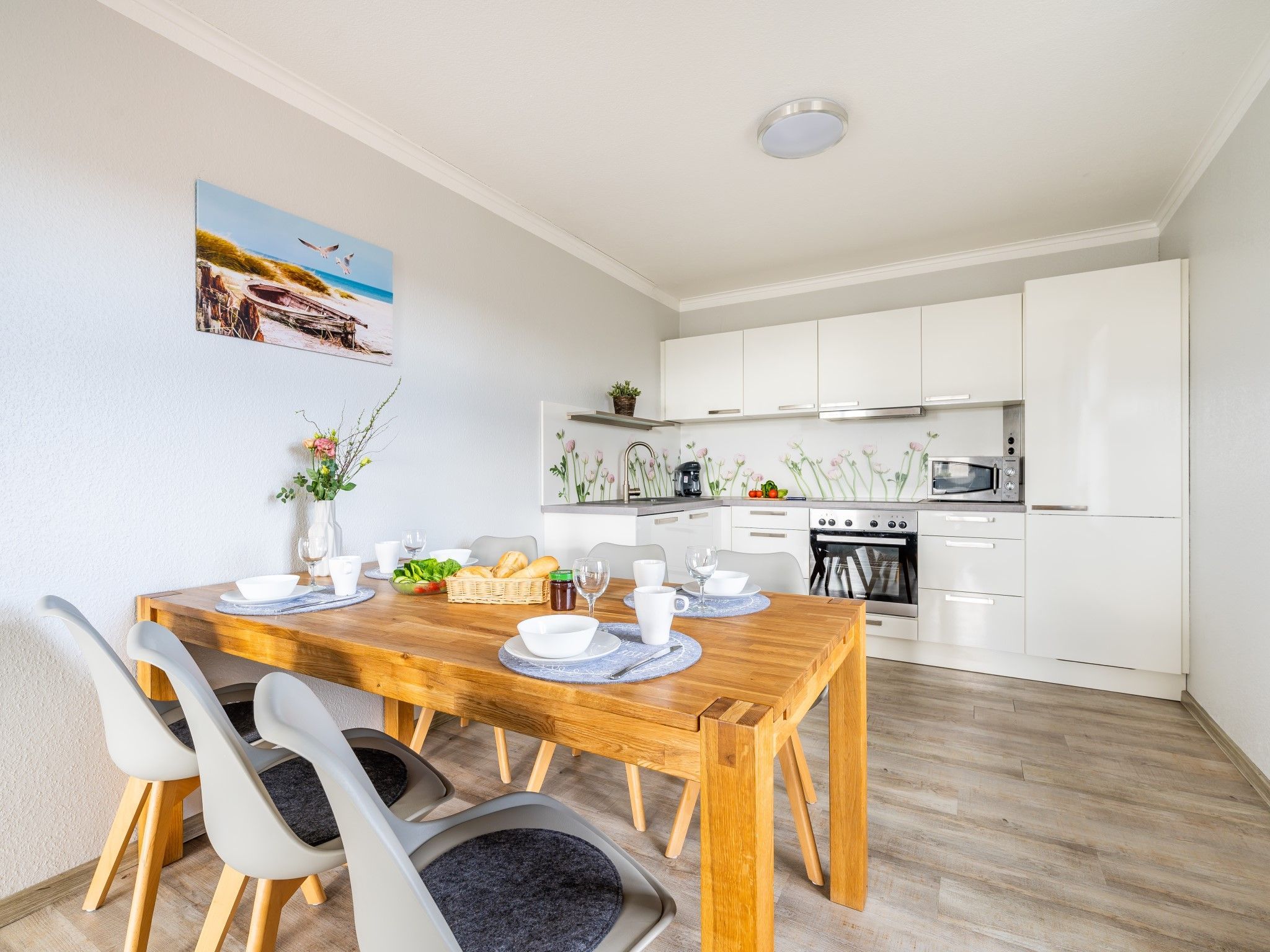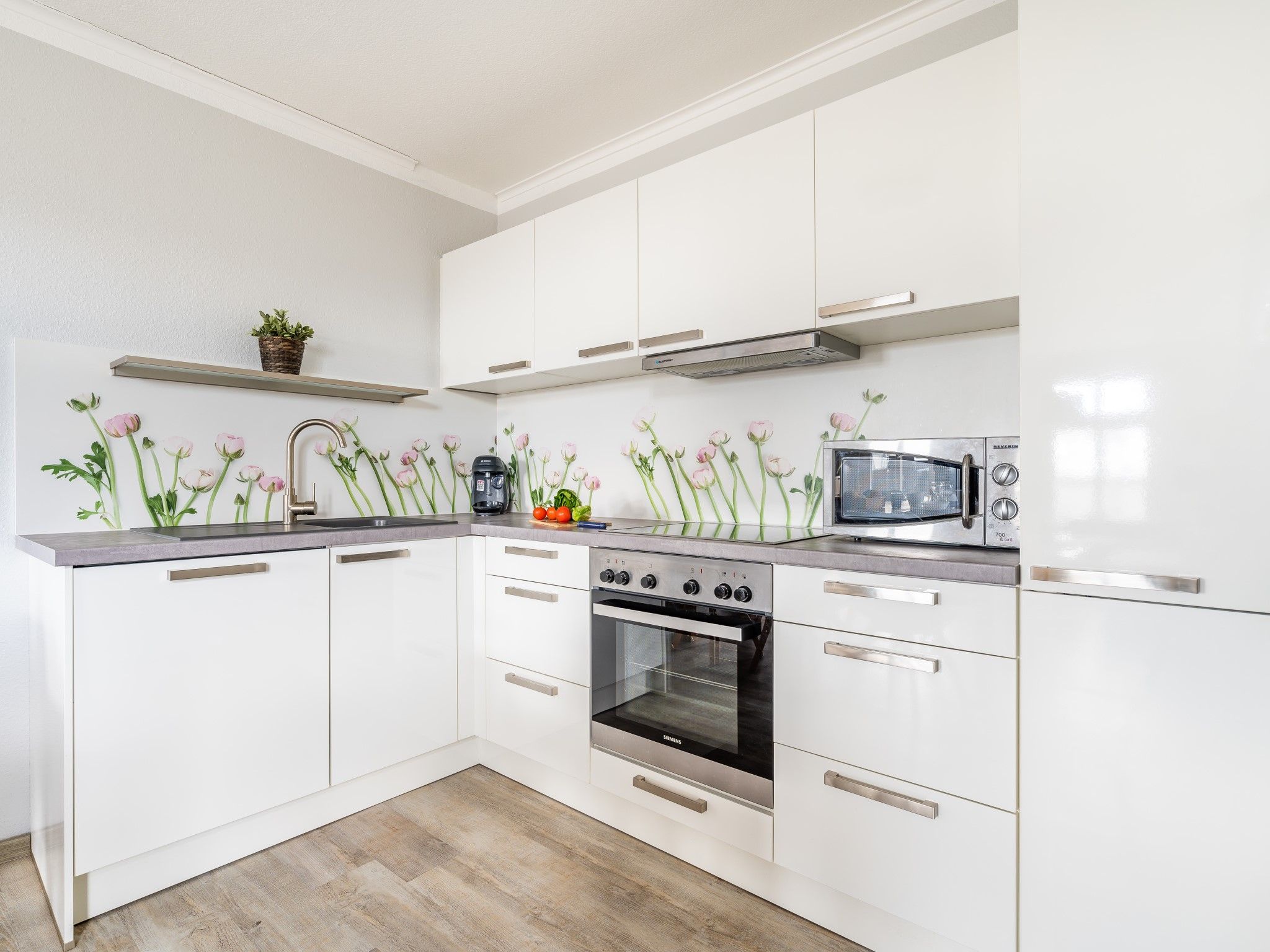 • komplett eingerichtete Küche mit Geschirrspüler, Mikrowelle, Backofen, Essplatz, Wäscheständer