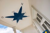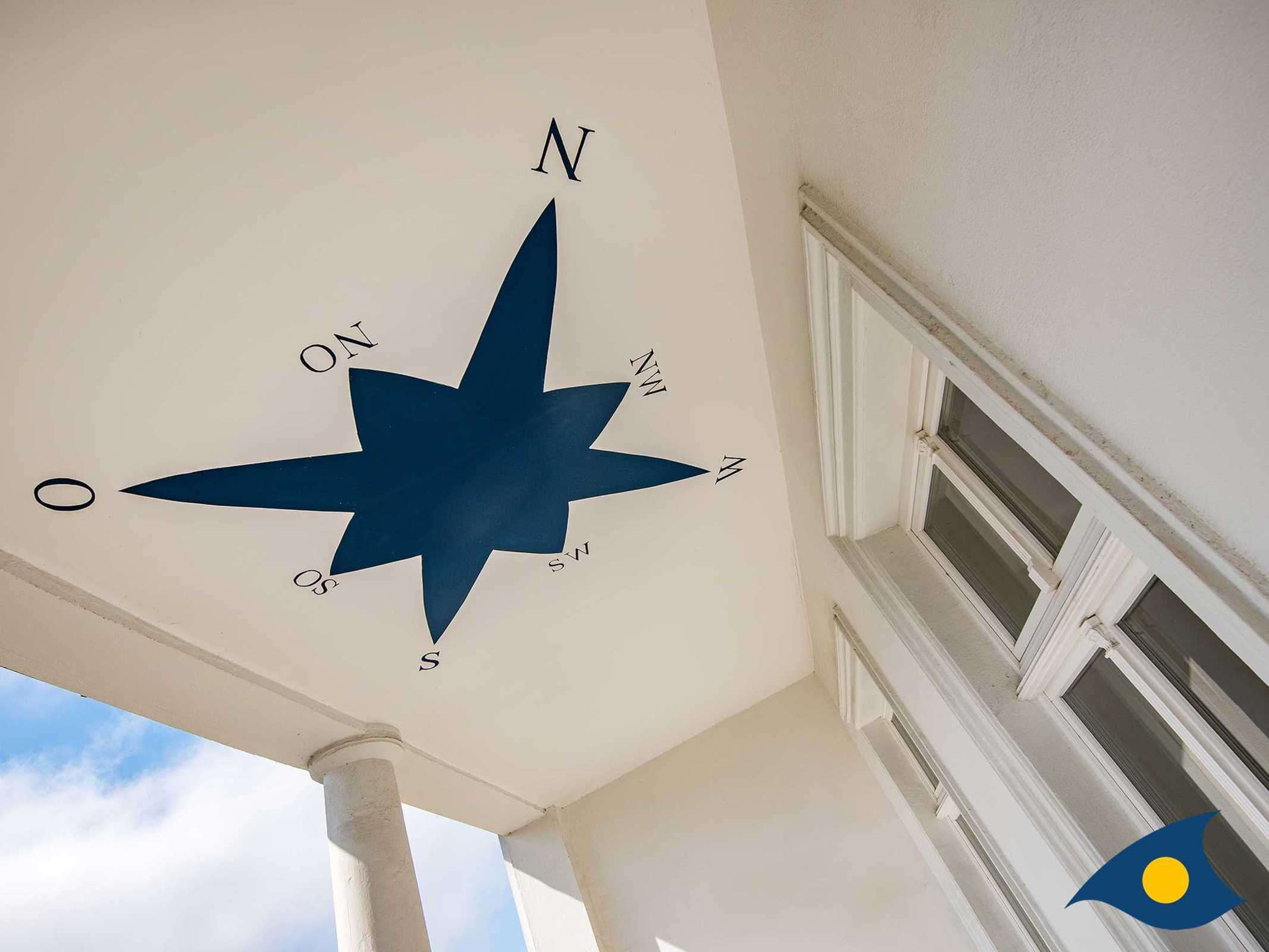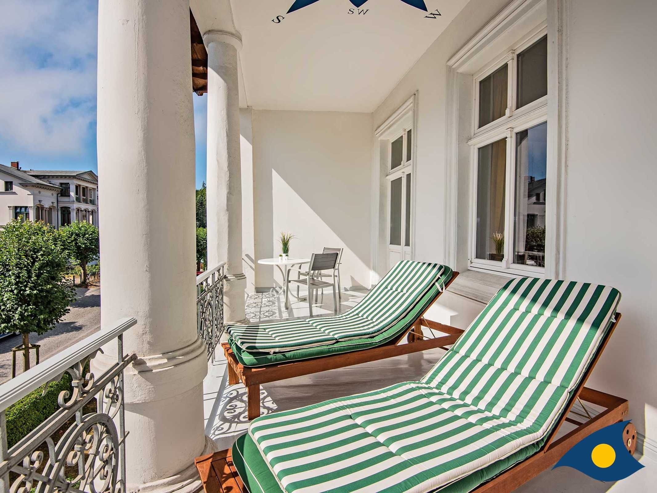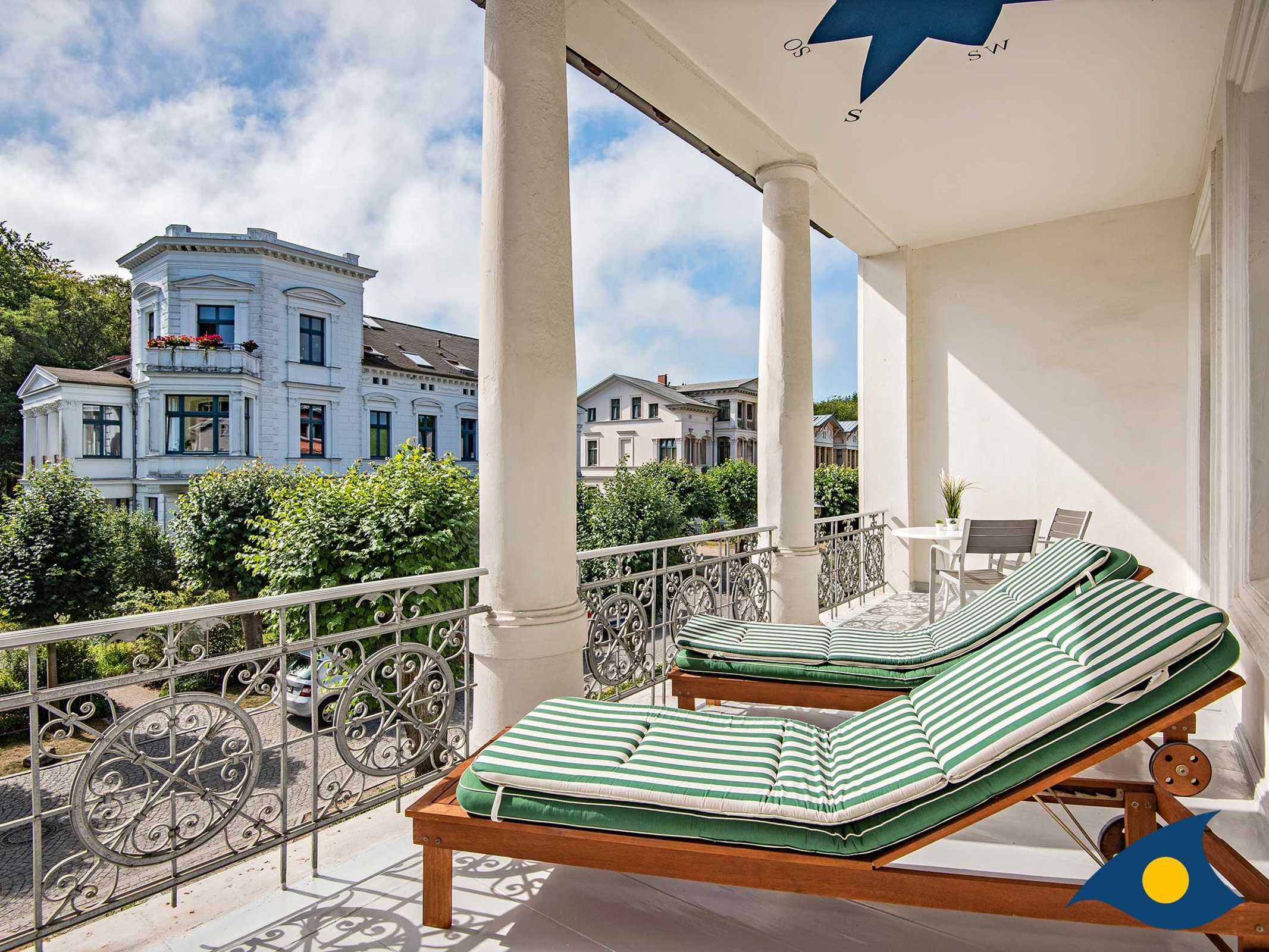 Der große überdachte Balkon misst 8 x 2,5 m und wird durch unsere Gäste in den warmen Monaten als zusätlicher Wohnraum genutzt. Hier ist genügend Platz für einen weitern Essplatz und 2 Sonnenliegen und Sonnenschirm. Die Bemalung an der Balkondecke ist schon von weitem zu sehen.