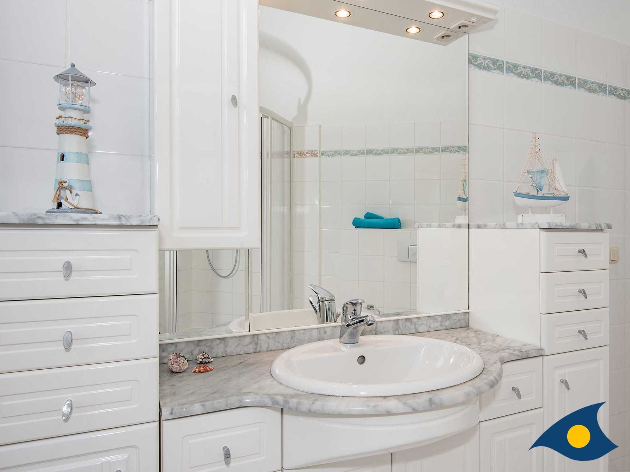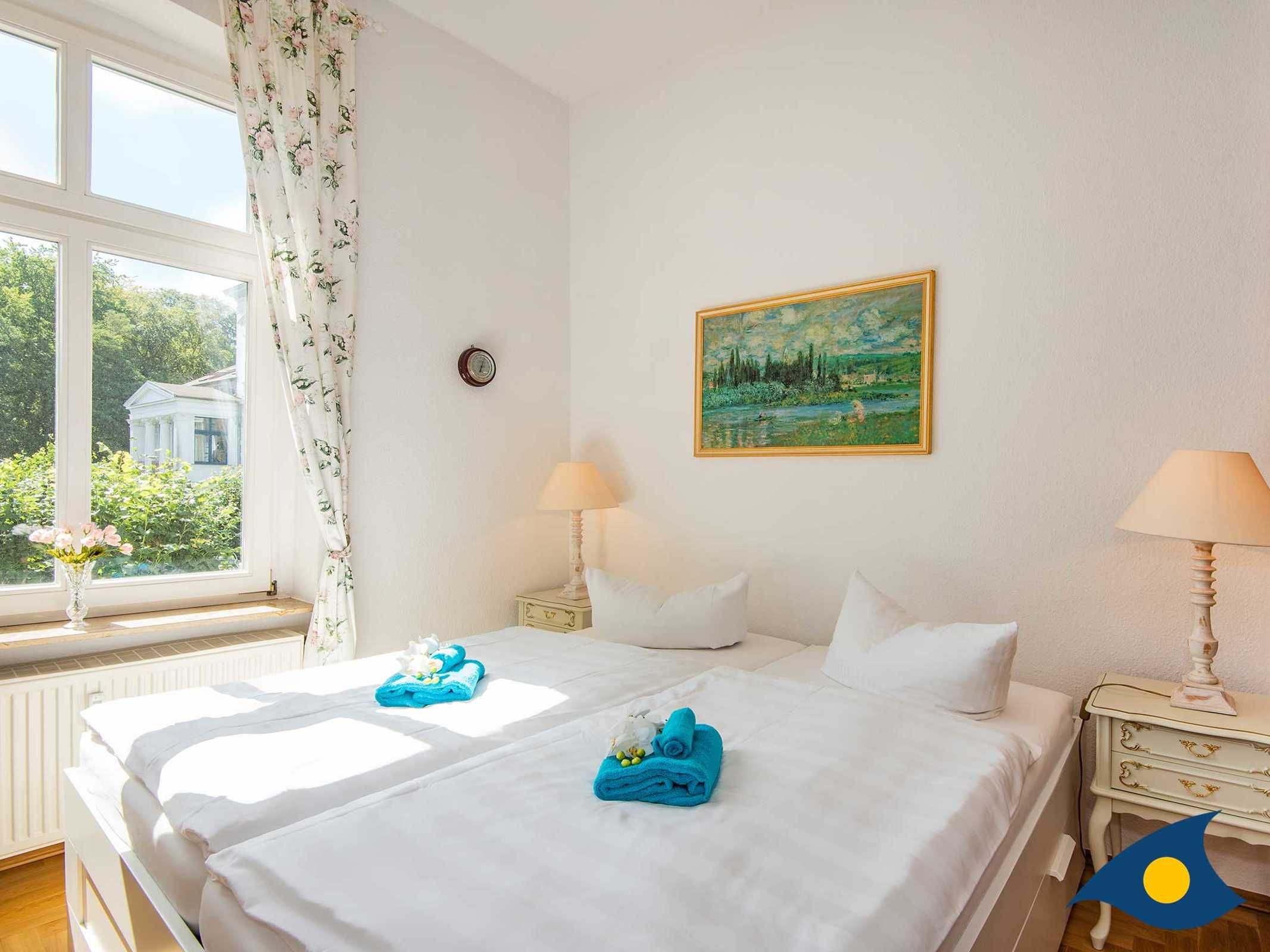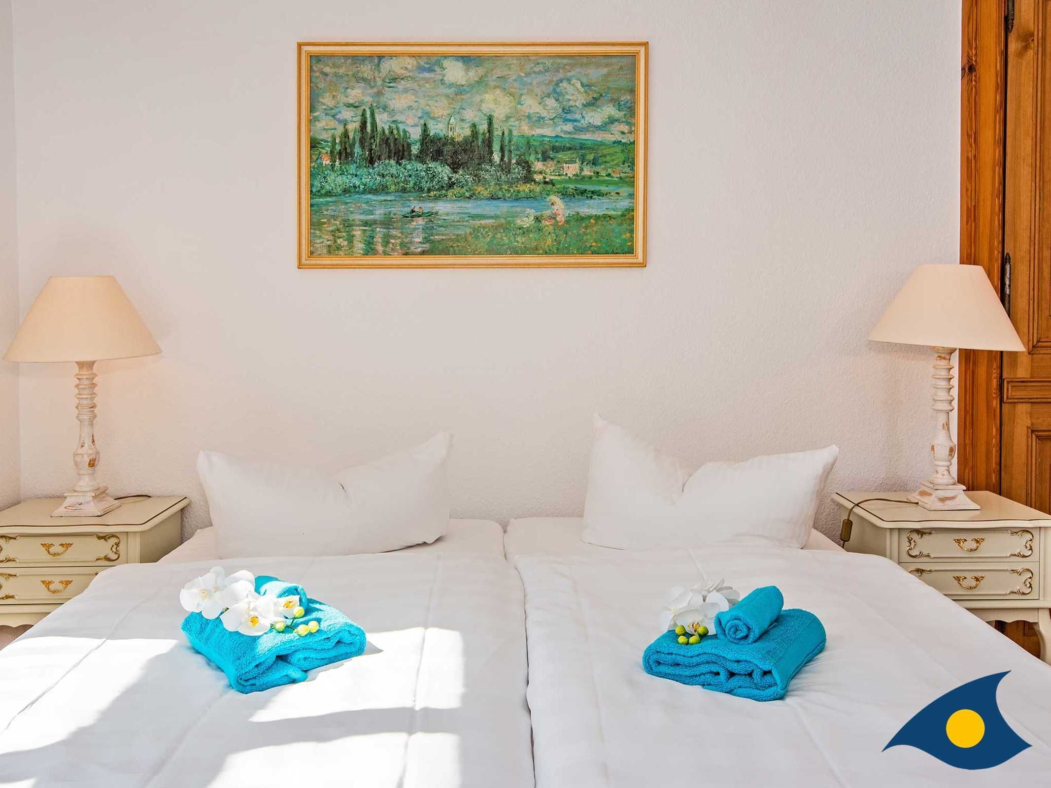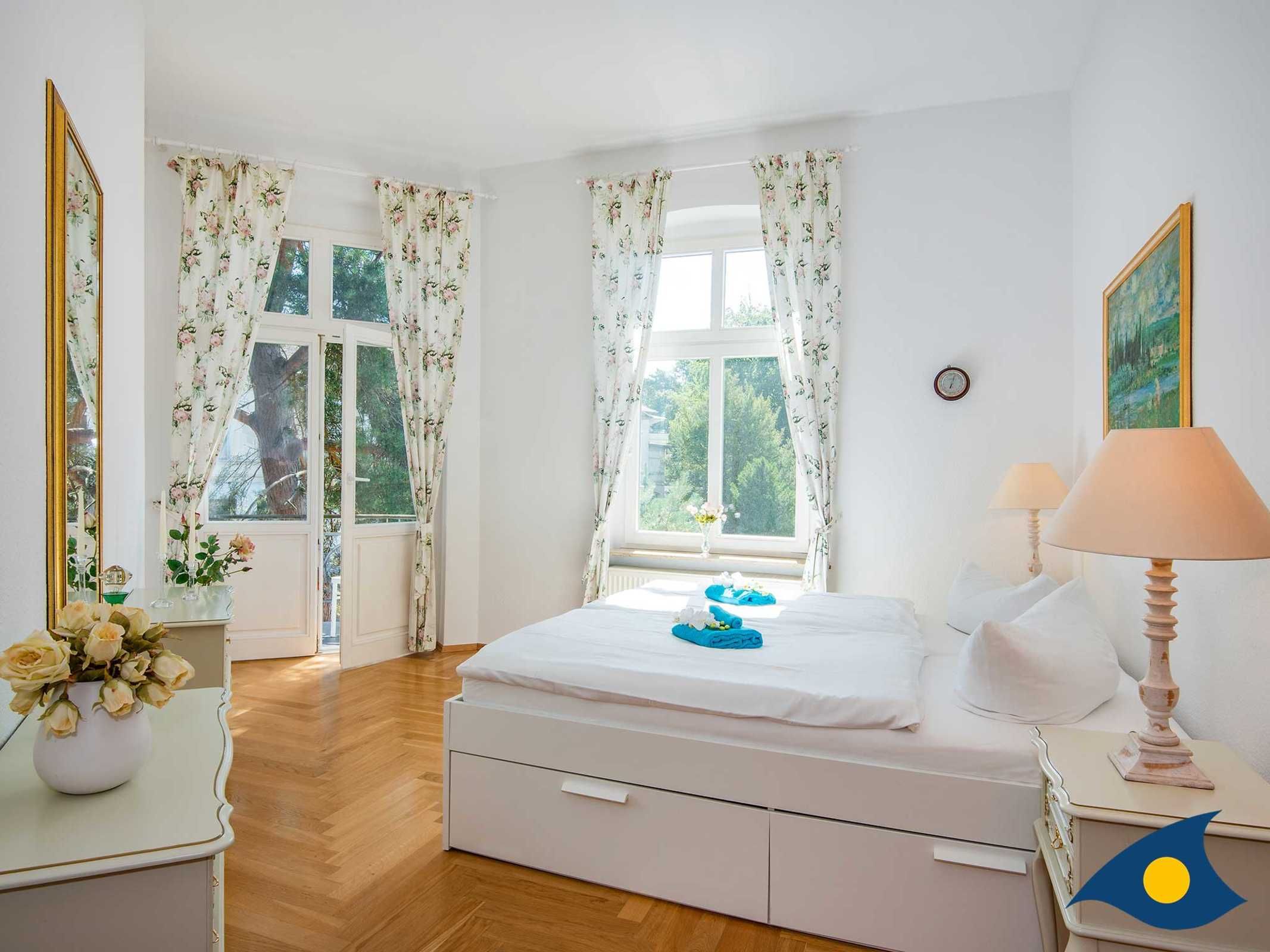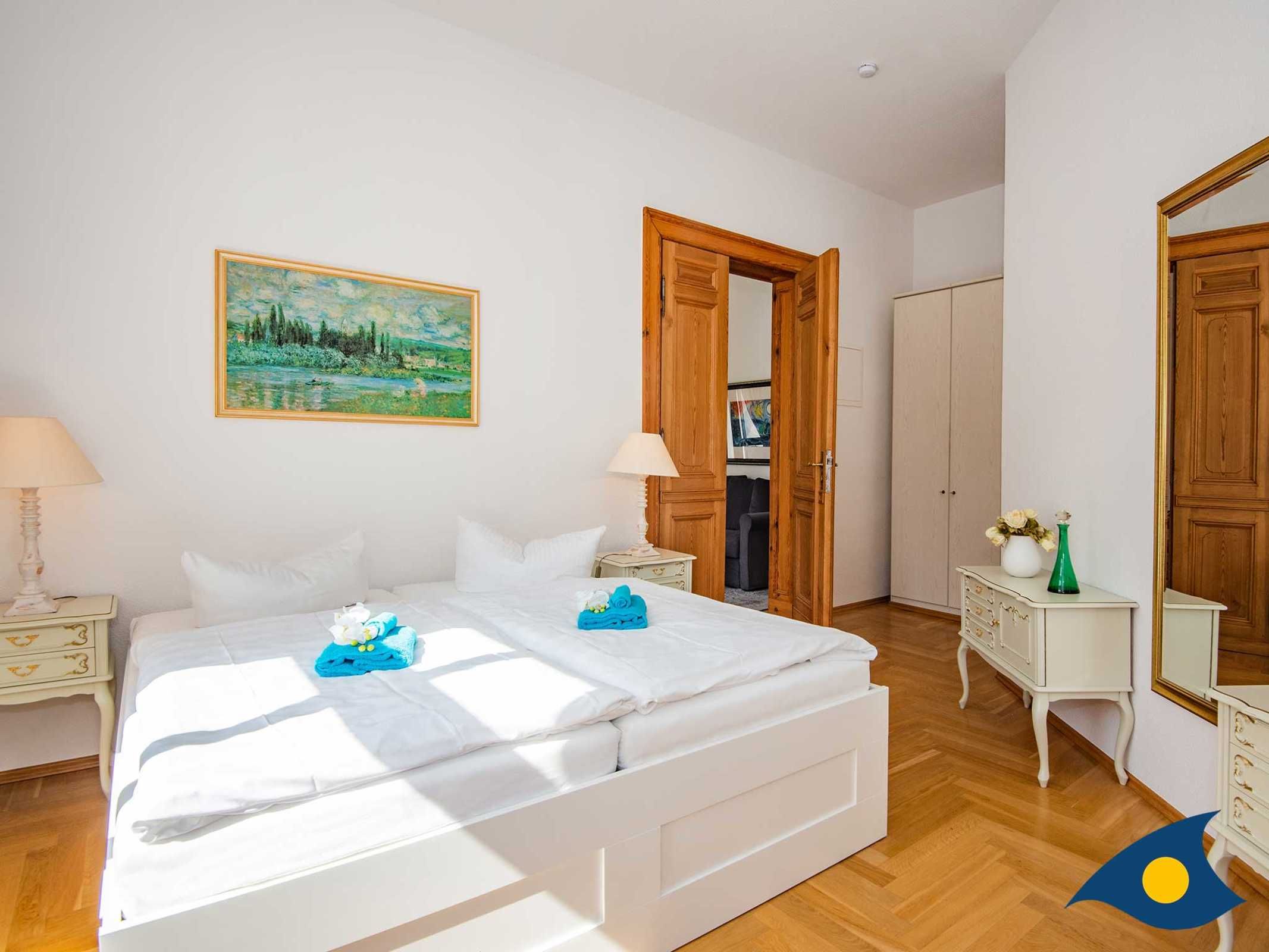 Das Schlafzimmer erreichen Sie über zwei Doppeltüren. Das große Doppelbett lädt zu erholsamen Nächten ein und die Schränke bietet genügend Platz für Ihre Urlaubsgarderobe. Der angrenzende kleine Balkon wird gerne als zusätzlicher Rückzugsort genutzt.